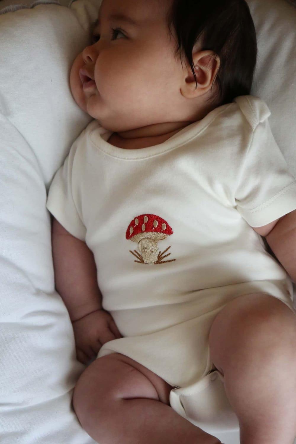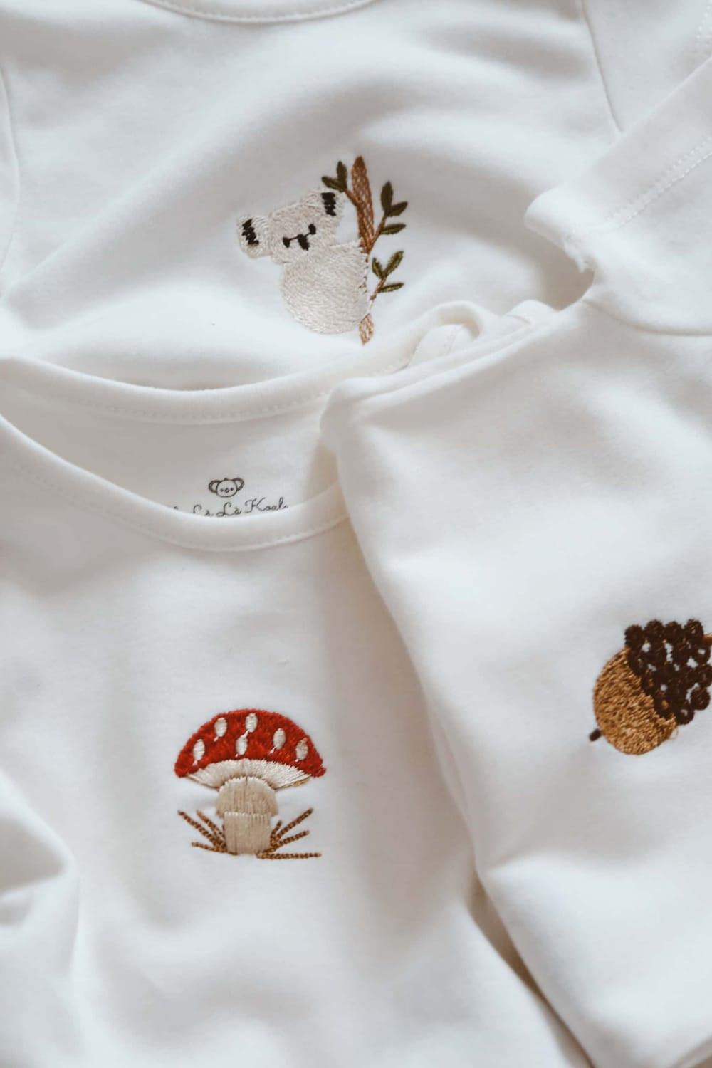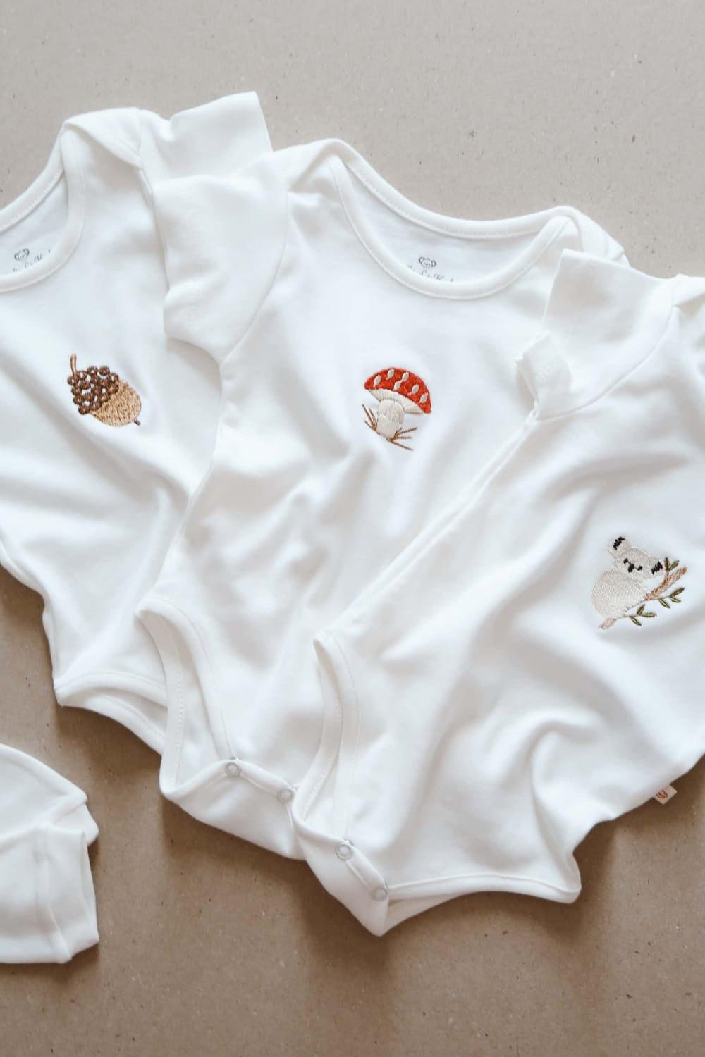 - The package content consists of 3 embroidered bodysuits with snap fasteners: Mushroom, Acorn and Koala.