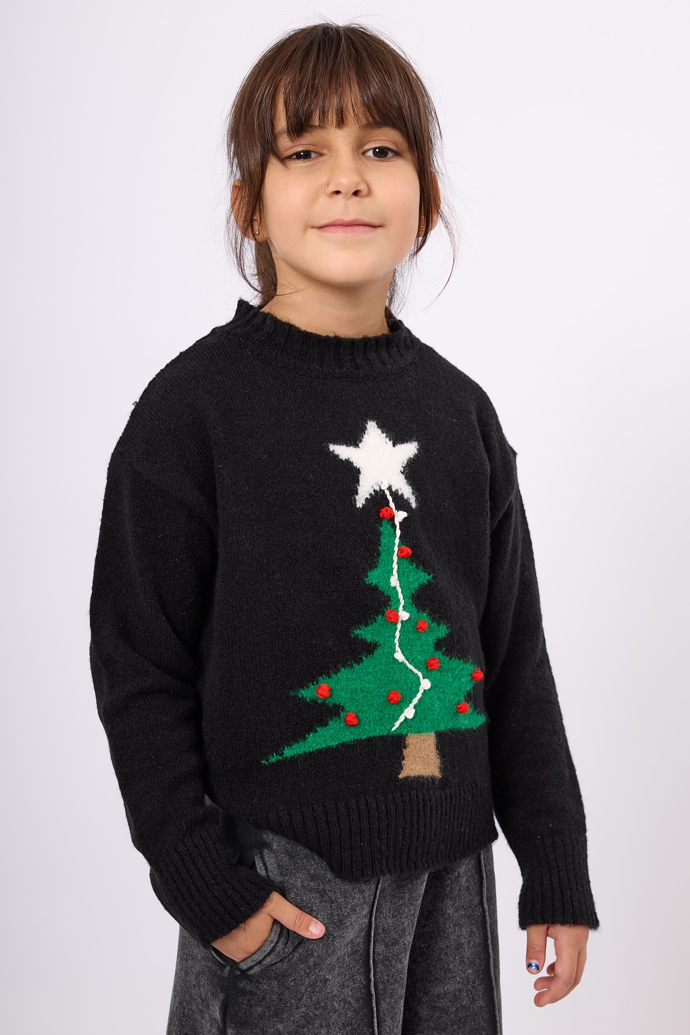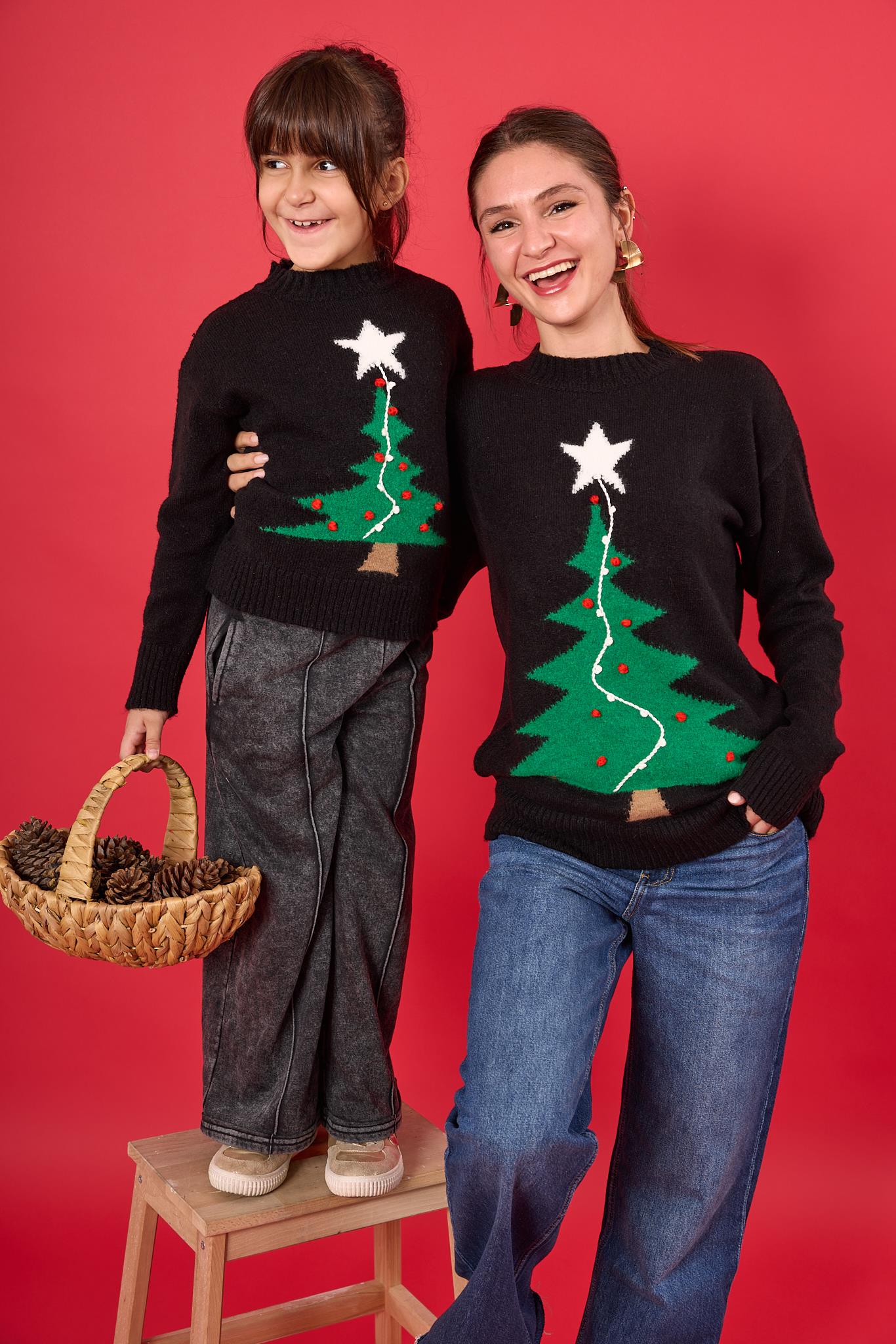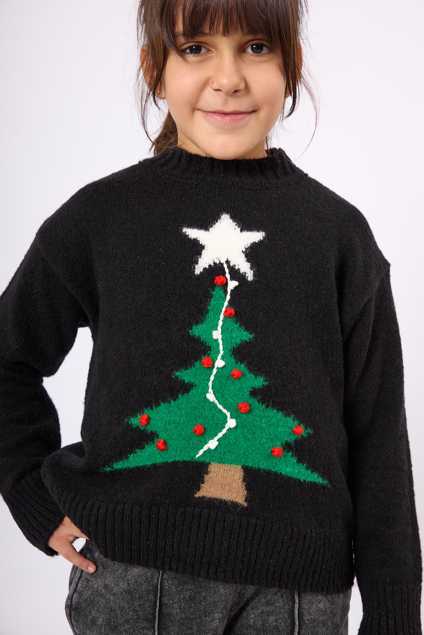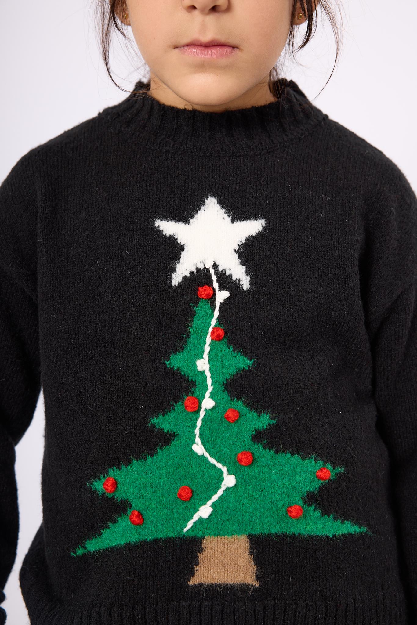 Happy Times Çam Ağacı Desenli Çocuk Yılbaşı Kazağı Siyah/Yeşil