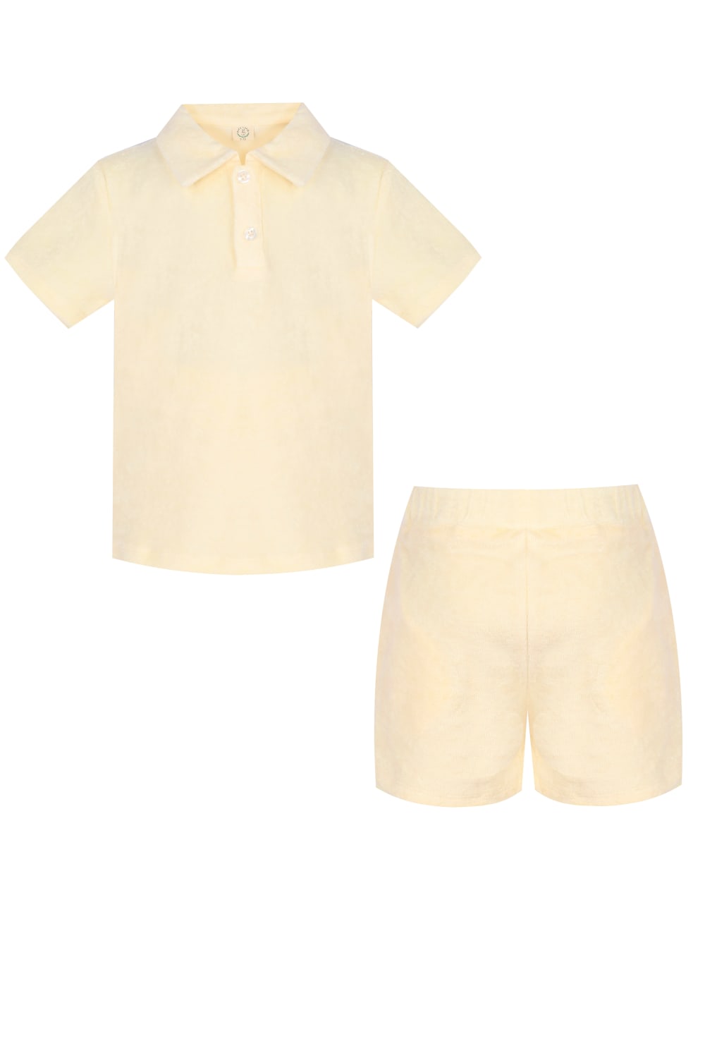 Bu krem rengi havlu kumaş şortlu çocuk takımı, yaz günlerinde plajda veya günlük giyimde rahatlıkla kullanabileceğiniz şık ve fonksiyonel bir seçenektir. Çocuğunuzun gardırobuna stil ve konfor katmak için bu takımı tercih edebilirsiniz.