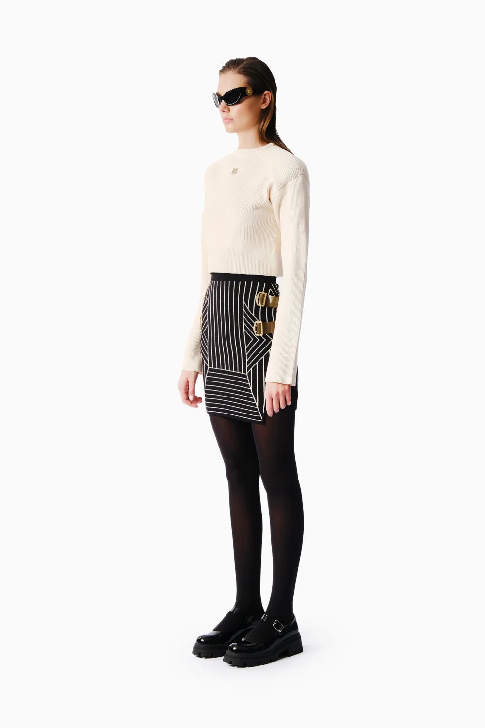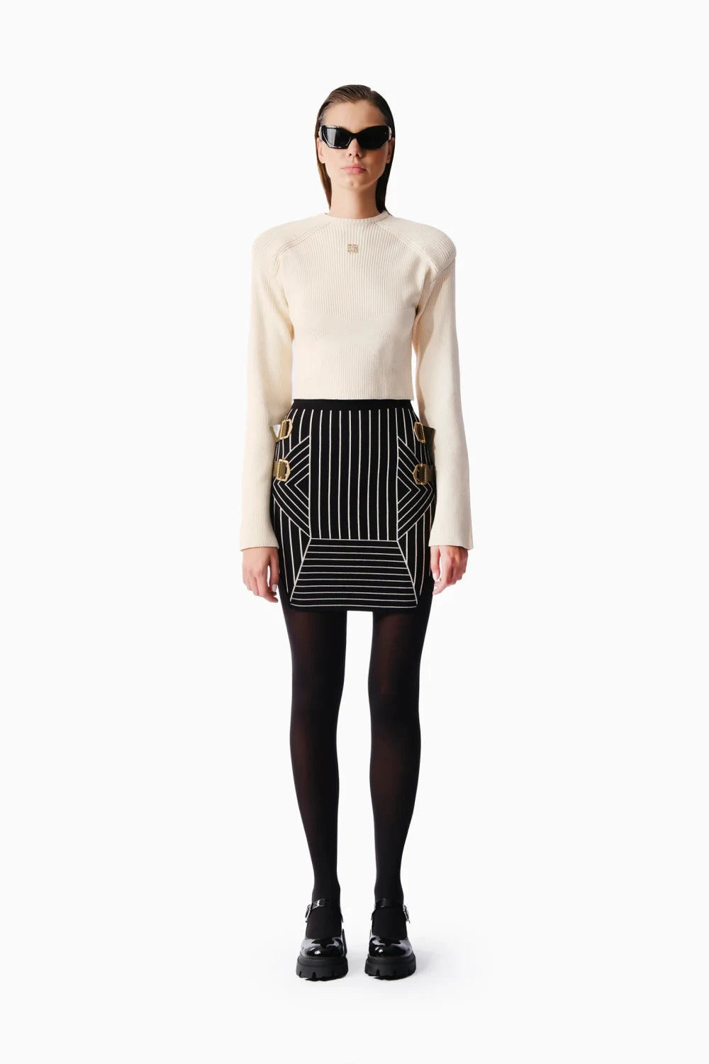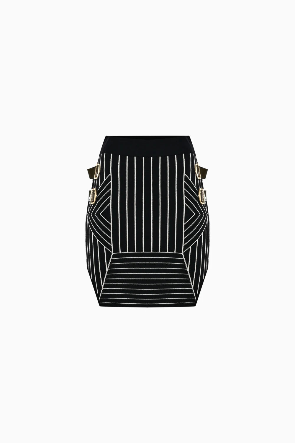 Geometrik çizgili, her iki yanda deri kemerli toka detaylı, elastik bel bantlı mini etek.