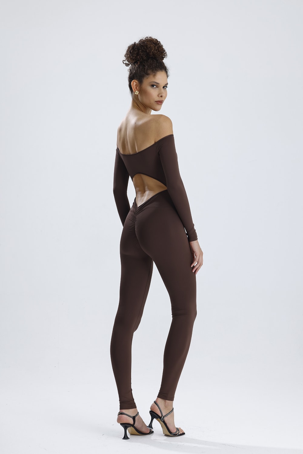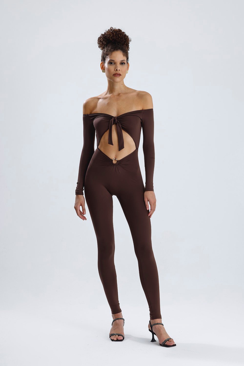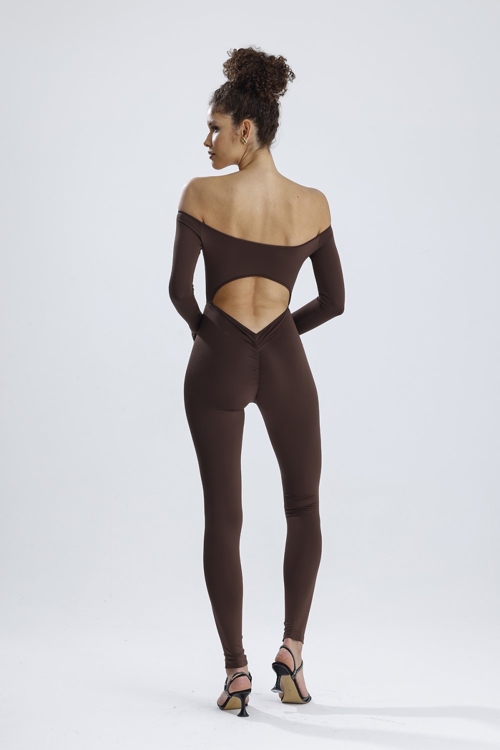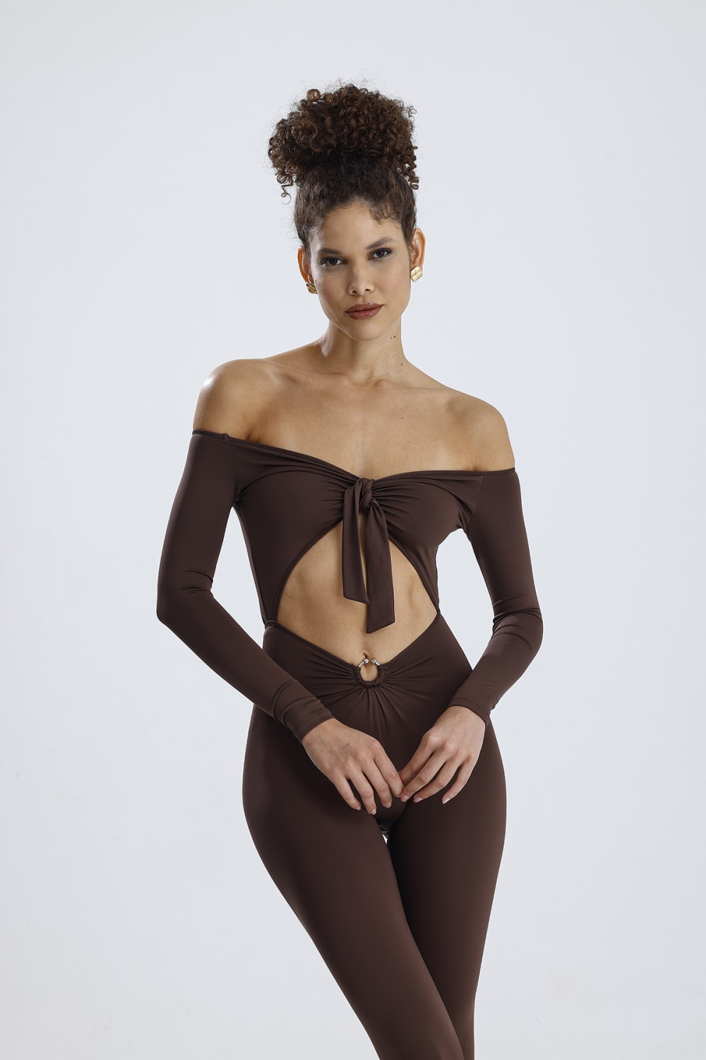 Vücut hatlarını cesurca ortaya çıkaran bu kahverengi tulum, düşük omuz kesimi ve göbekte yer alan halka aksesuar detayıyla dikkat çekiyor.