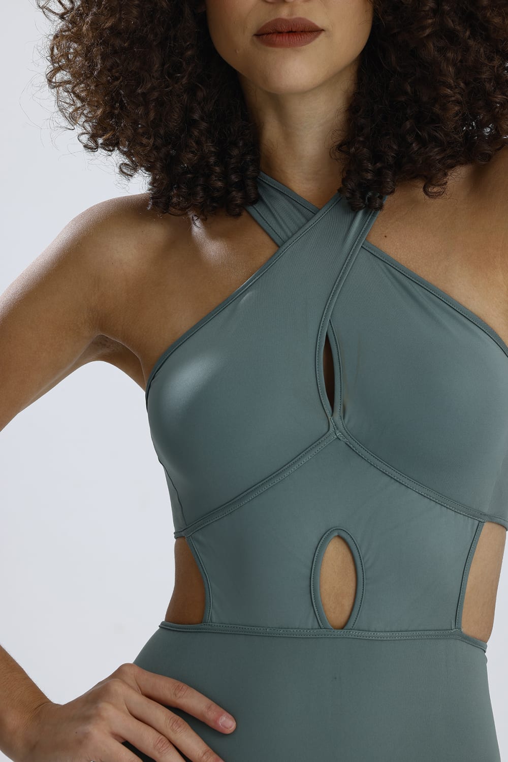 Göğüs ve bel detayları, Vücuda oturan kesim ve esnek kumaş, halter yaka kesim.