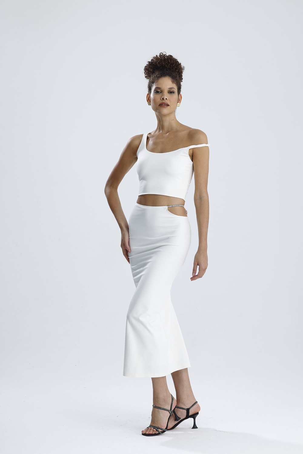 Vücuda oturan yüksek belli maxi etek, bel kısmında taş detaylı zincir aksesuar, rahat ve esnek kumaş yapısı.