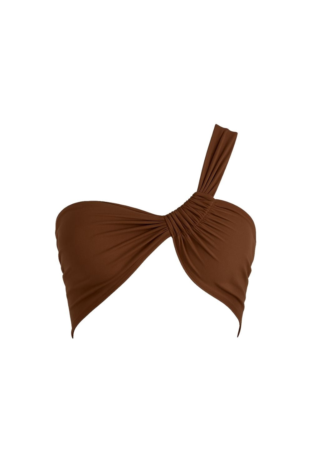 Velvet kahverengi tek omuzlu drape detaylı crop top.
