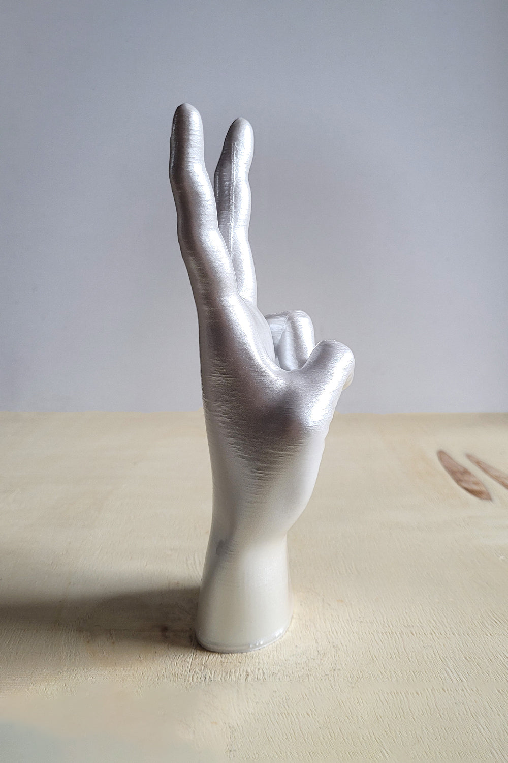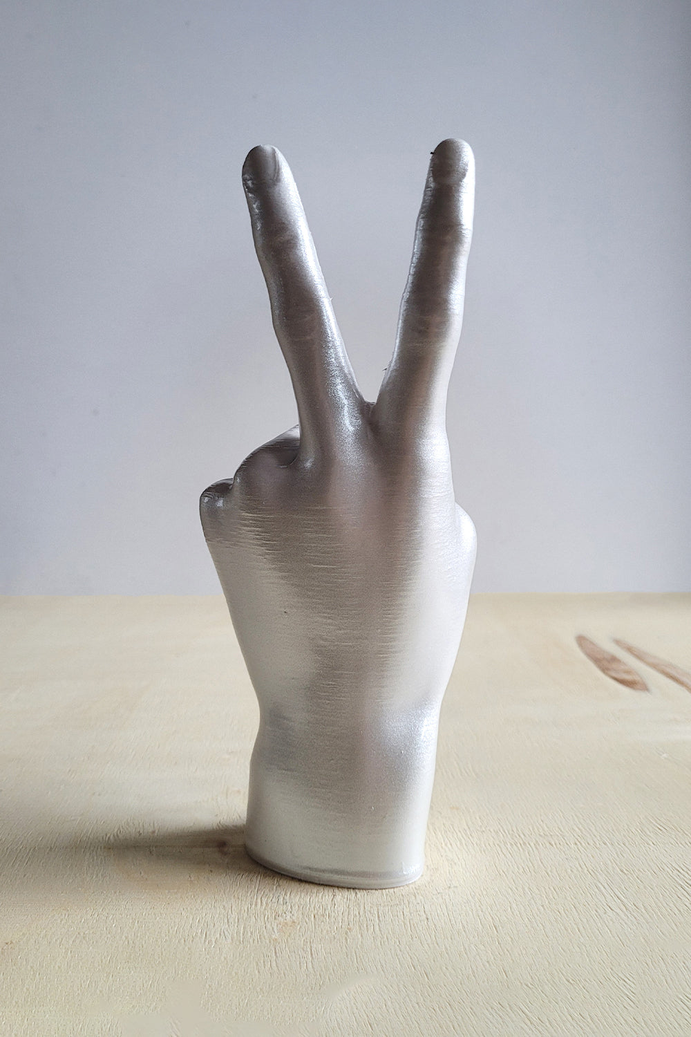 Bu özel "Peace" el heykeli, 3D baskı teknolojisi ile PLA biyopolimerden üretilmiş ve ardından el işçiliğiyle özenle tamamlanmıştır.