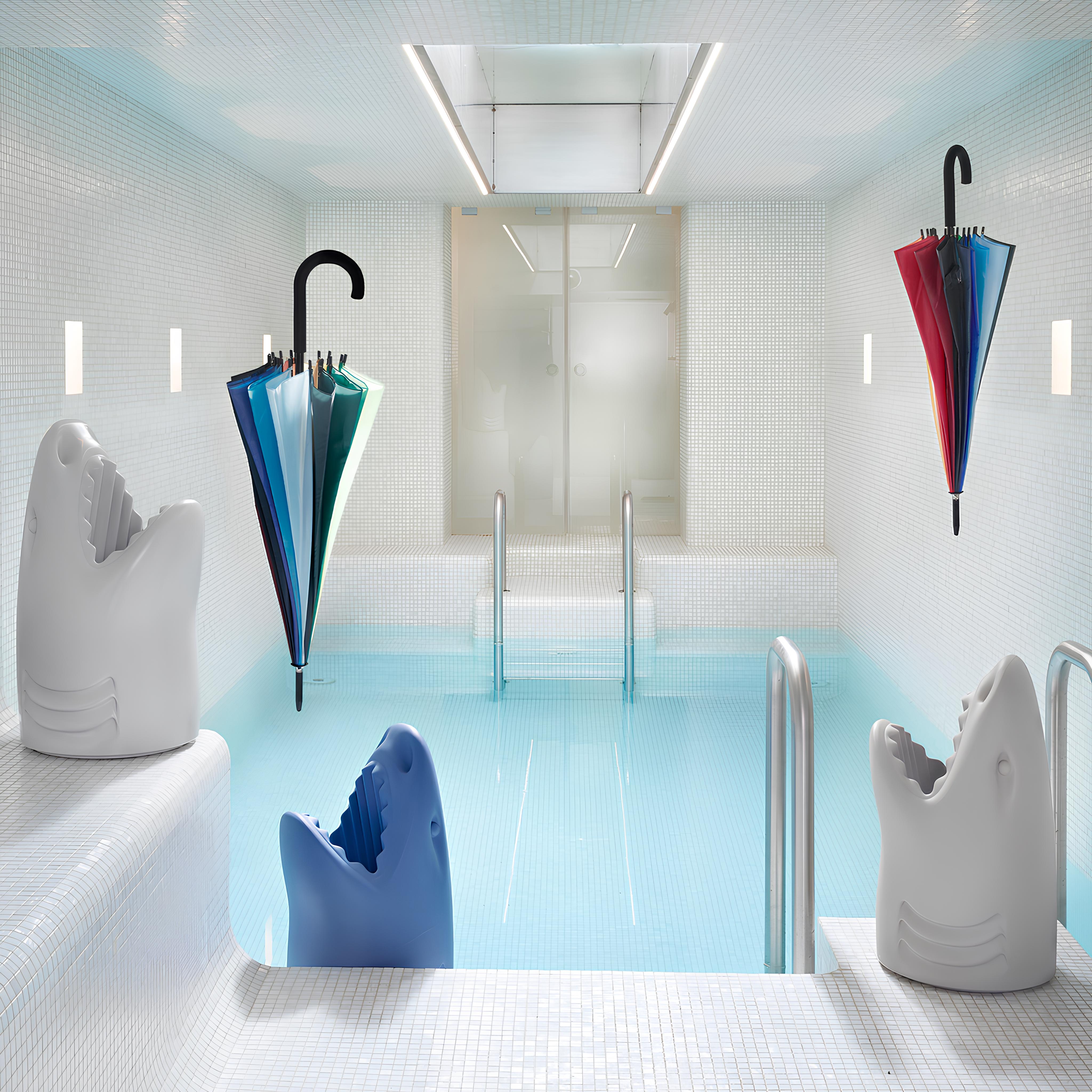 Tüm köpekbalıklarının vahşi bir ruha sahip olması gerektiğini kim söylüyor? Sevgili Bay Holder'ın durumu kesinlikle bu değil! Yüzme yetersizliğinden dolayı biraz perişan hissederek, Studio job'tan süper güçlerini kullanarak onu bir yaşam tarzı nesnesine dönüştürmesini ve her yerde olmasını istedi... denizden uzakta ve size yakın! Killer, şemsiye standı, kağıt sepet, şampanya soğutucu veya evde ve ötesinde başka herhangi bir kullanım olarak kullanılabilen bir köpekbalığı form tutacağıdır.