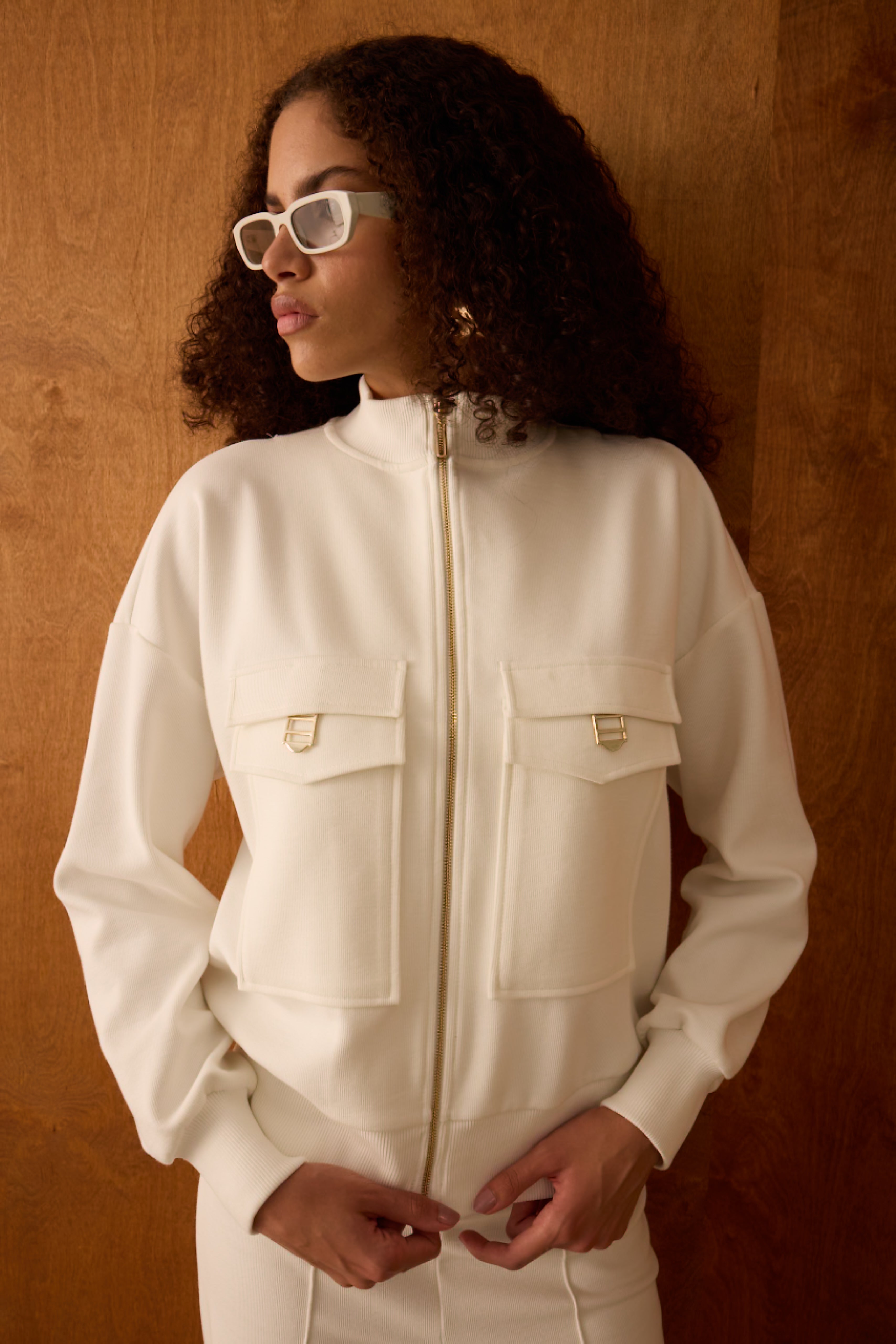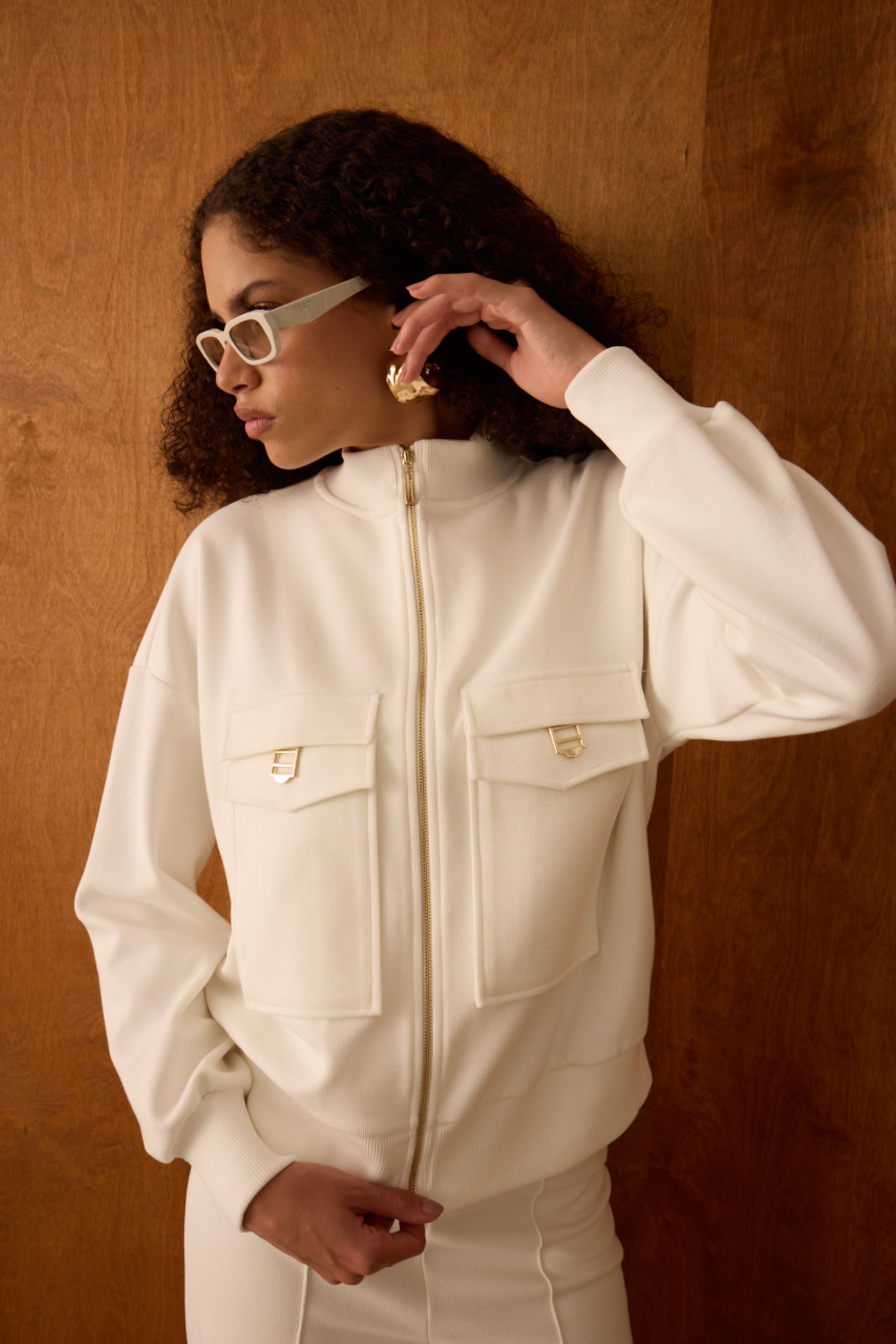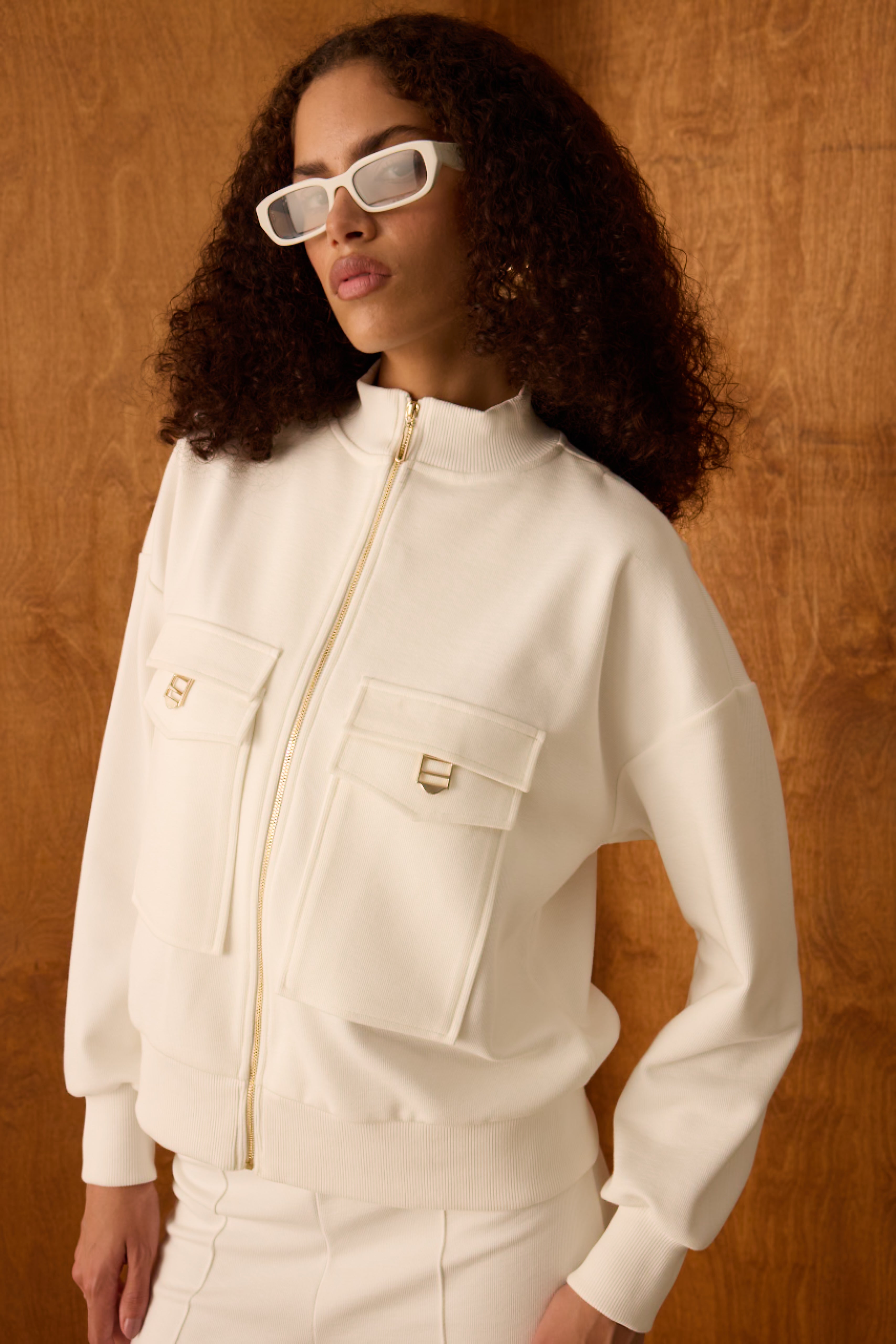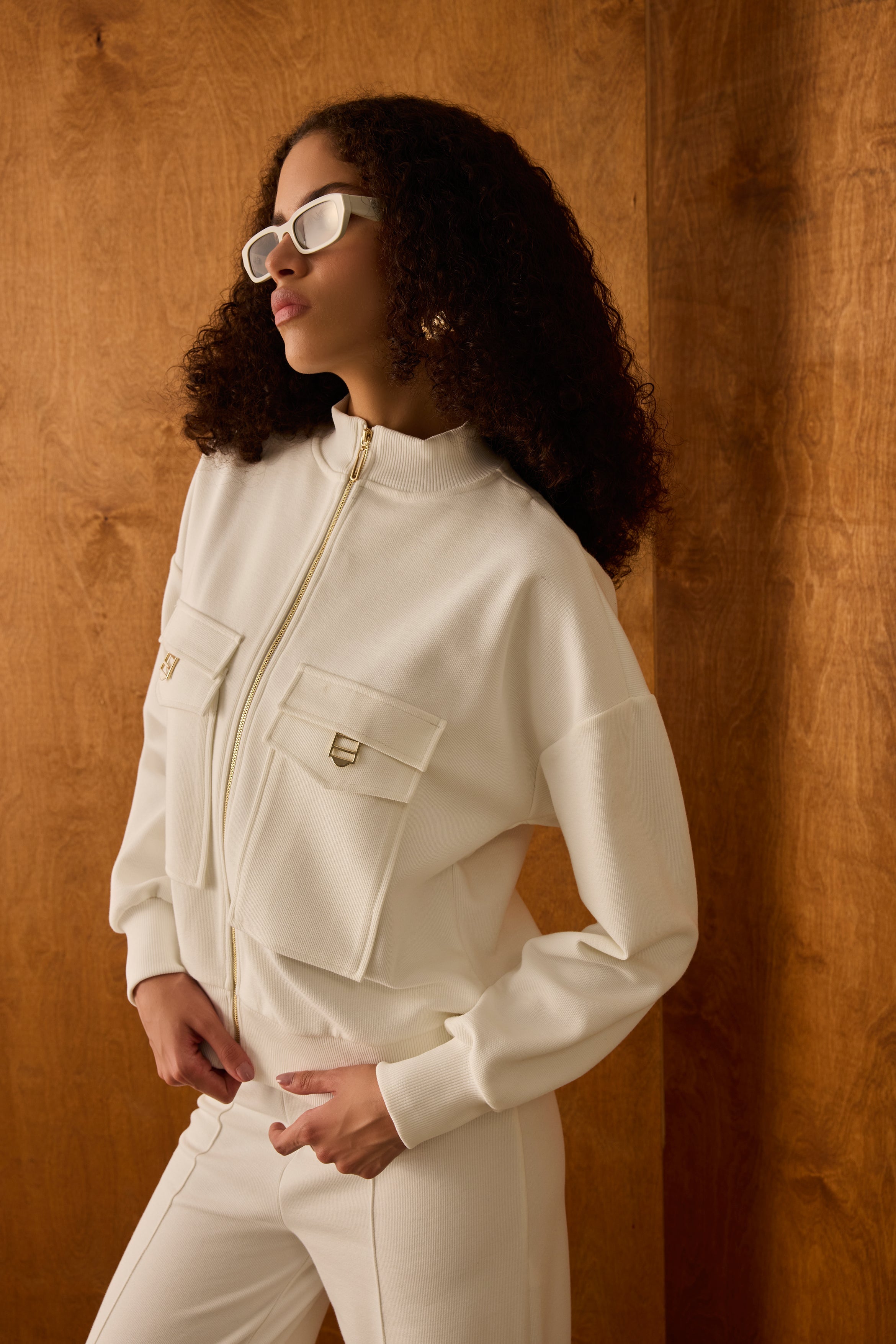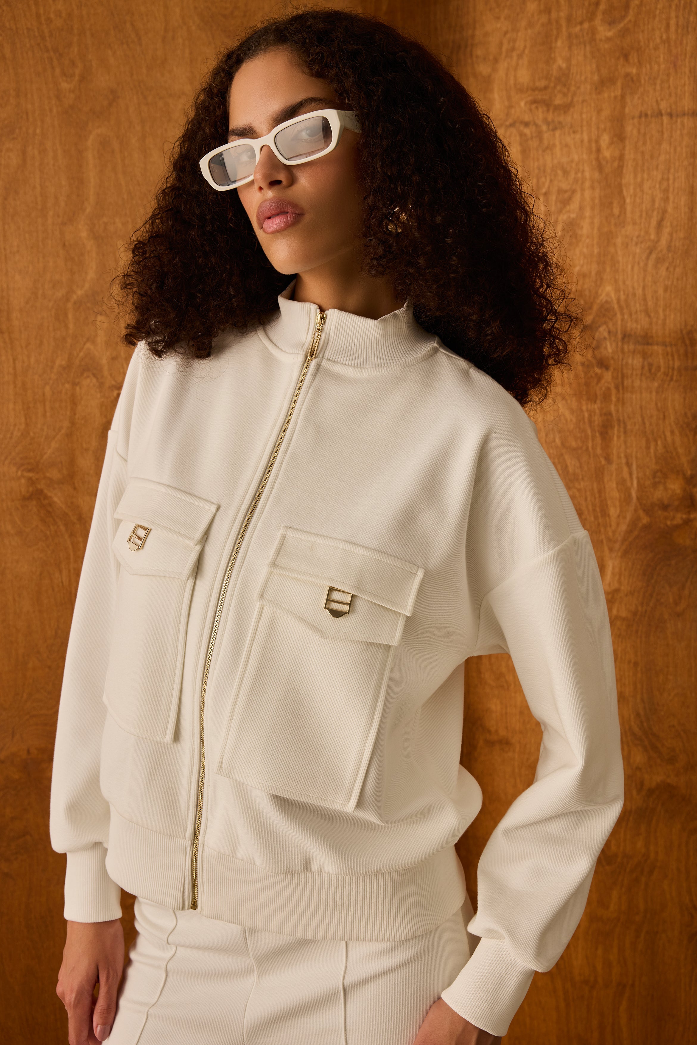Sportif ve şık detaylarıyla öne çıkan bu kadın bomber ceket, dik balıkçı yaka yapısı ve metal fermuar kapamasıyla güçlü bir duruş sergiler. Göğüs kısmındaki kapaklı cepler, metal aksesuar detaylarıyla tamamlanarak cekete modern bir dokunuş kazandırır.