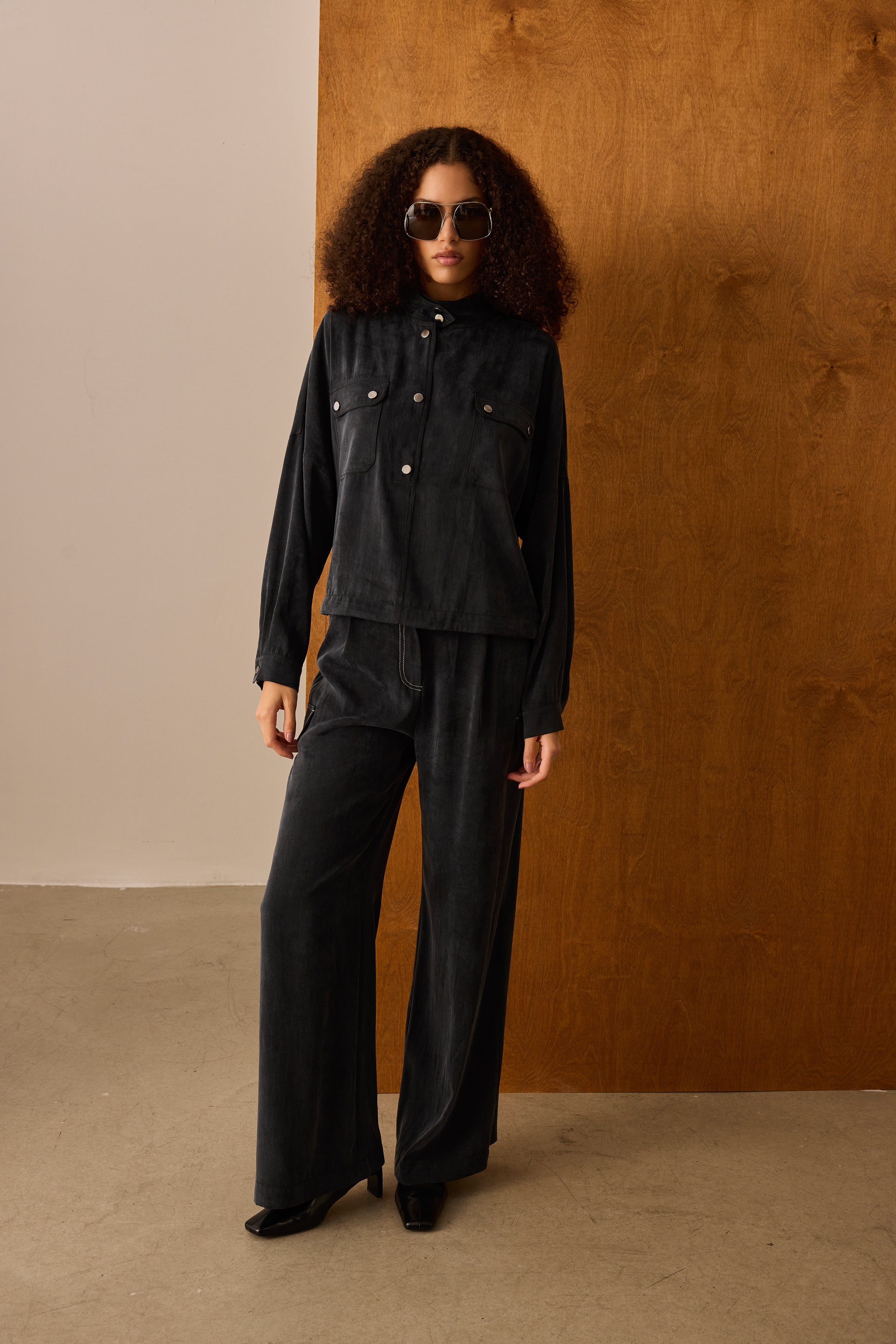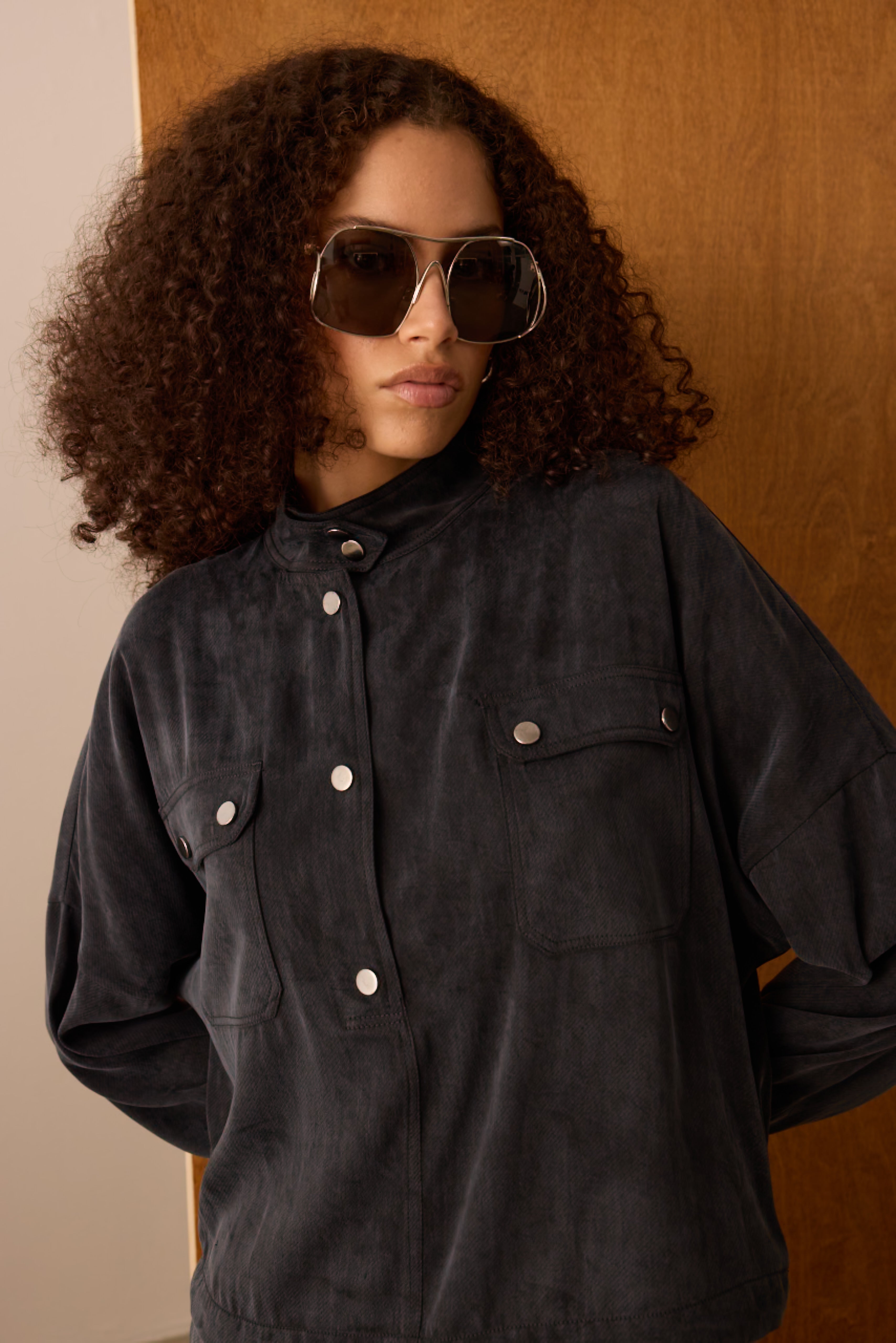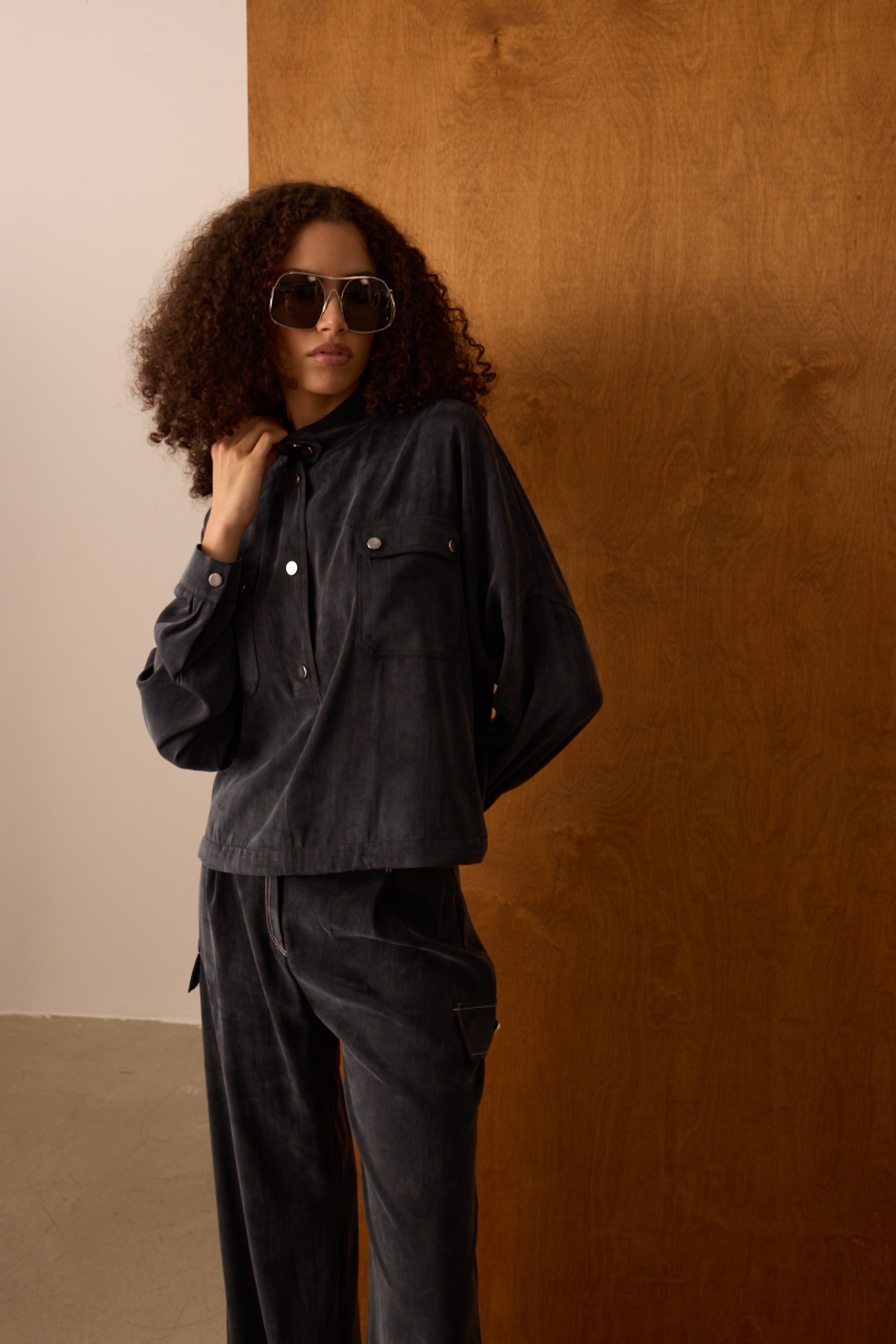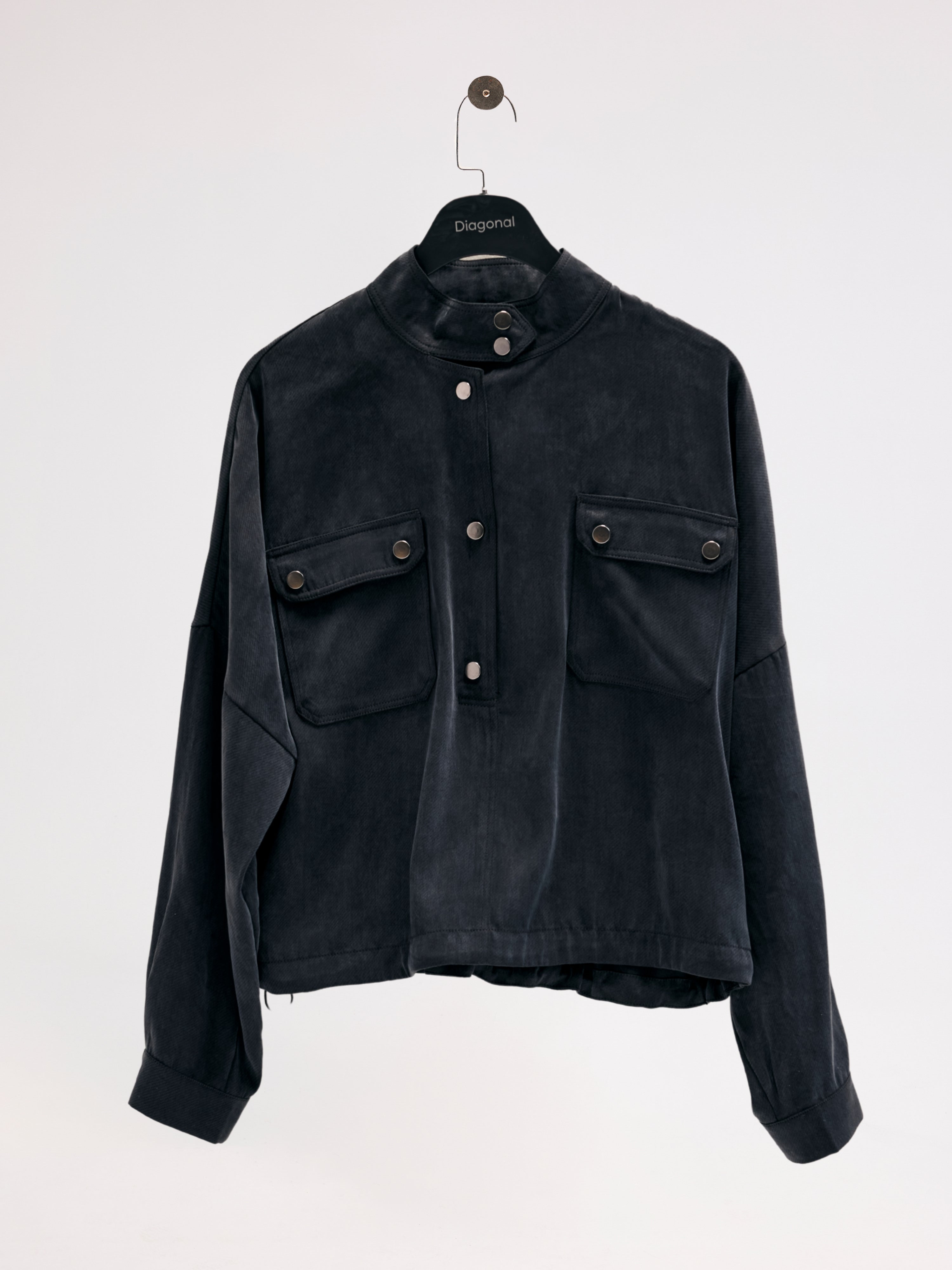 Detaylar: Hakim yaka, metal düğme, uzun kol, cep detaylı