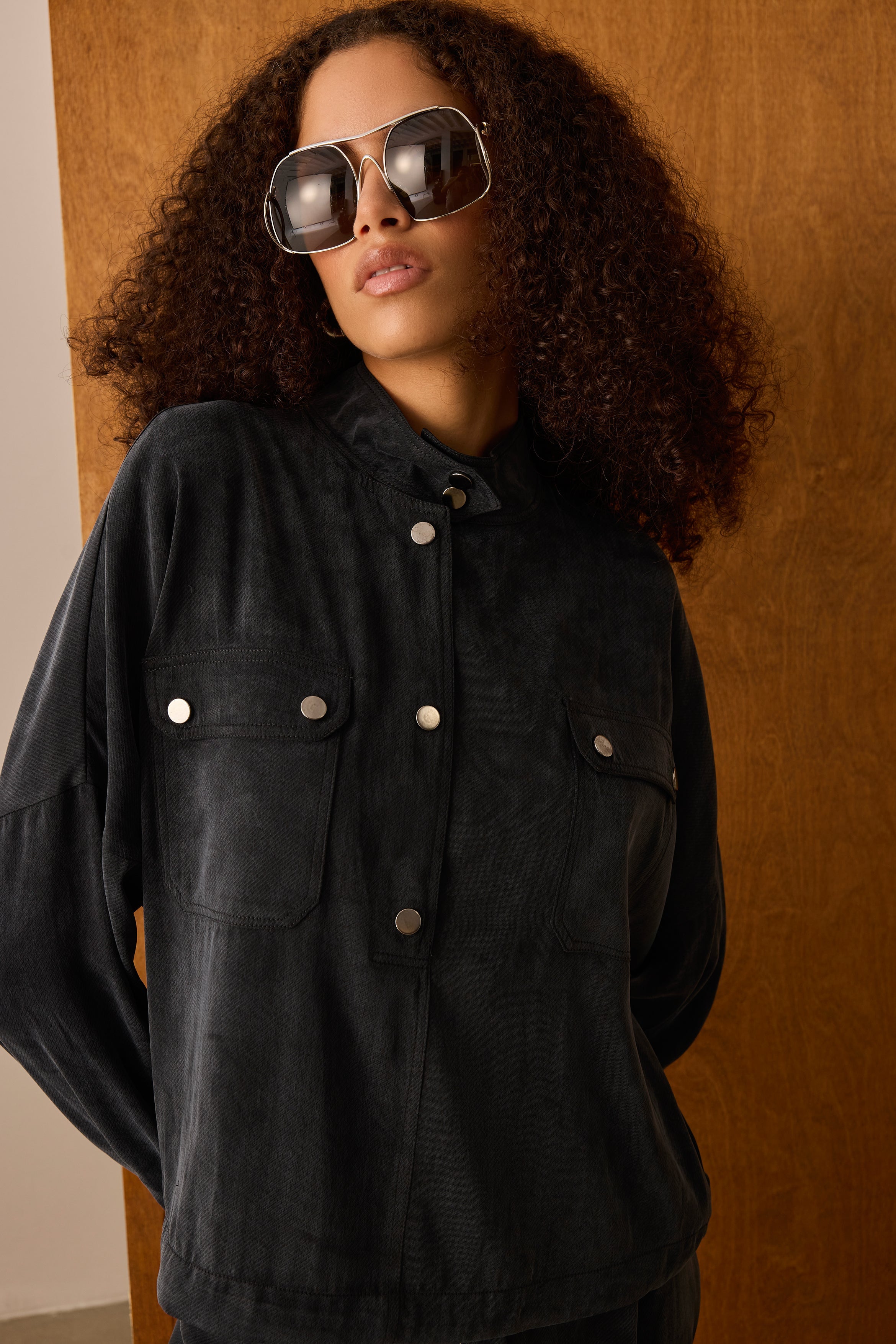 Hakim yaka detayı ve metal düğmeleriyle dikkat çeken bu uzun kollu kadın gömlek, zarif ve modern bir görünüm sunar. Cep detayları ve rahat kalıbı sayesinde günlük stilinize şıklıkla eşlik eder.