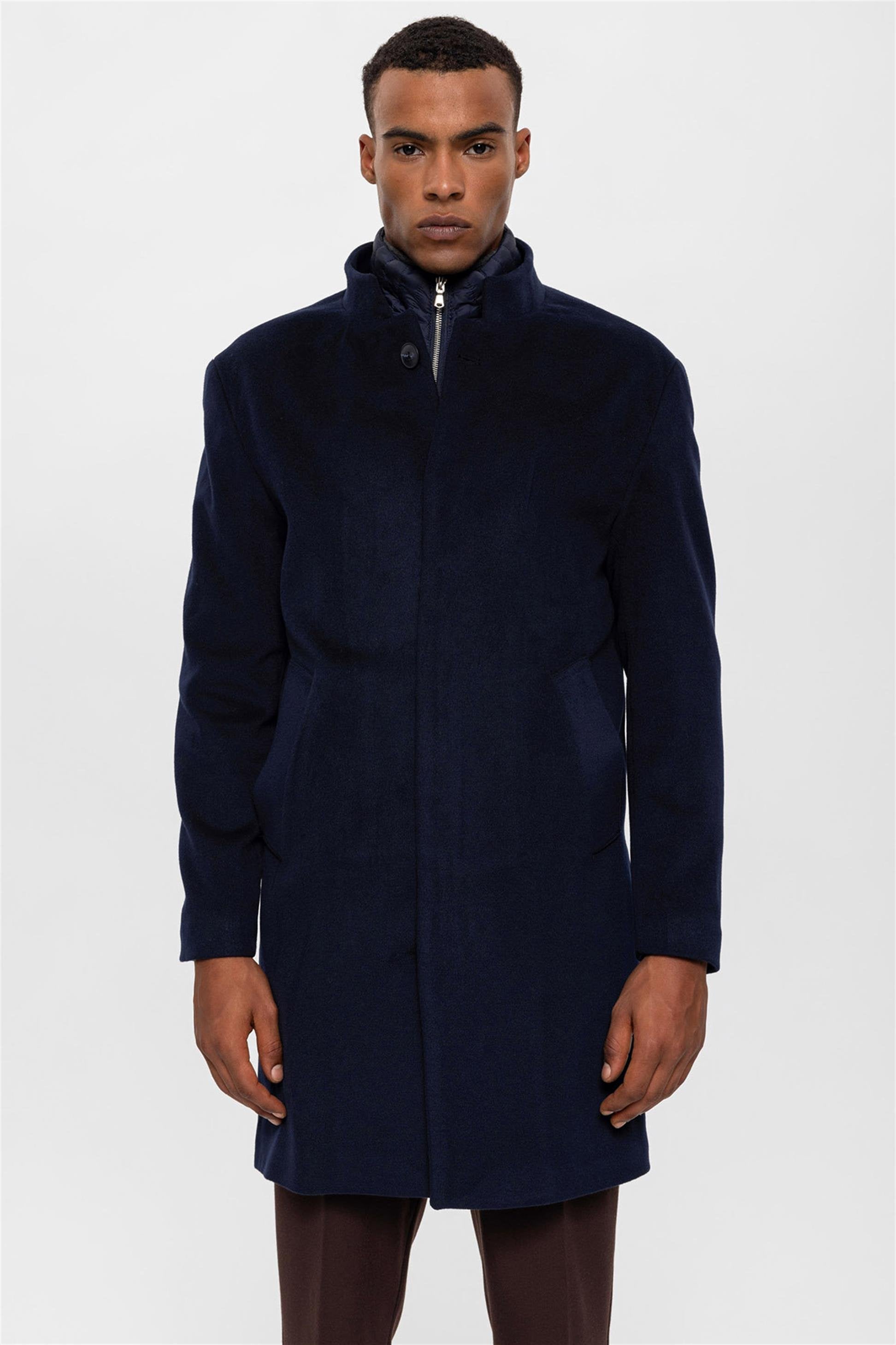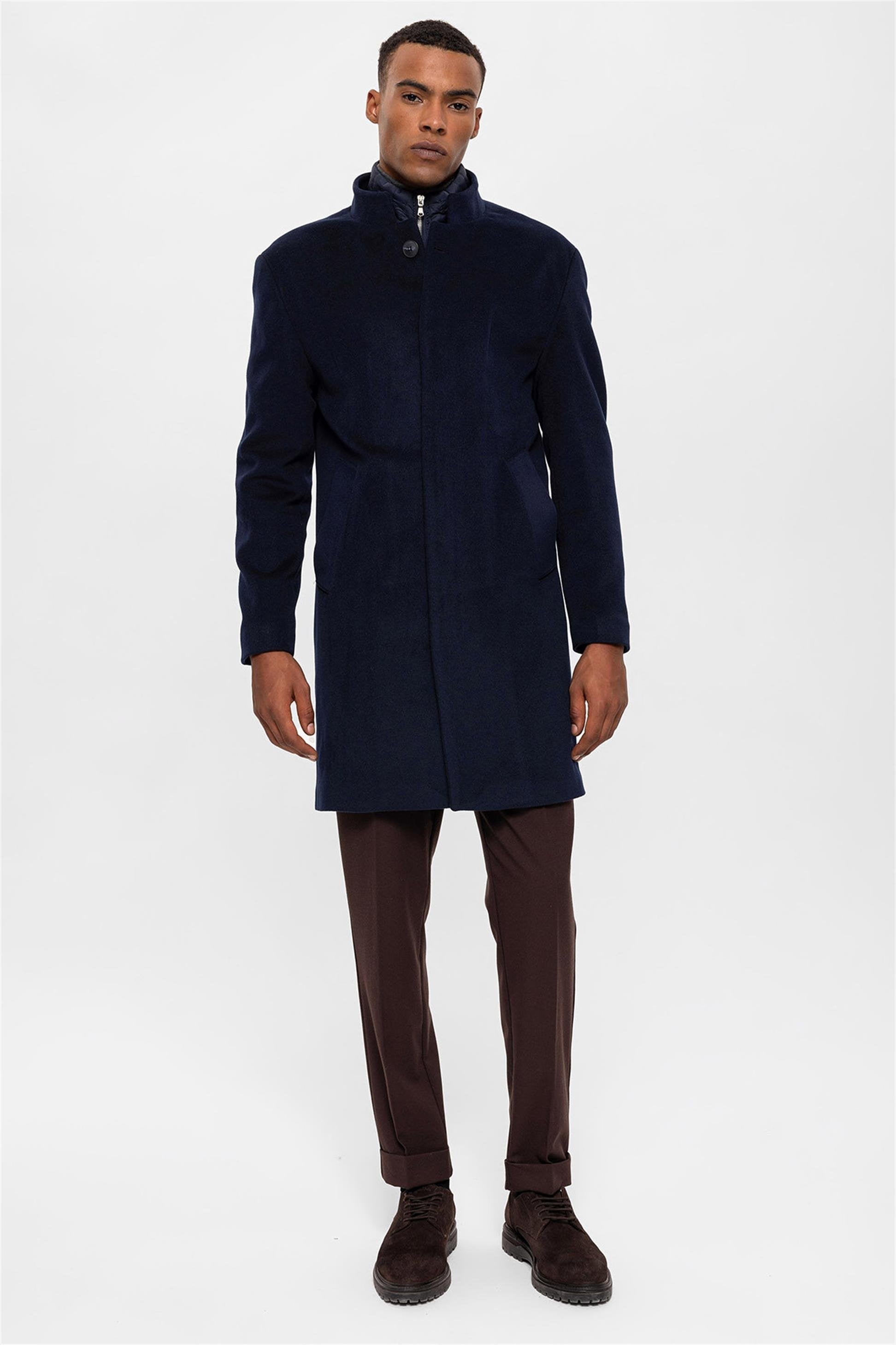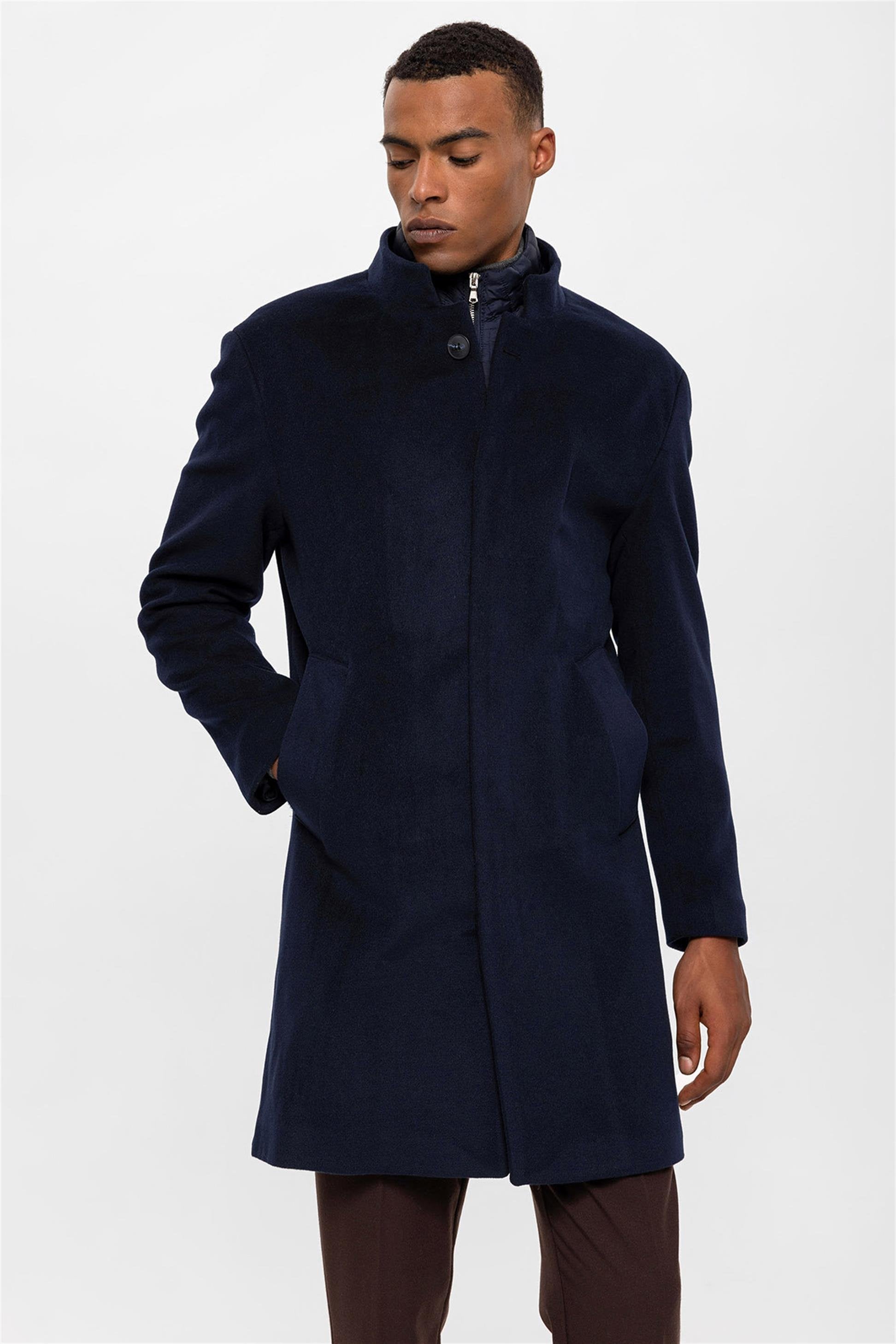 Lacivert Dik Yaka Gizli Düğme Detaylı Erkek Kaban