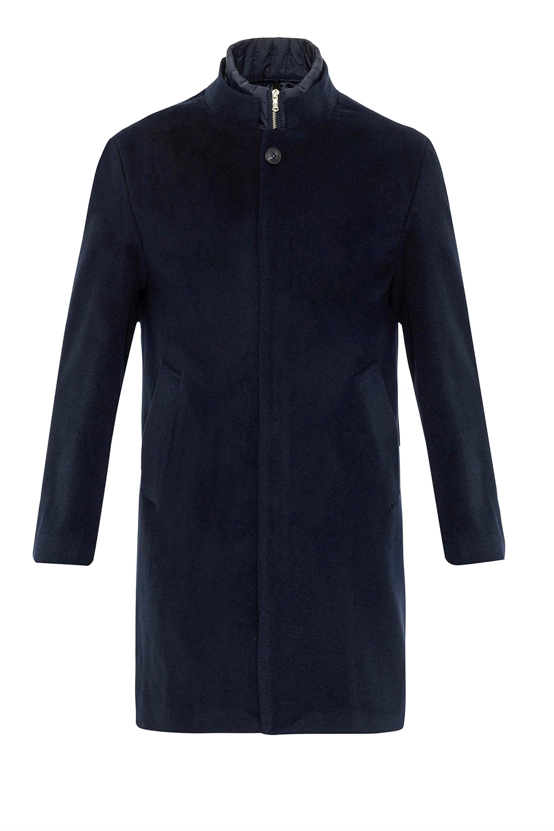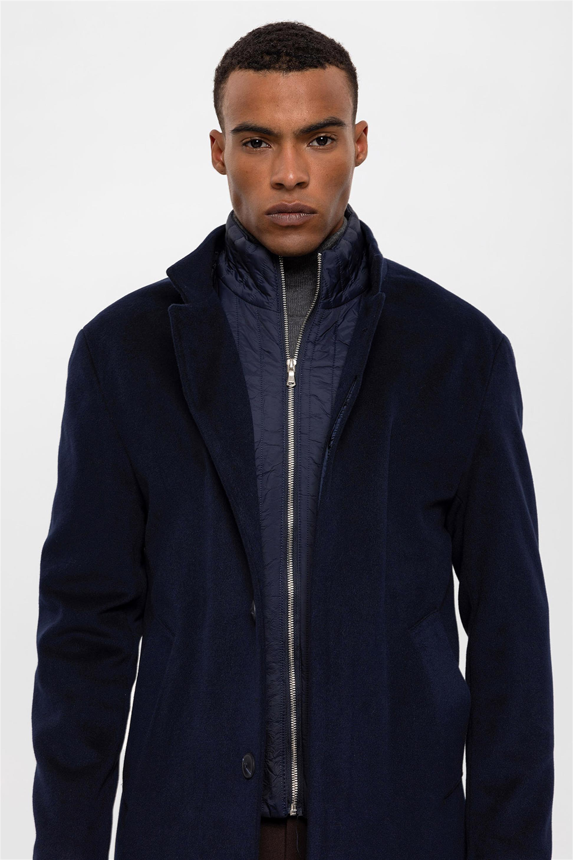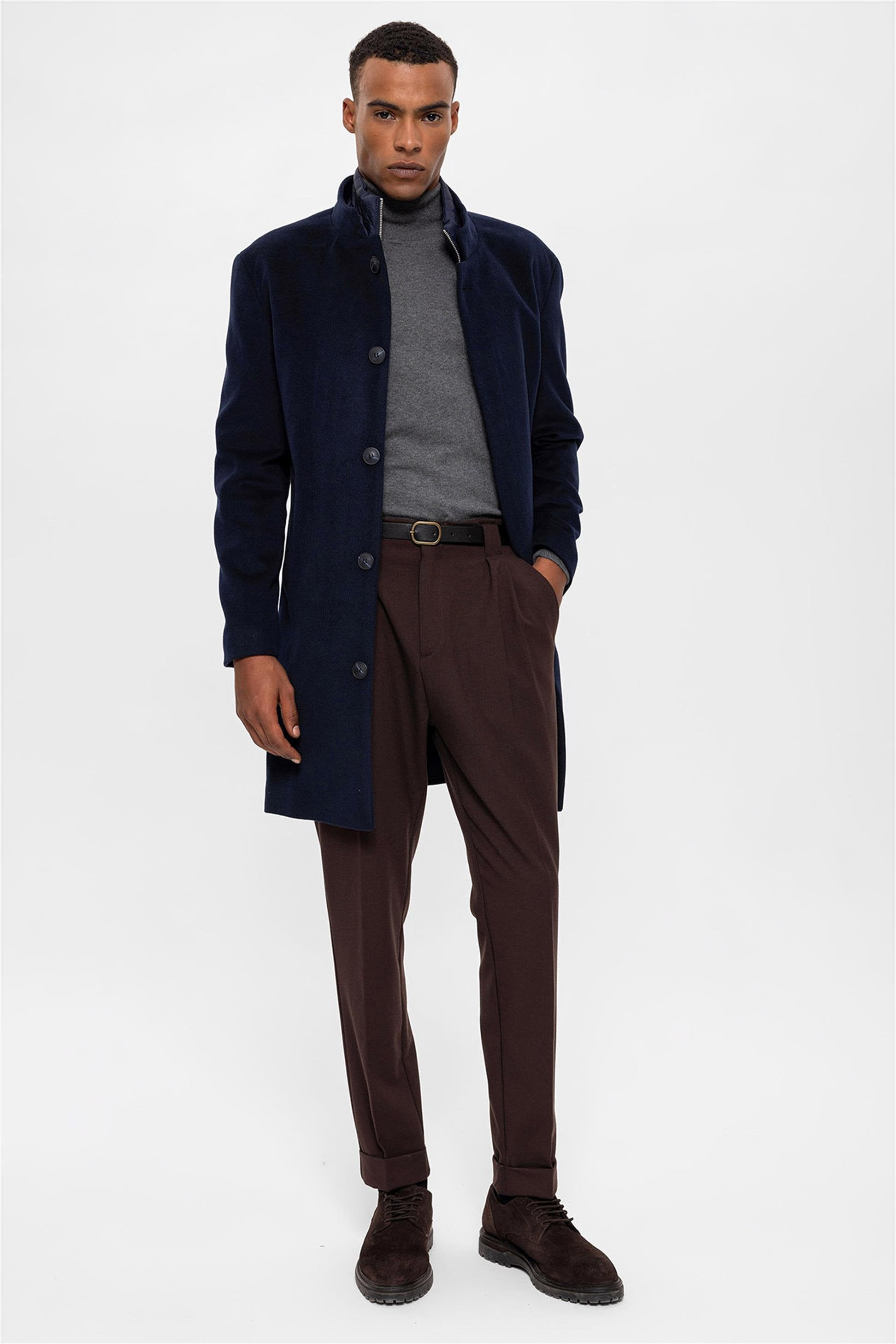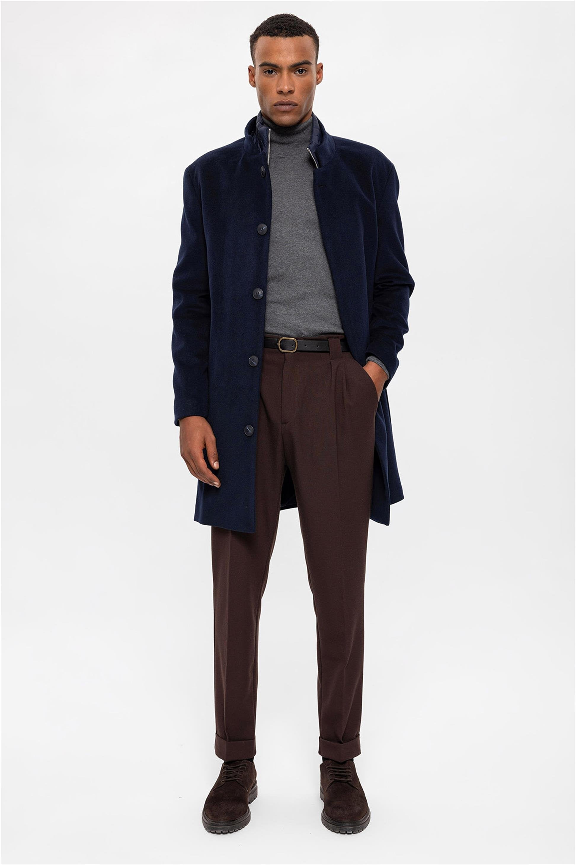 Lacivert Dik Yaka Gizli Düğme Detaylı Erkek Kaban