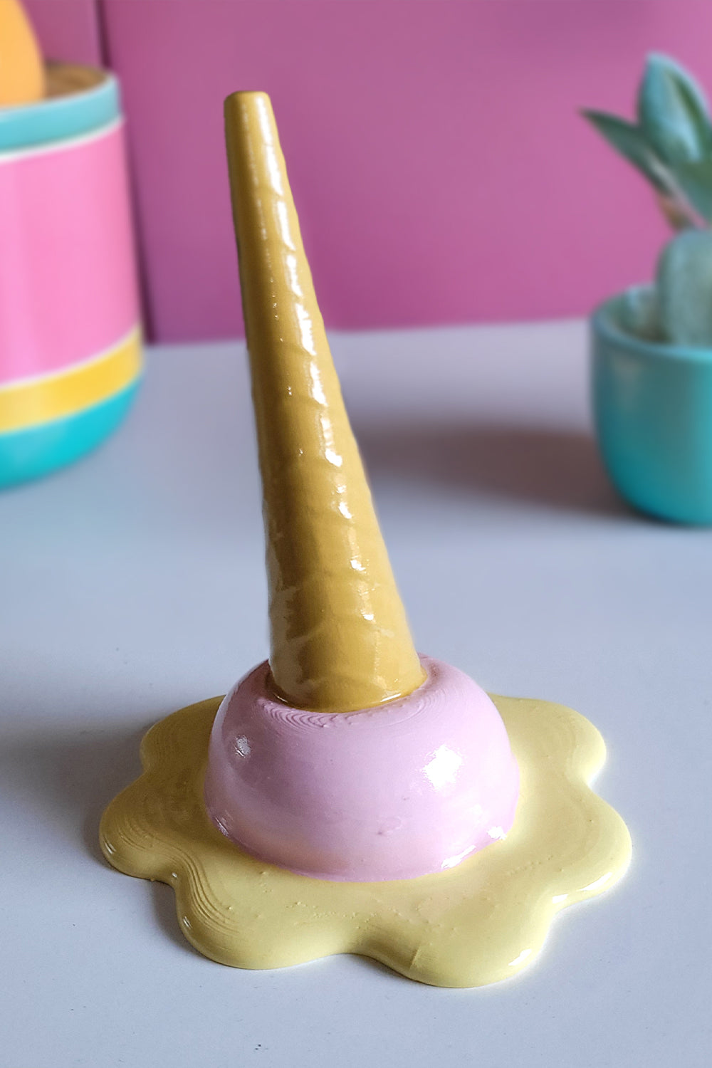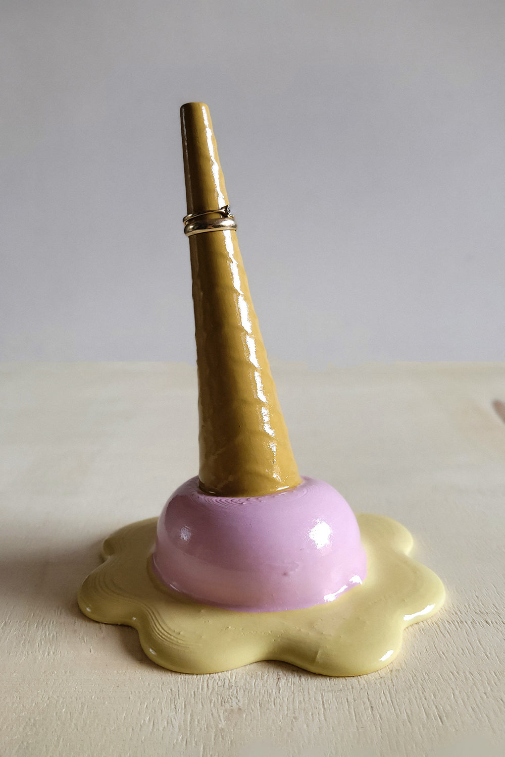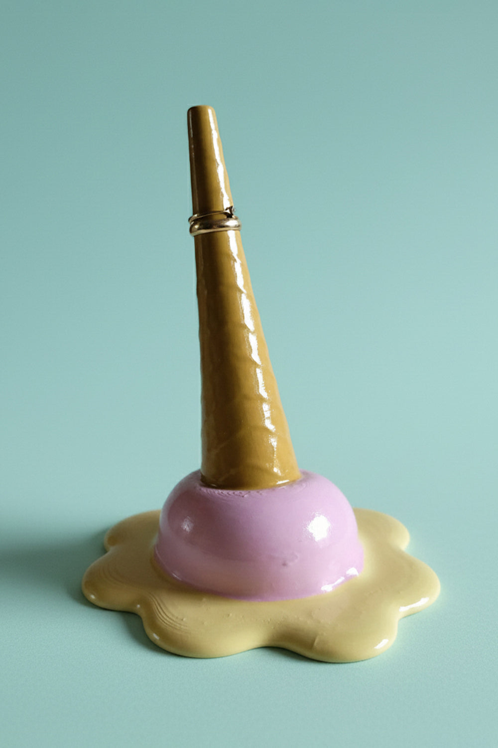 Ters dönmüş bir külah, eriyen dondurma ve üstüne takılmış yüzükler… Bu yüzüklükle sıradanlığa veda edebilirsin! 🍦💍