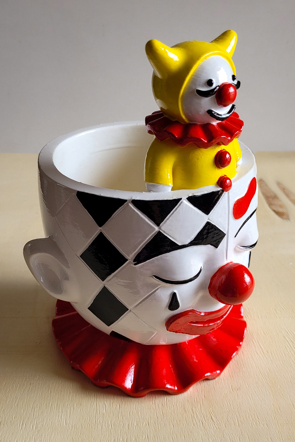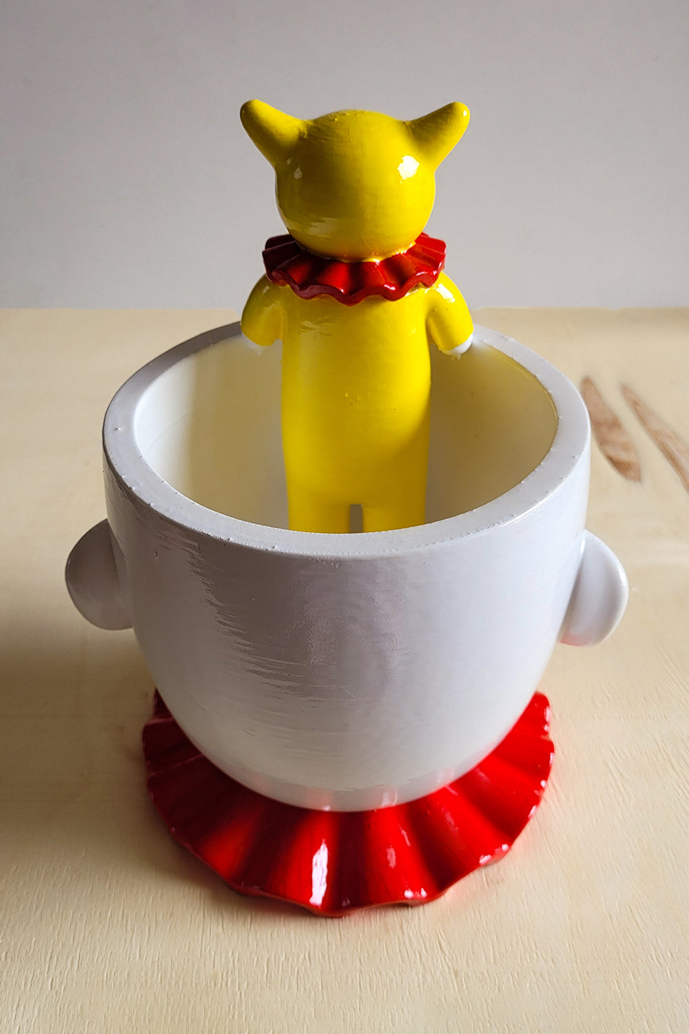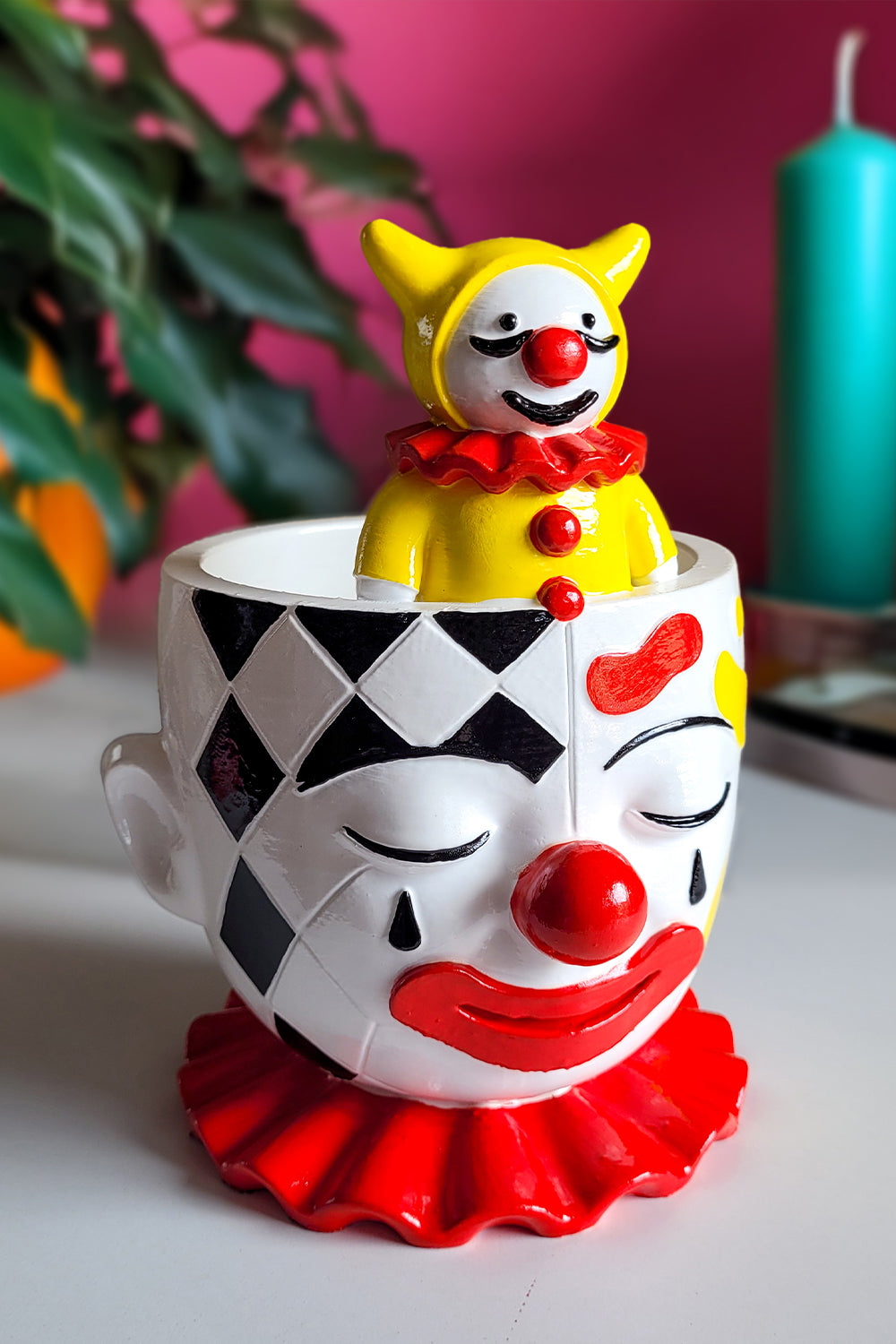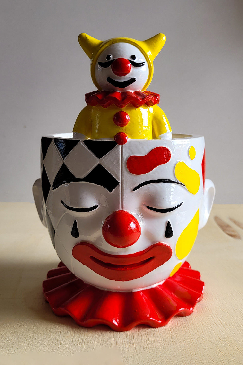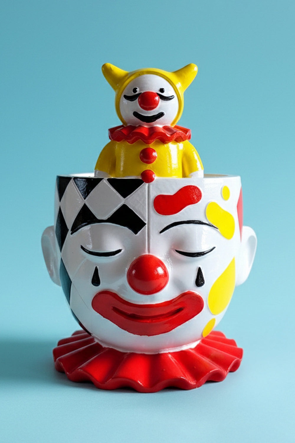 Klasik mimikleri ve başından çıkan ikinci palyaço figürüyle tam anlamıyla sıra dışı. Bitki yerleştirmek için ideal iç hacme sahip ama kalemlik olarak kullanıldığında da yüzünüzde gülümseme yaratacağı kesin.