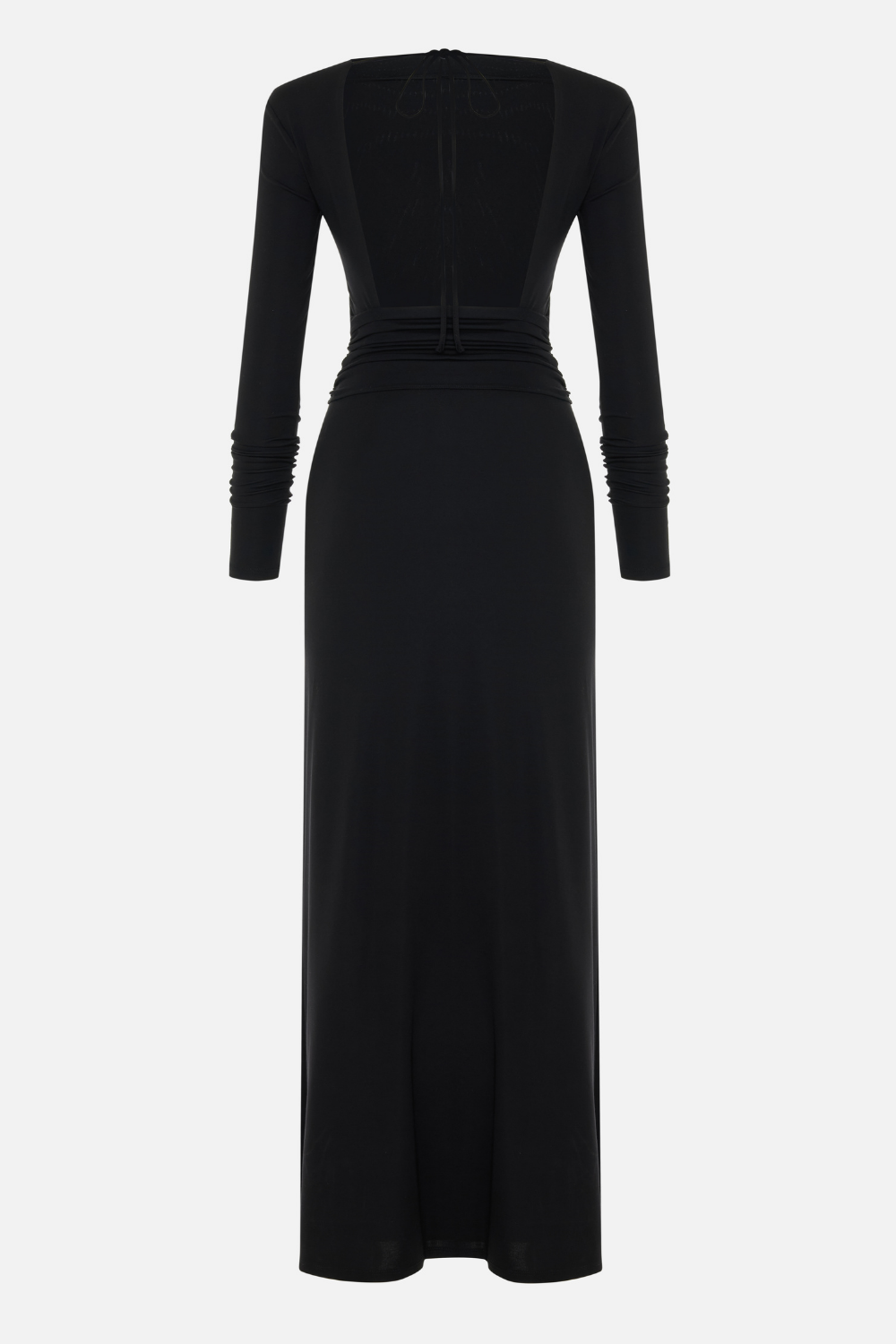 Altın toka ile vurgulanan drapeli bel detayı figürü ön plana çıkarırken, bağcık kapamalı açık sırt modern bir dokunuş ekler. Yere kadar uzanan düz etek ve arka yırtmaç, hareket özgürlüğü sağlarken vücudu saran siluet zarafeti tamamlar. Gece davetleri ve özel etkinlikler için ideal, sofistike bir siyah elbise.