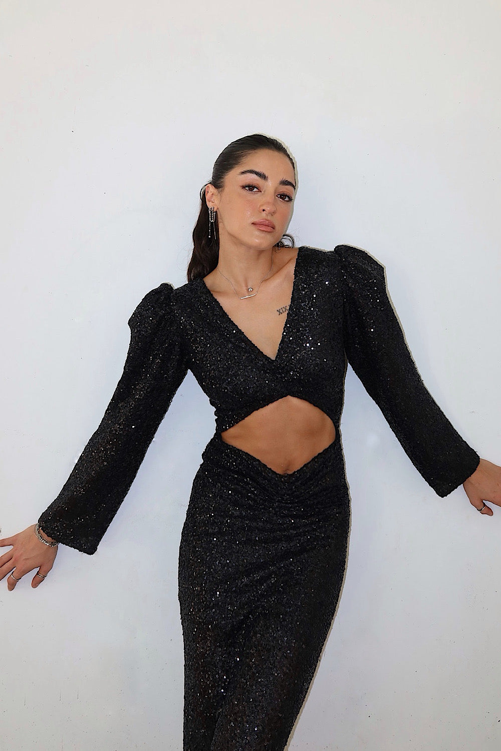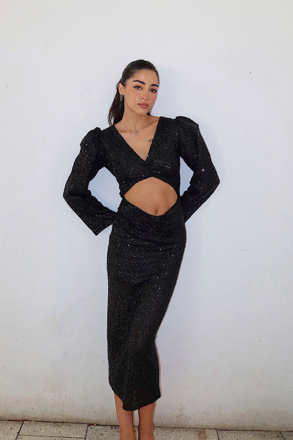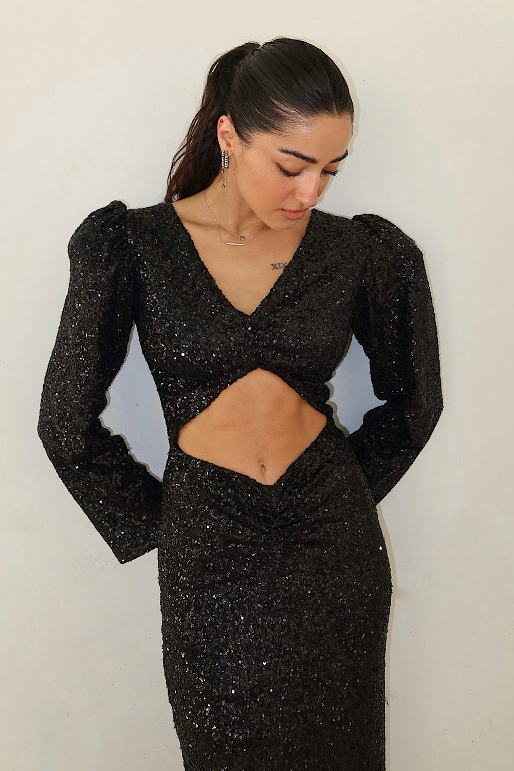 Kadın Siyah Cut Out Pulpayet Davet Midi Vatkalı Elbise Abiye