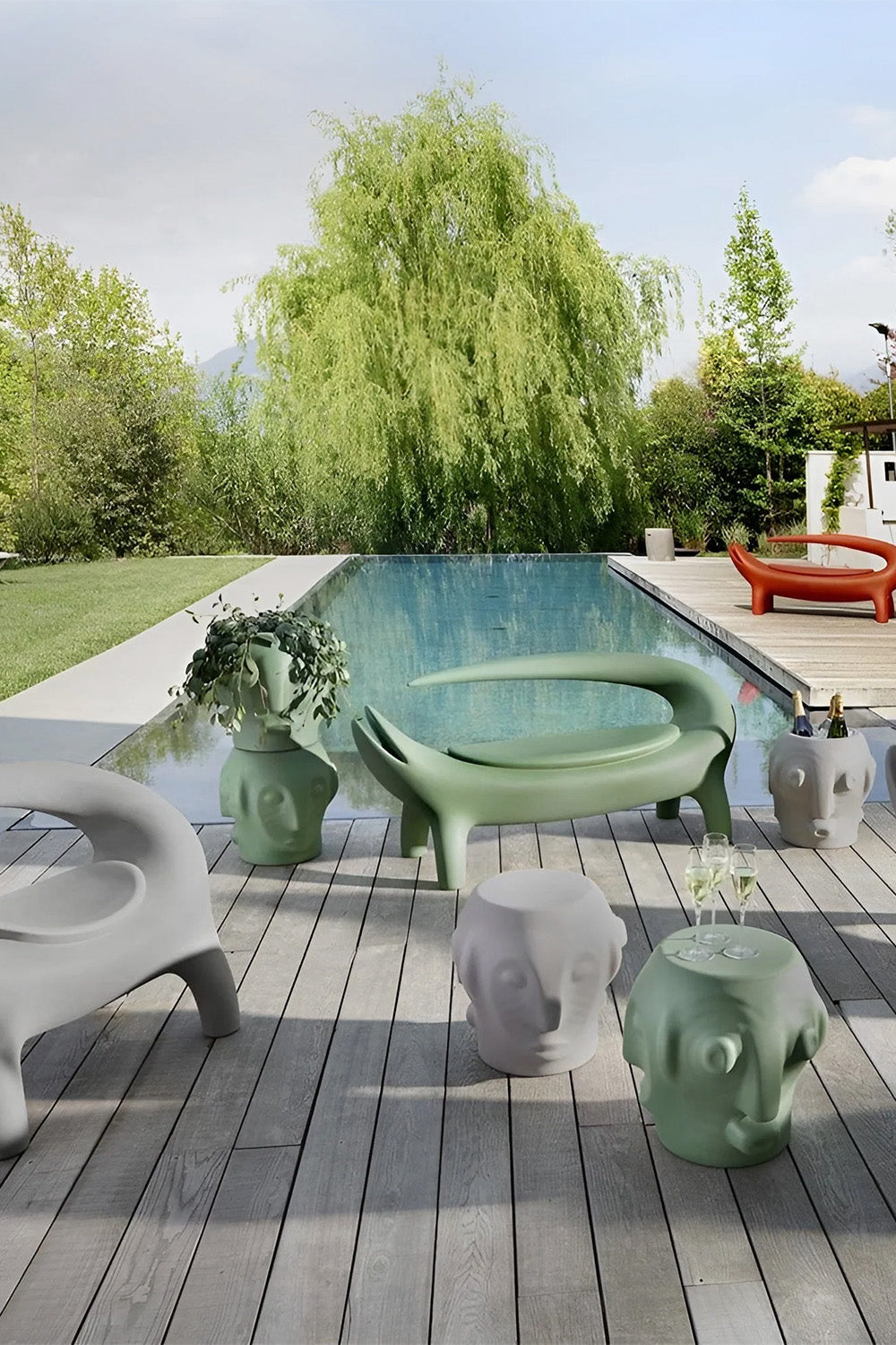 Üç yüz, etrafında buluşulacak bir sembol. Marcantonio, SLIDE'ın pop ruhu sayesinde yeniden canlanan ve tasarımcının en ciddi özelliği olan ironi ile işaretlenen, atalardan kalma mekan ve zaman paylaşma ritüellerinin bir evrimi olan çağdaş bir sehpa/tabure olan Threebù'yu tasarlıyor. Etnik ancak son derece çok yönlü bir tada sahip olan Threebù, doğayla sürekli bir bağlantı içinde olan yeni koleksiyonun bir parçası, şeker kamışından elde edilen, dünyanın renklerini hatırlatan ve tasarım dünyasında ilk kez kullanılan bir biyoplastik ile üretiliyor.