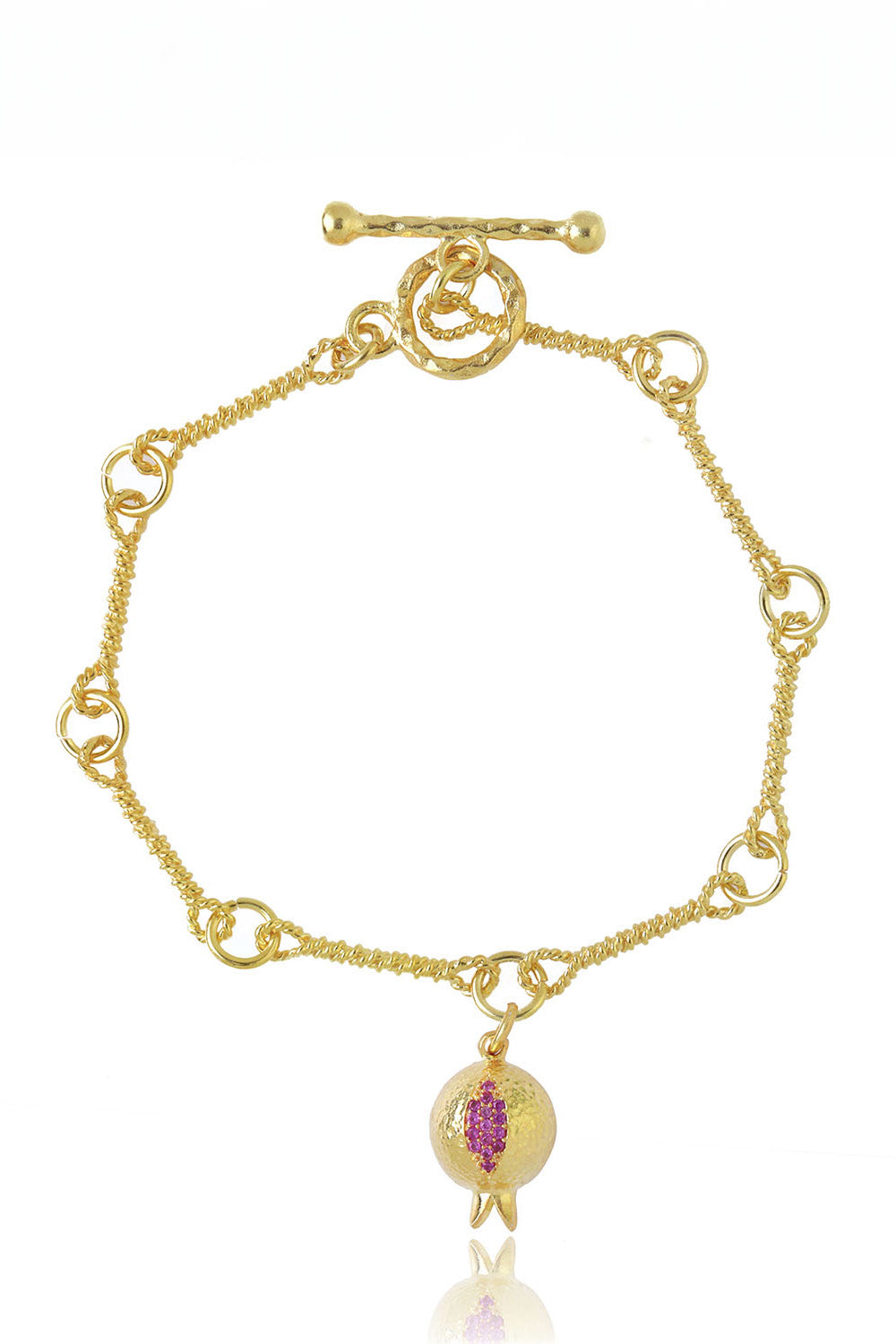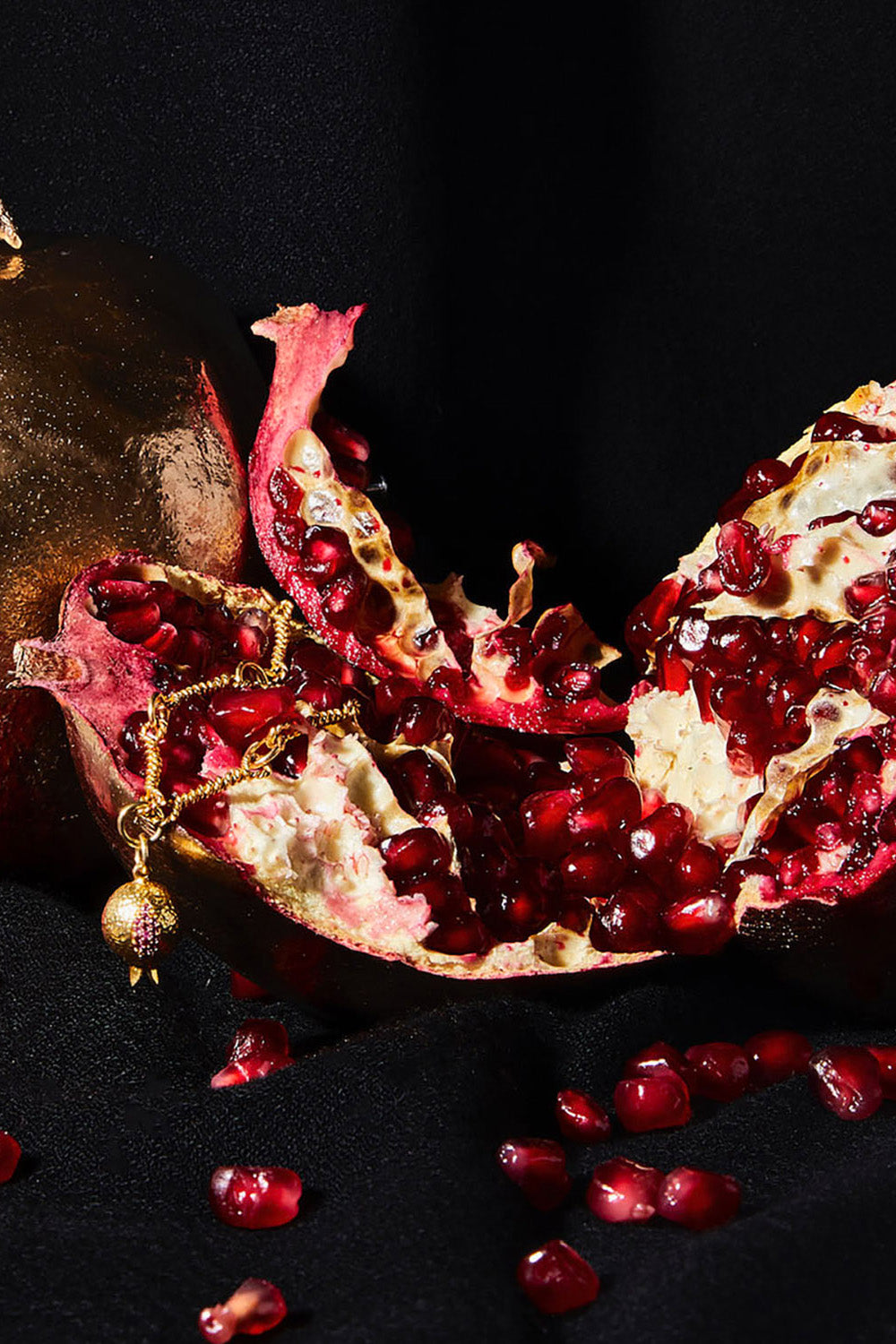 Bu kelime benzerliği ve bolluğu simgeleme biçimi, bizi nar şeklindeki Pomona Bileziği'nin zarafetini 925 ayar gümüş üzeri 22 ayar altın kaplama ve Kırmızı Garnet taşıyla yaratmaya ilham etti