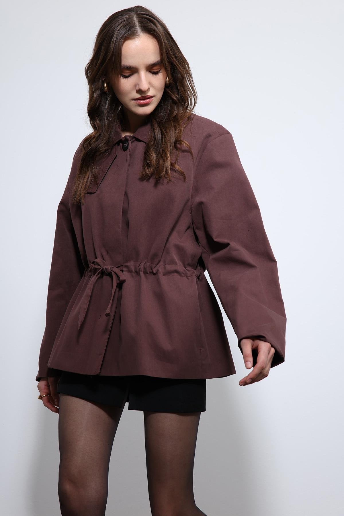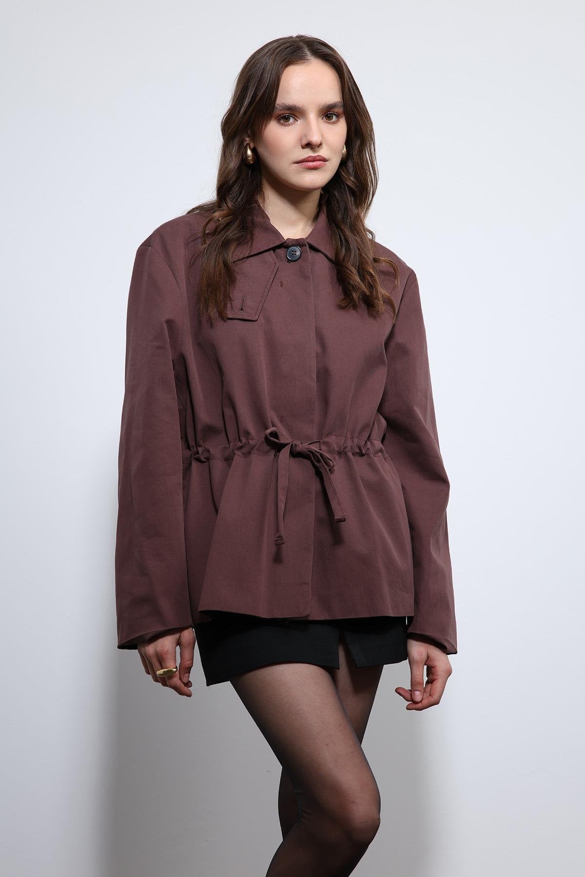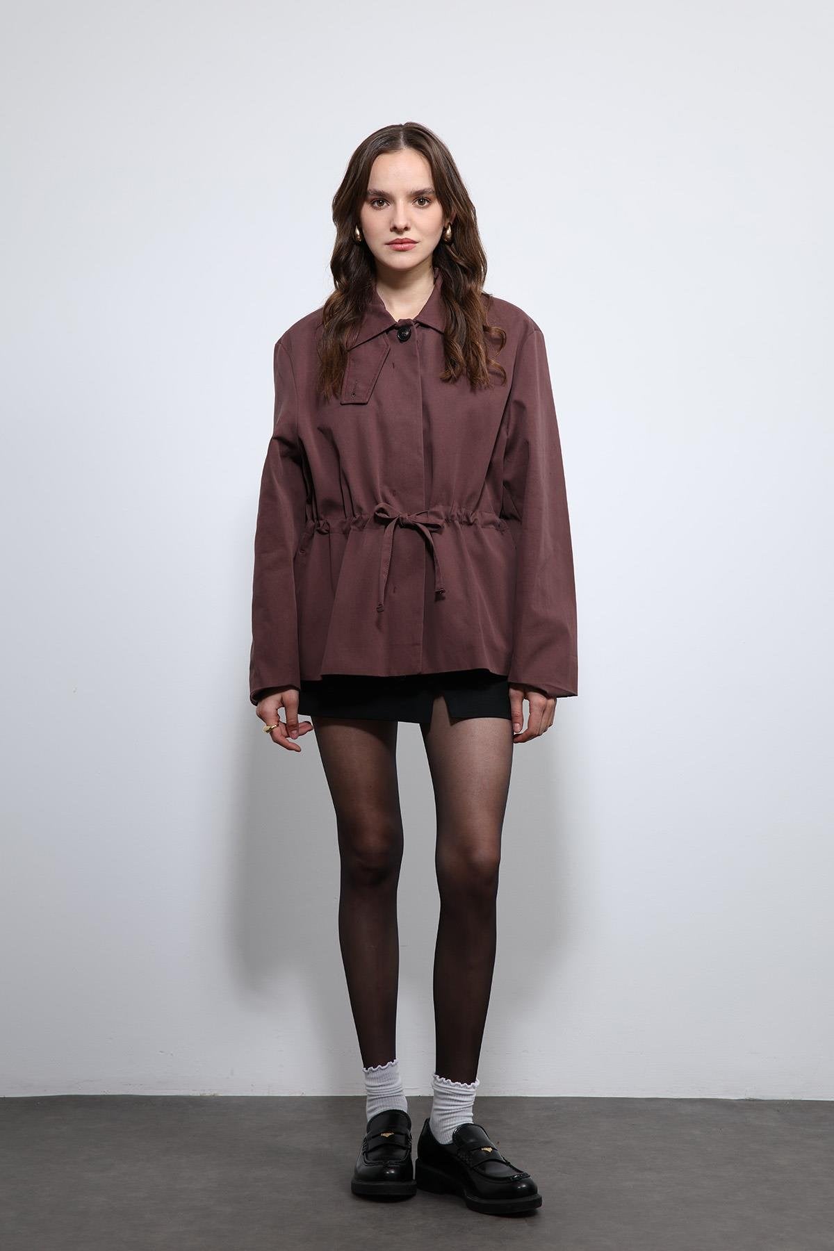 Bordo Ayarlanabilir Bele Sahip Kısa Trençkot