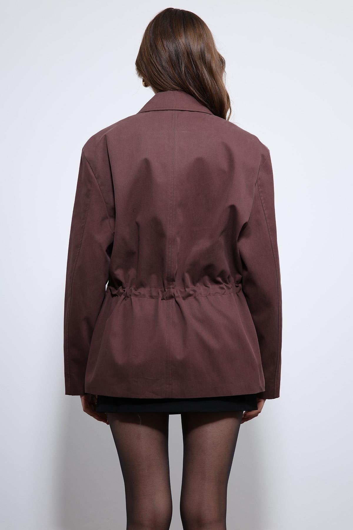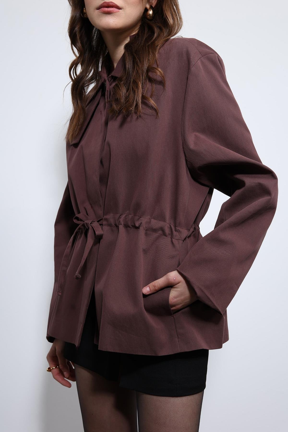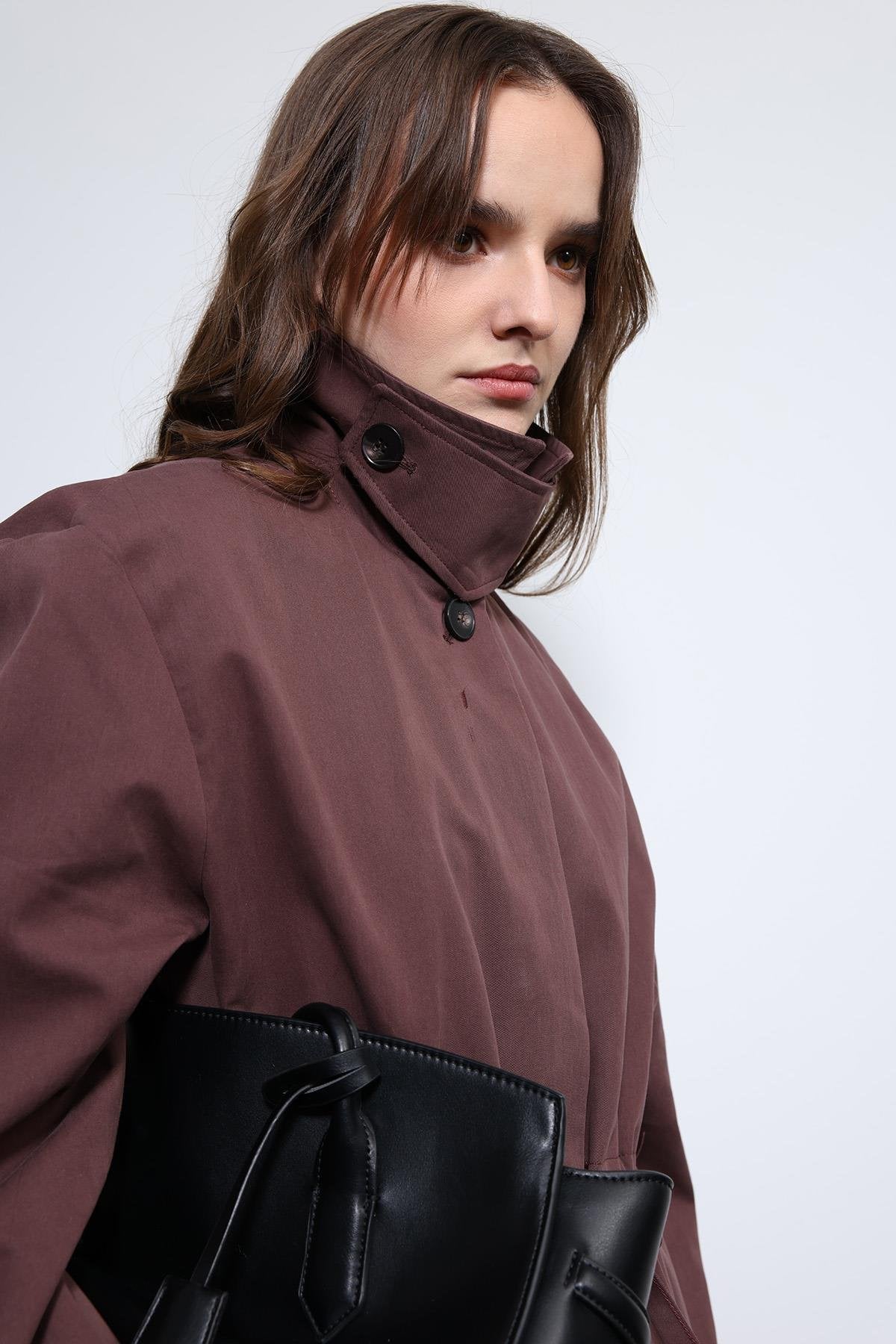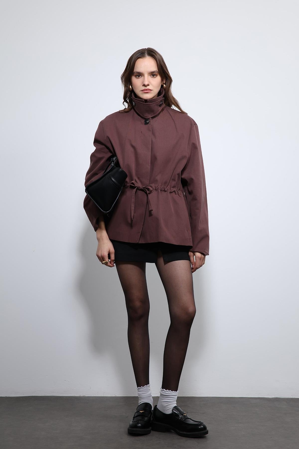 Bordo Ayarlanabilir Bele Sahip Kısa Trençkot