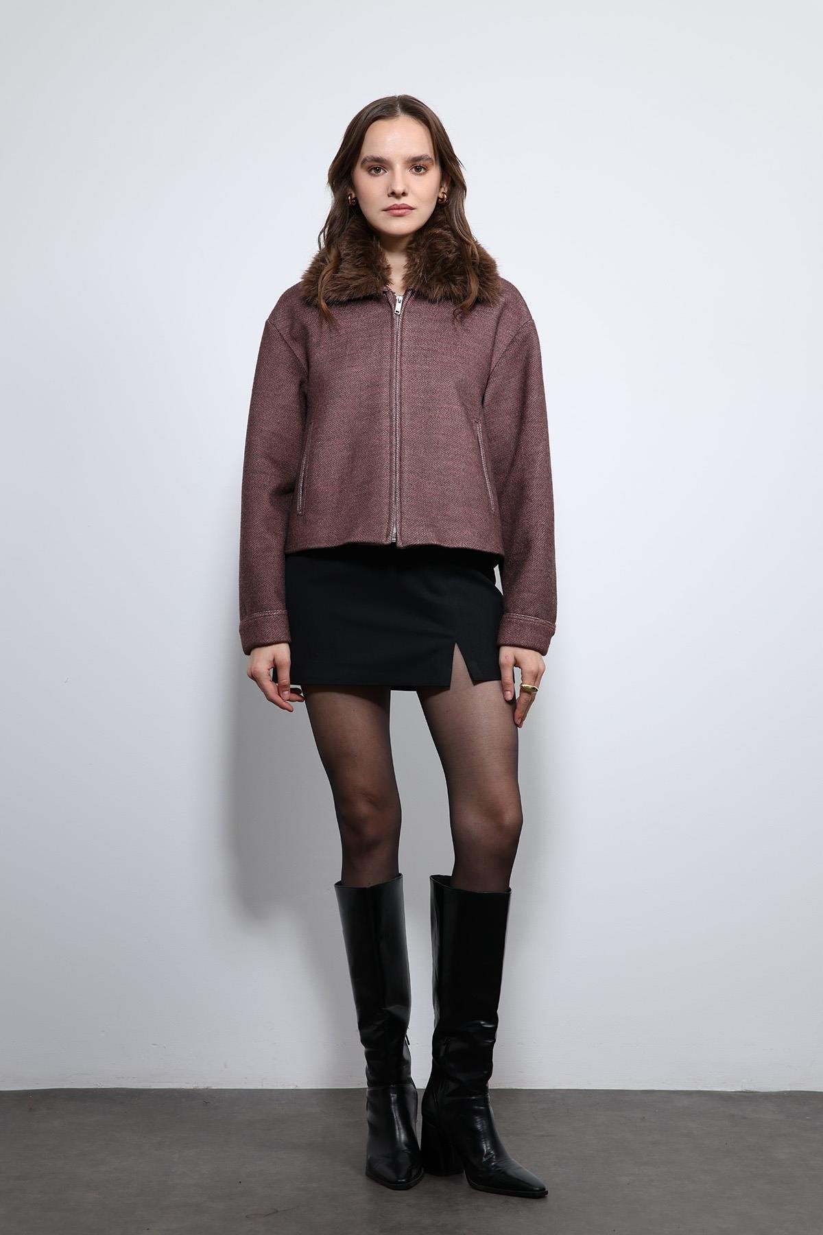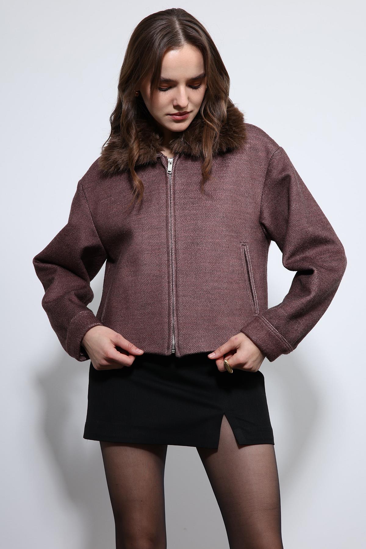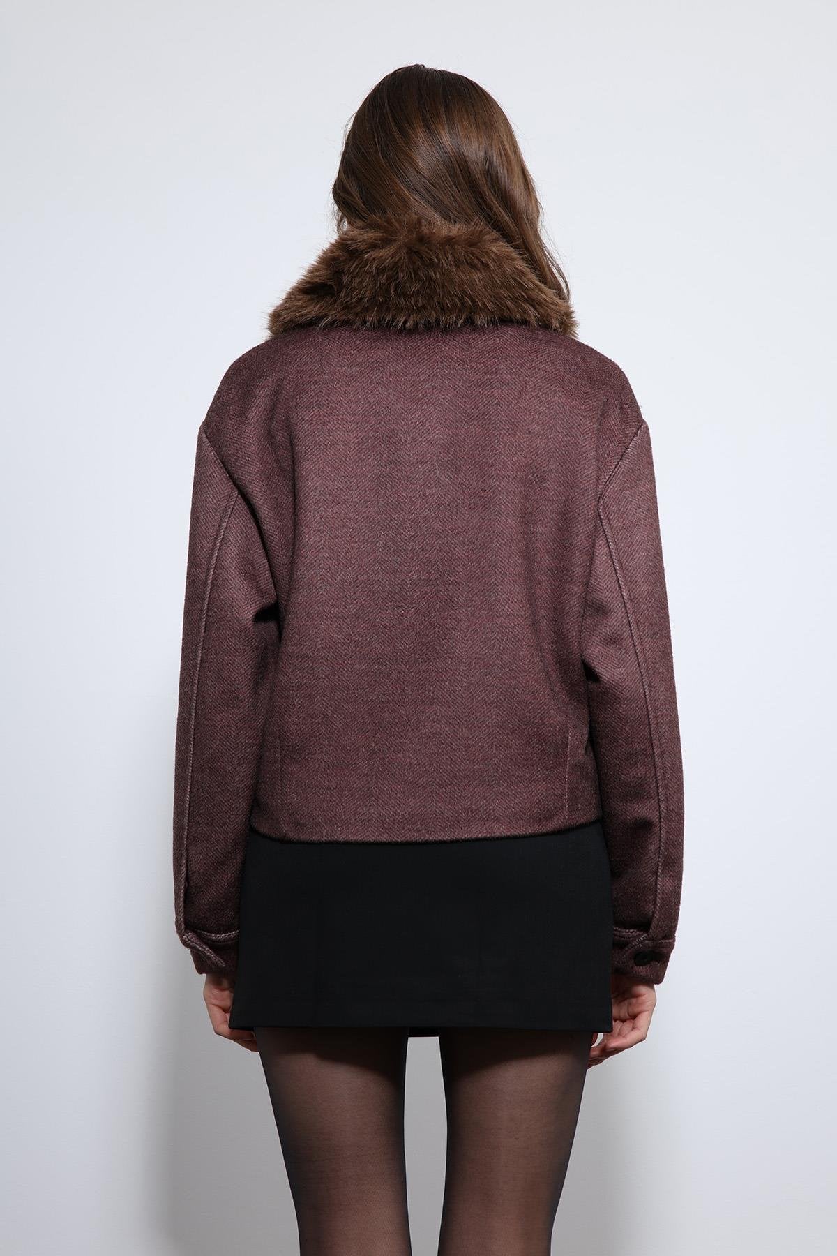 Bordo Yün Karışımlı Suni Kürk Yaka Ceket