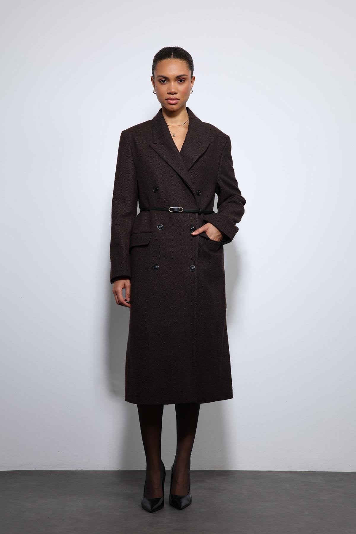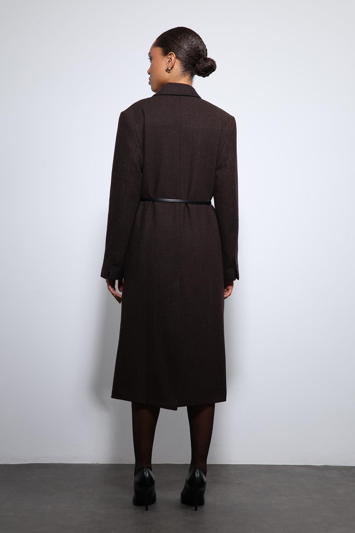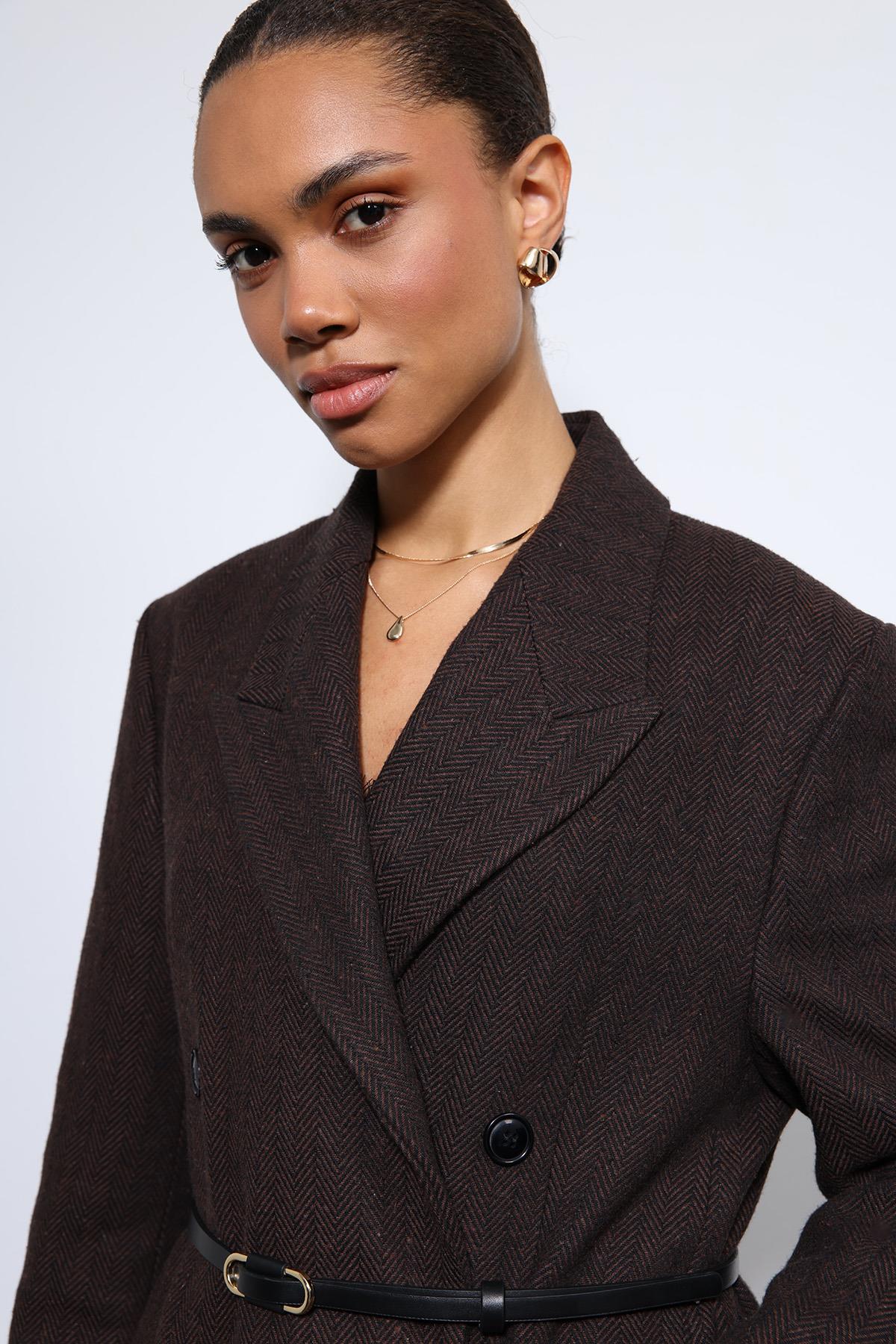 Kahve Balıksırtı Desenli Kemerli Kaban