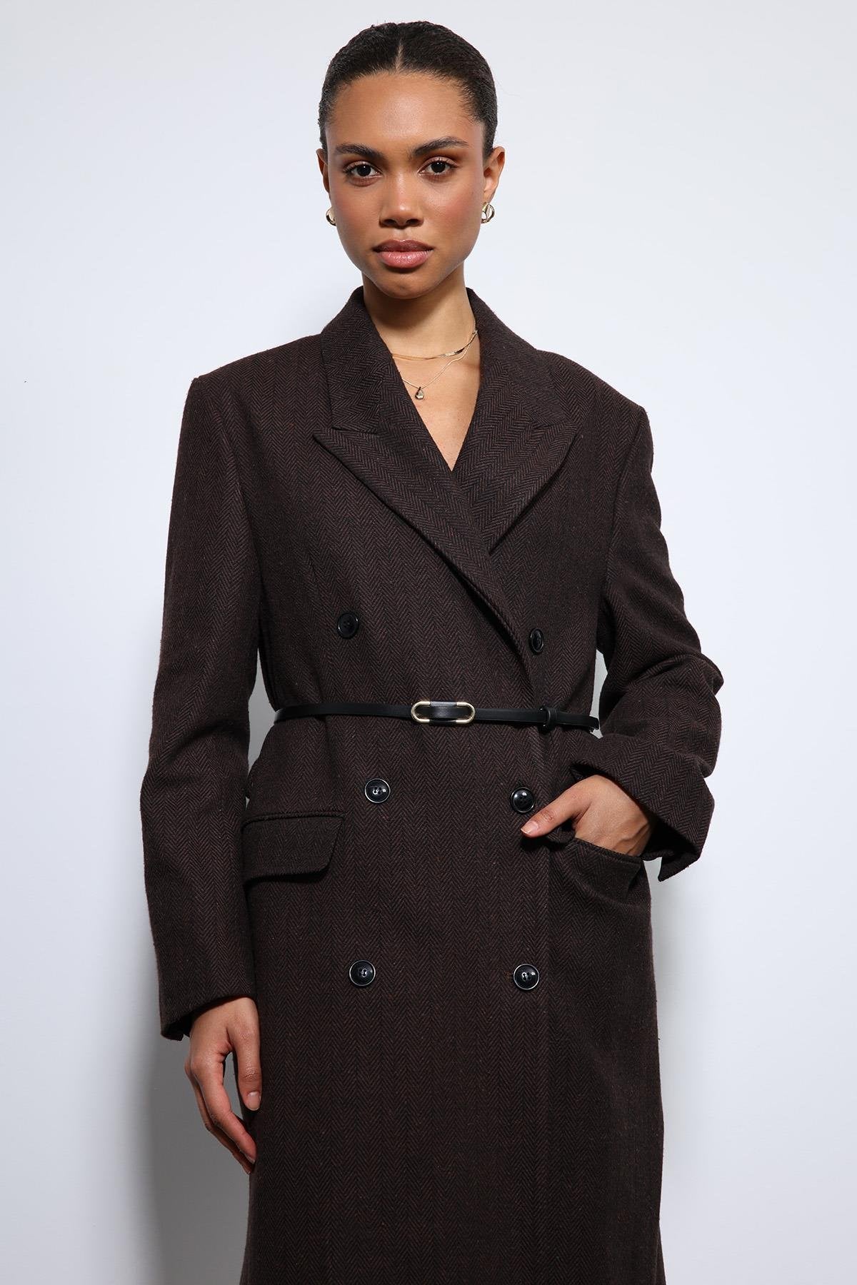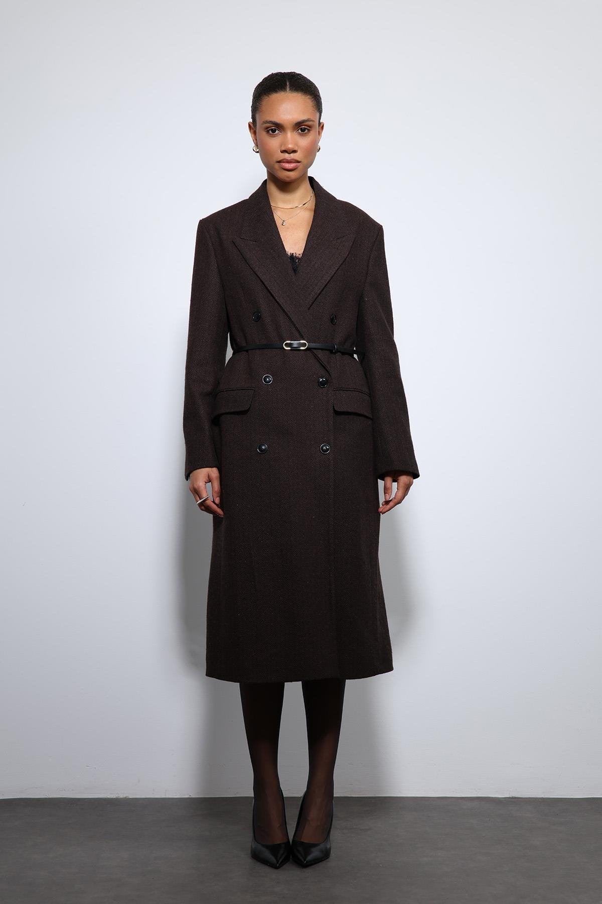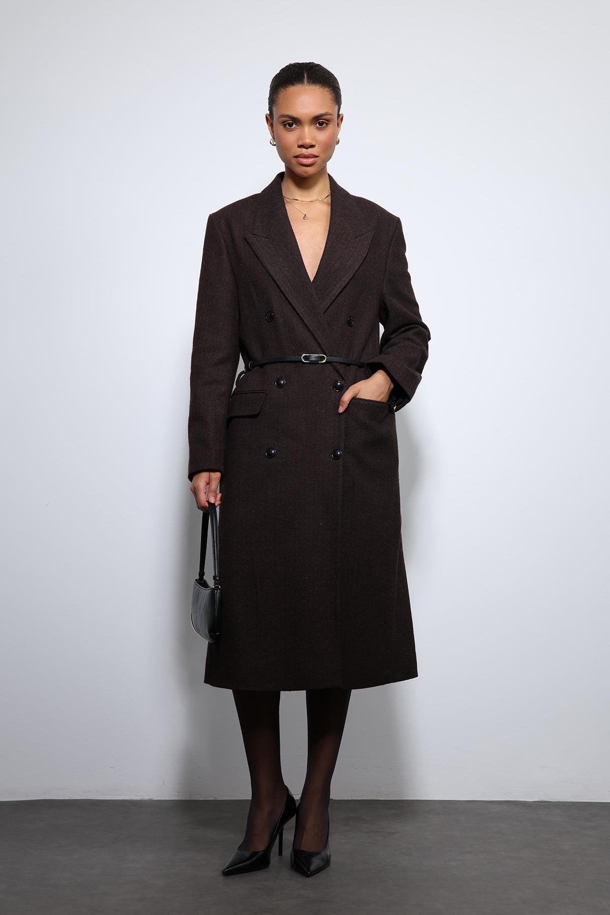 Kahve Balıksırtı Desenli Kemerli Kaban