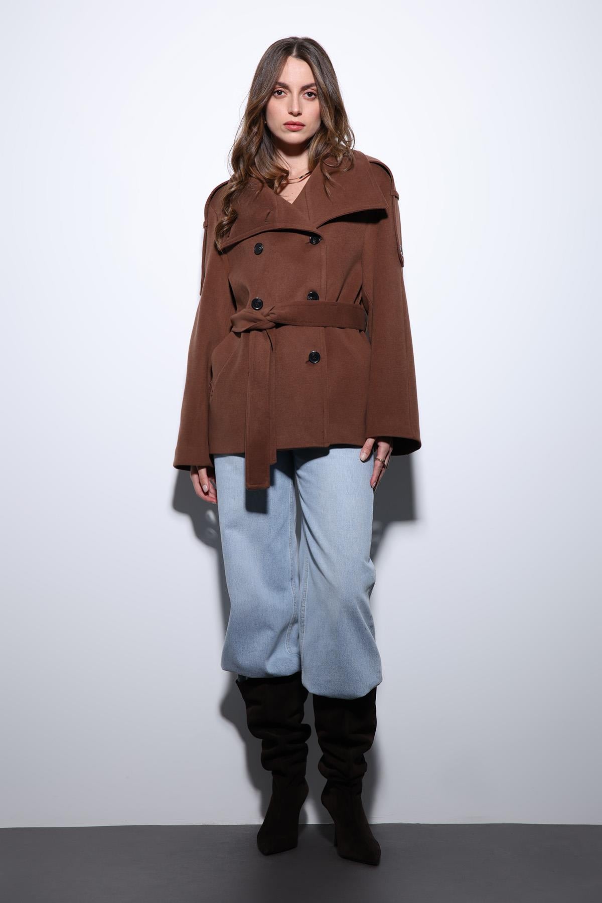 Kahve Dik Yaka Kruvaze Kadın Kaban