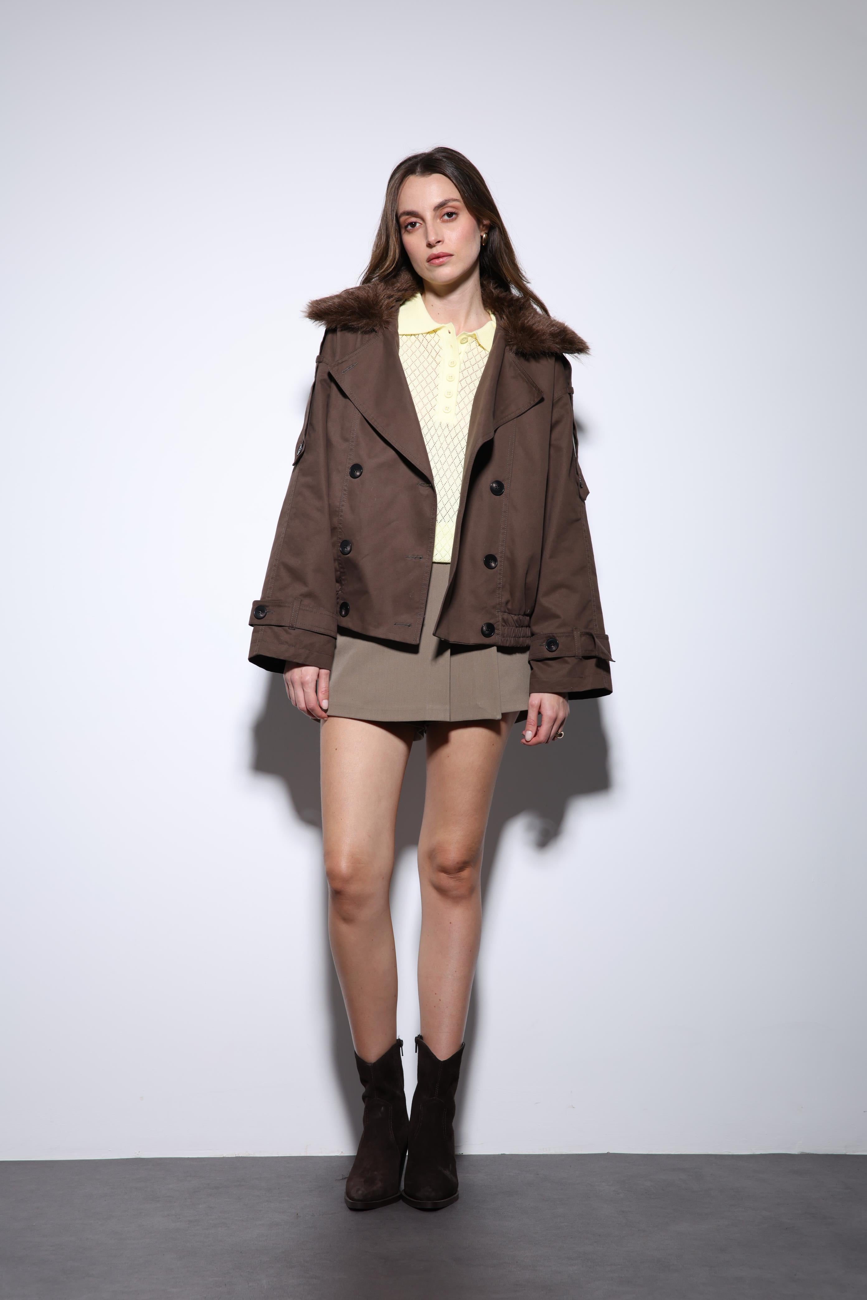 Kahve Suni Kürklü Kısa Kadın Trençkot