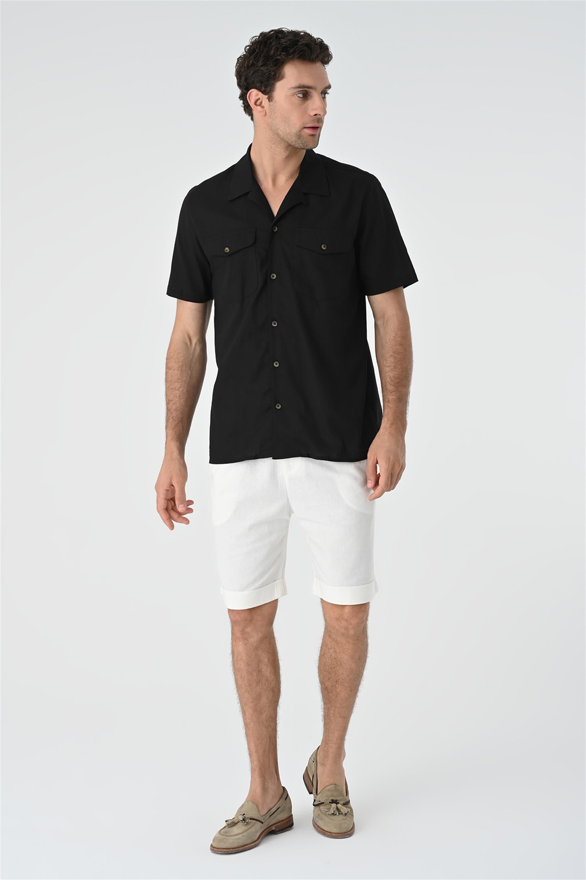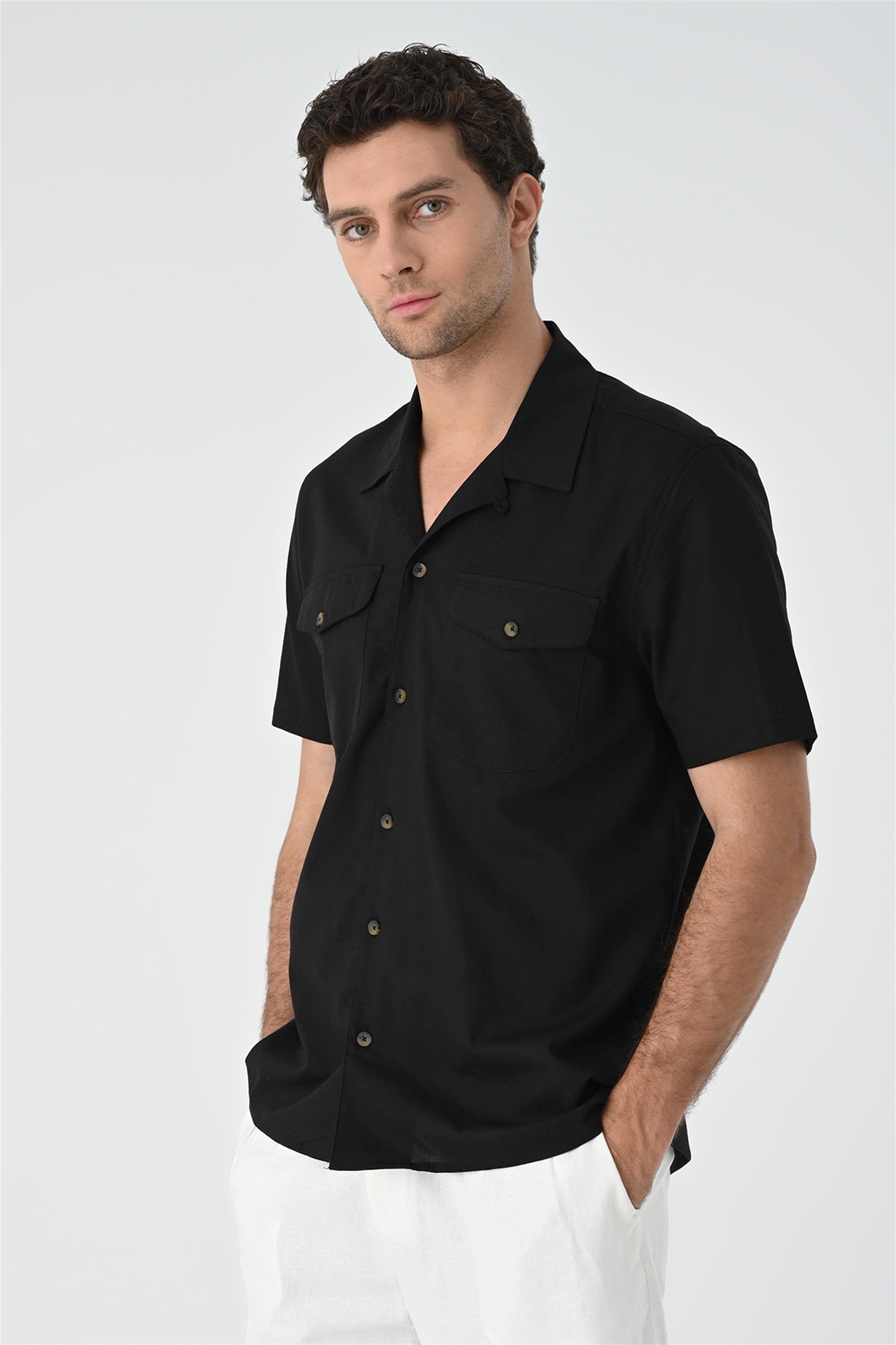 Siyah Apaş Yaka Cep Detaylı Erkek Gömlek