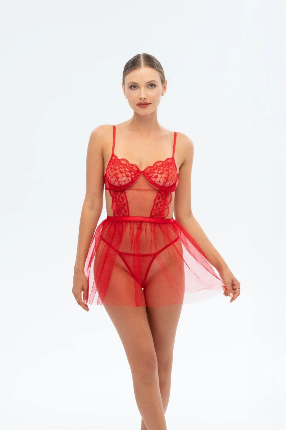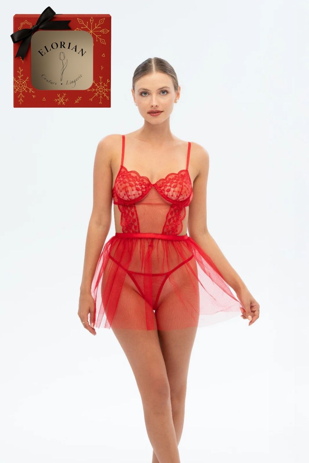 Christmas – Kırmızı Dantel Babydoll & Transparan Tül Etek Takımı