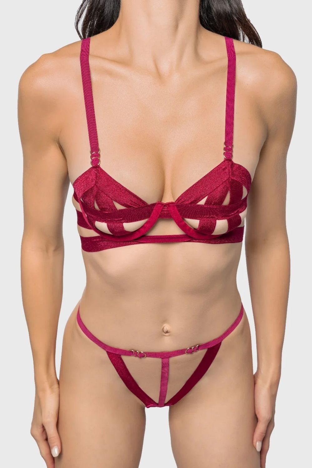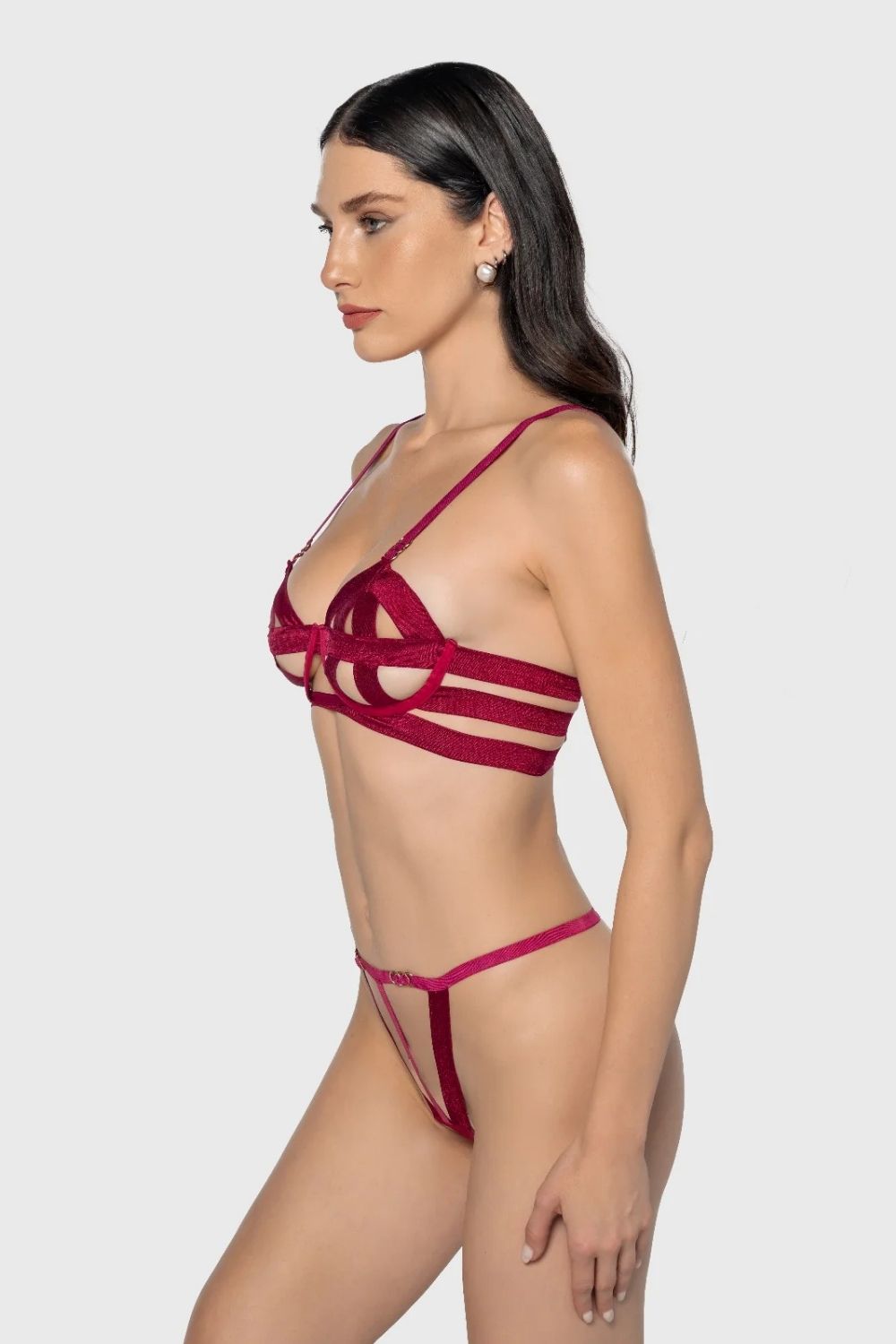 Elorian Christmas Collection’ın en cesur parçalarından bu strappy bra set, kırmızının zengin dokusunu modern cut-out çizgilerle bir araya getiriyor. Geometrik şerit detaylarına sahip sütyen, göğüs formunu güçlü bir siluete taşırken; minimal tanga alt parça tasarımı, koleksiyona imza niteliğinde bir çekicilik katıyor.