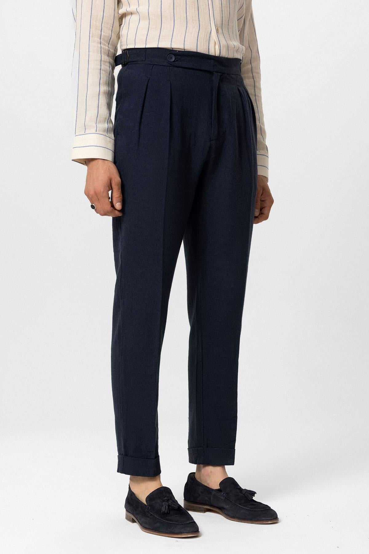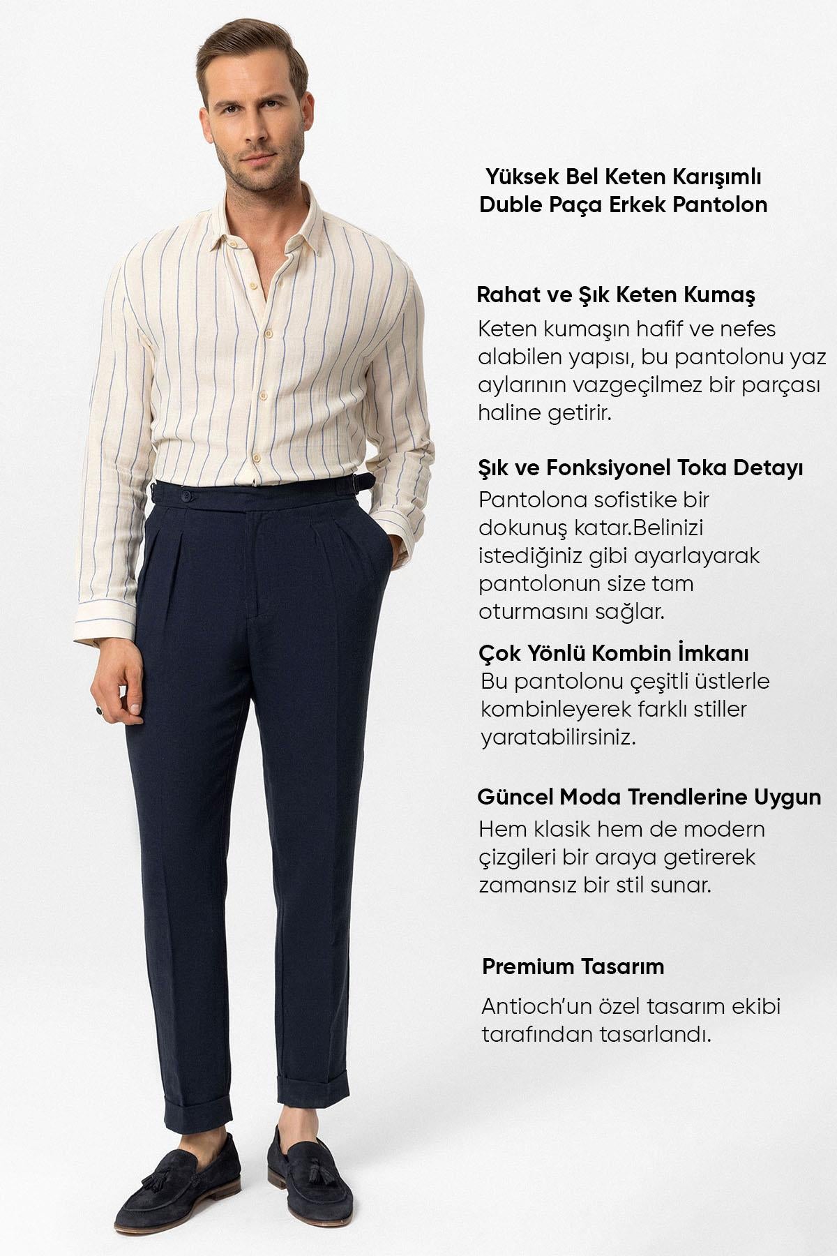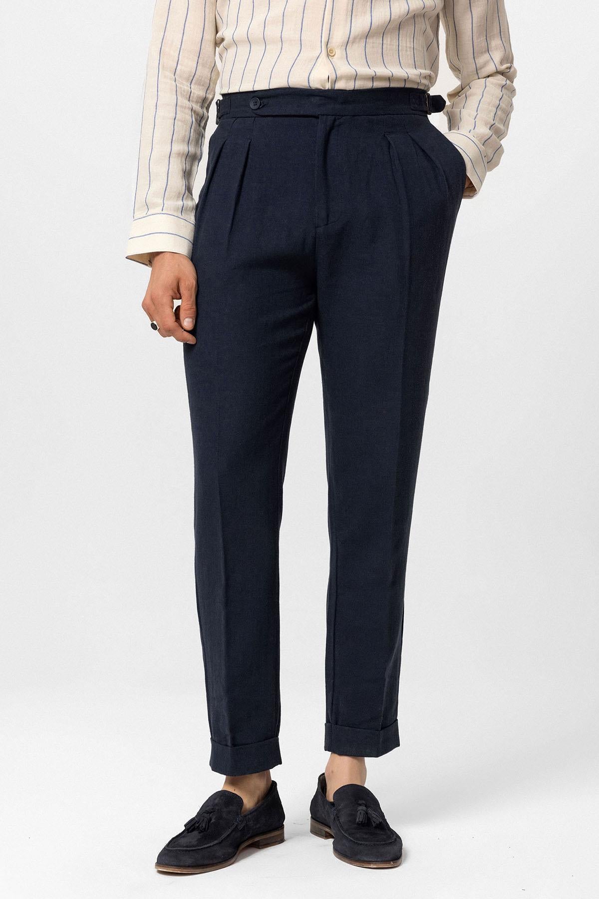 Lacivert Yüksek Bel Keten Karışımlı Duble Paça Erkek Pantolon