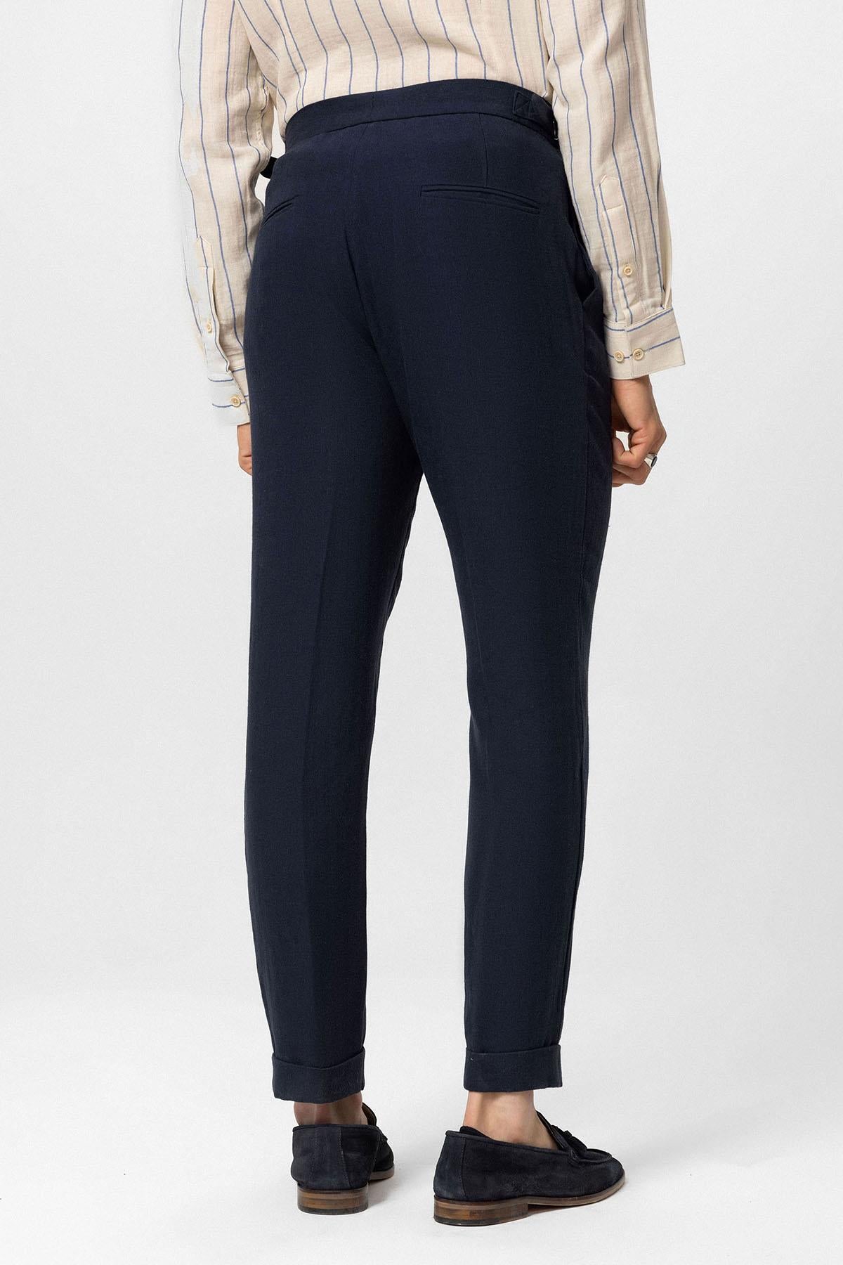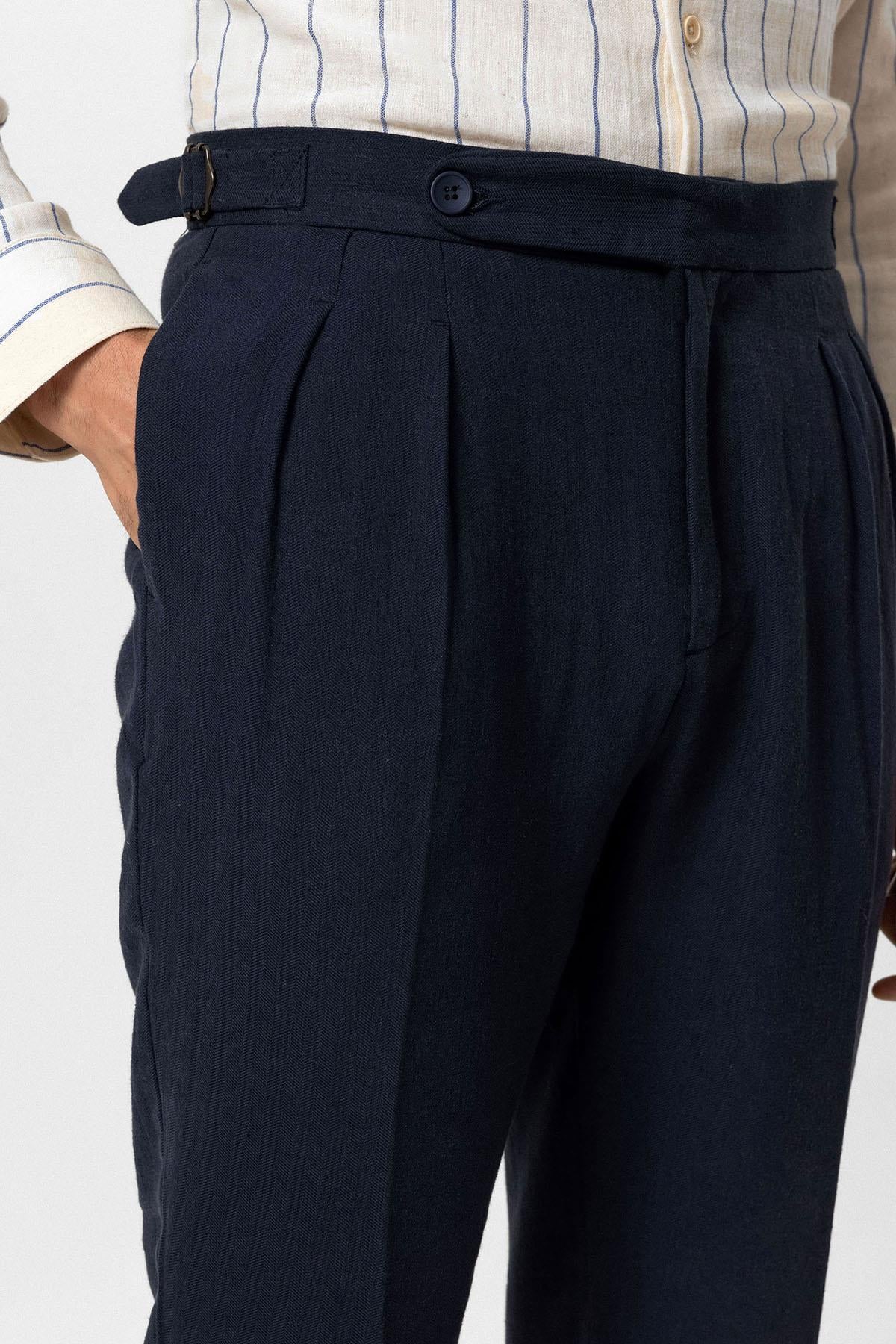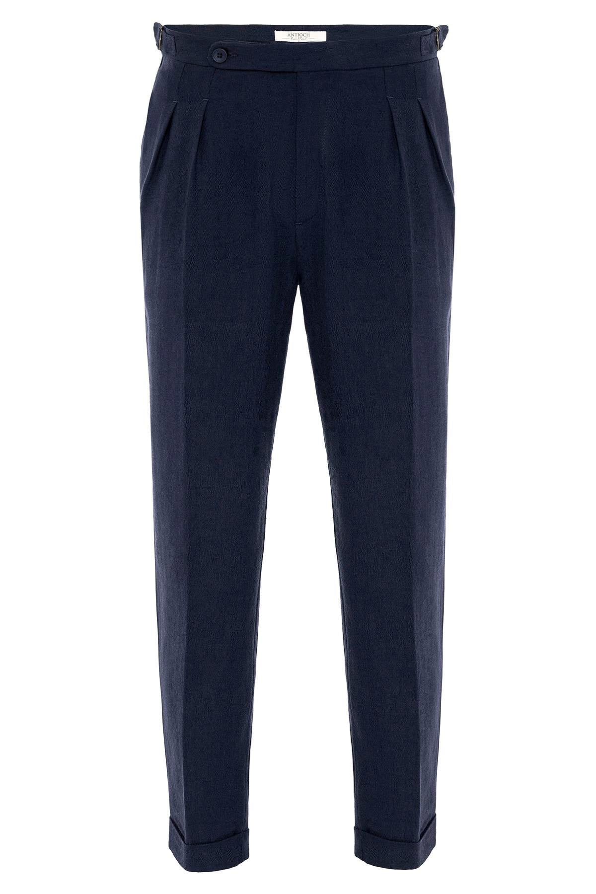 Lacivert Yüksek Bel Keten Karışımlı Duble Paça Erkek Pantolon
