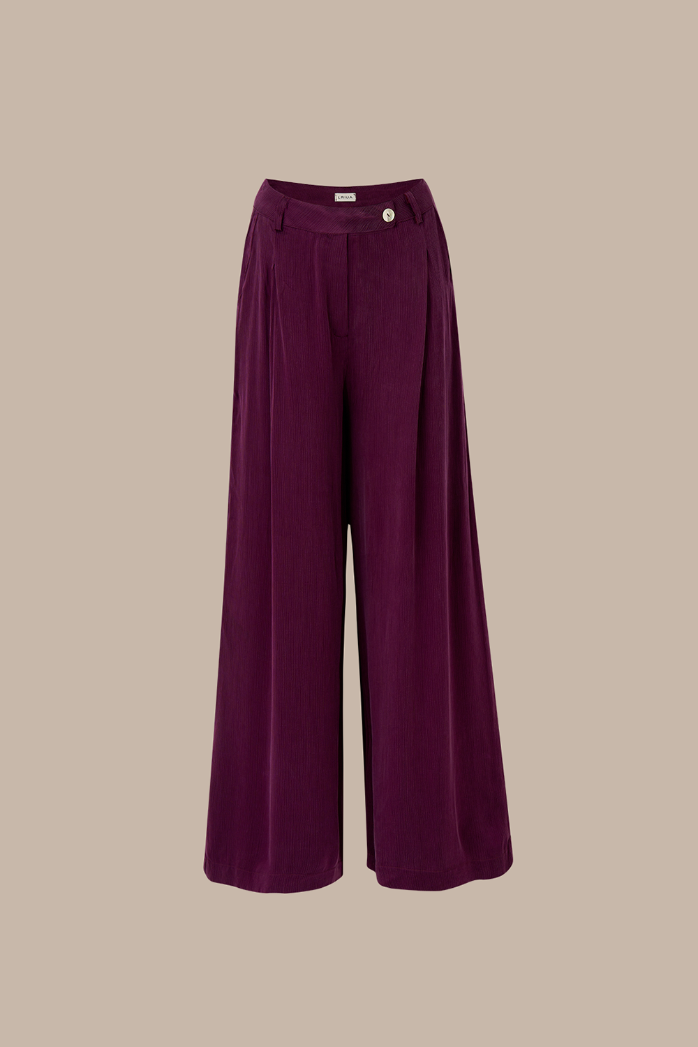 Yüksek bel ve bol paça kesimiyle rahat bir silüet sunan Theia pantolon, nefes alabilen yapısıyla konforlu bir kullanım sağlar. Ön kısmında iki cep ve sedef düğmeler bulunur. Sürdürülebilir vegan kumaştan üretilmiştir.