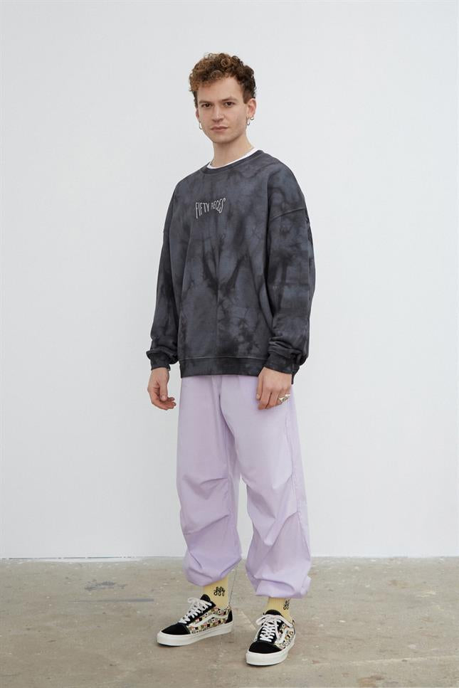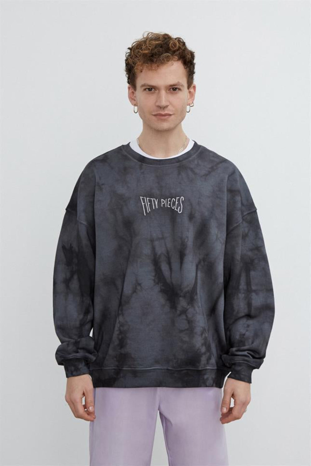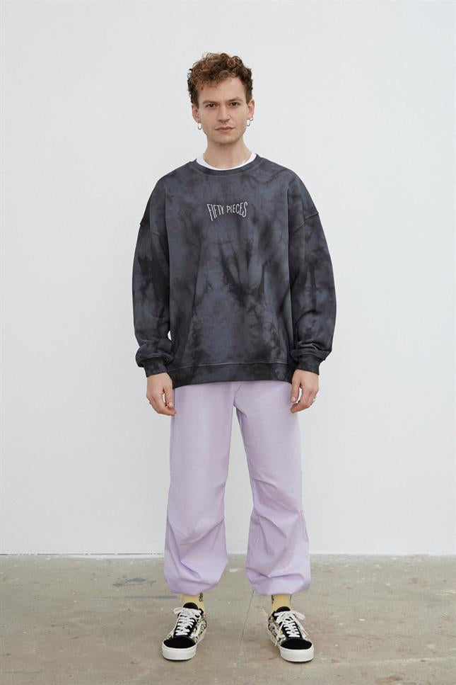 0-yakalı, göğsünde Fifty Pieces yazısı nakışlı, batik boyalı oversize sweatshirt. Tüm batik boyalı ürünlerimiz tek tek elle bağlanıp, elle boyanmaktadır. Bu nedenle ürünlerin her biri birbirinden az da olsa farklılık gösterir. El işçiliğinin güzel yanı da bizce budur.