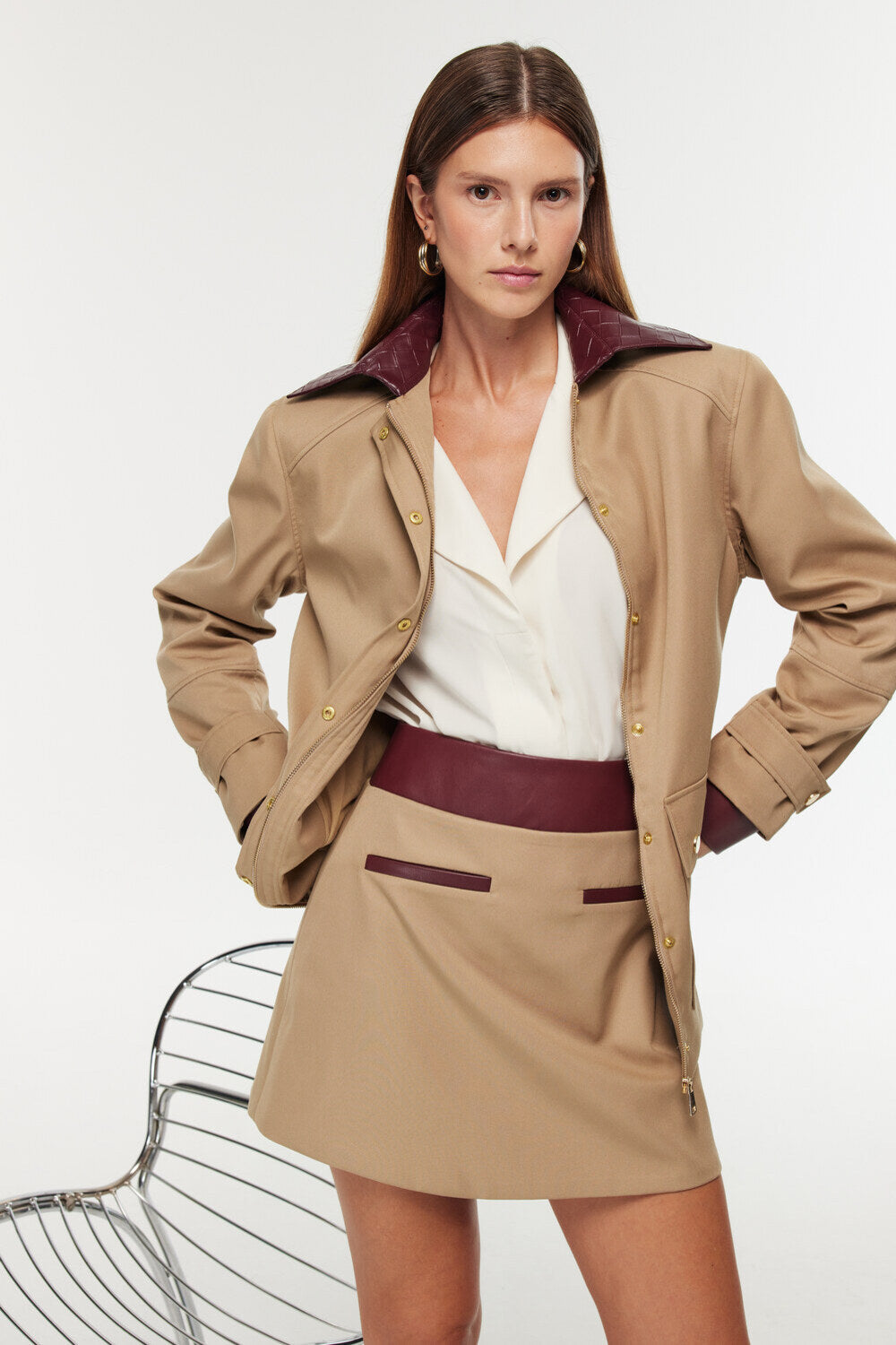 Ürün Bilgisi: Gabardin ve deri garni, A kesim, fileto cep detaylı mini etek.