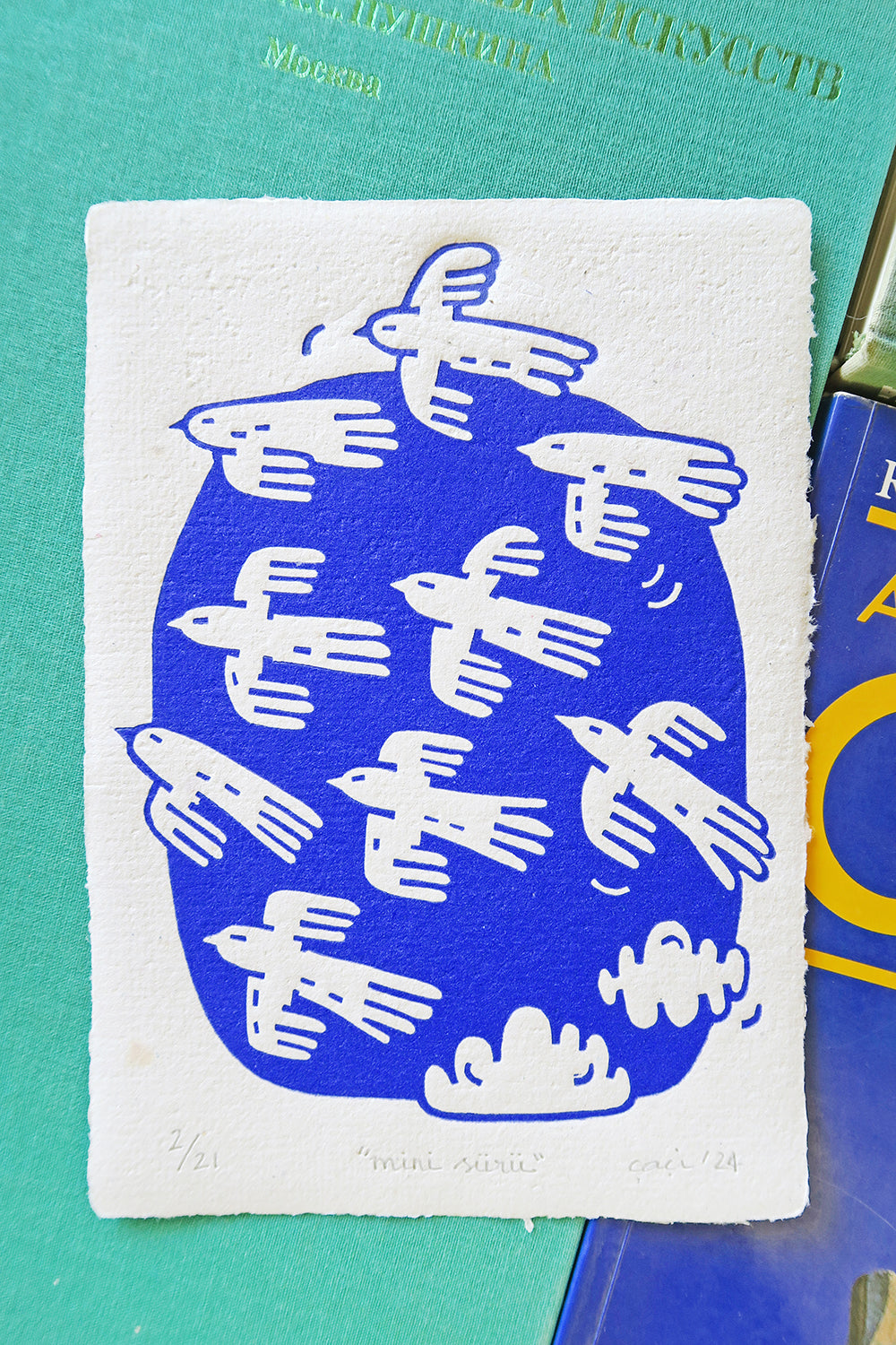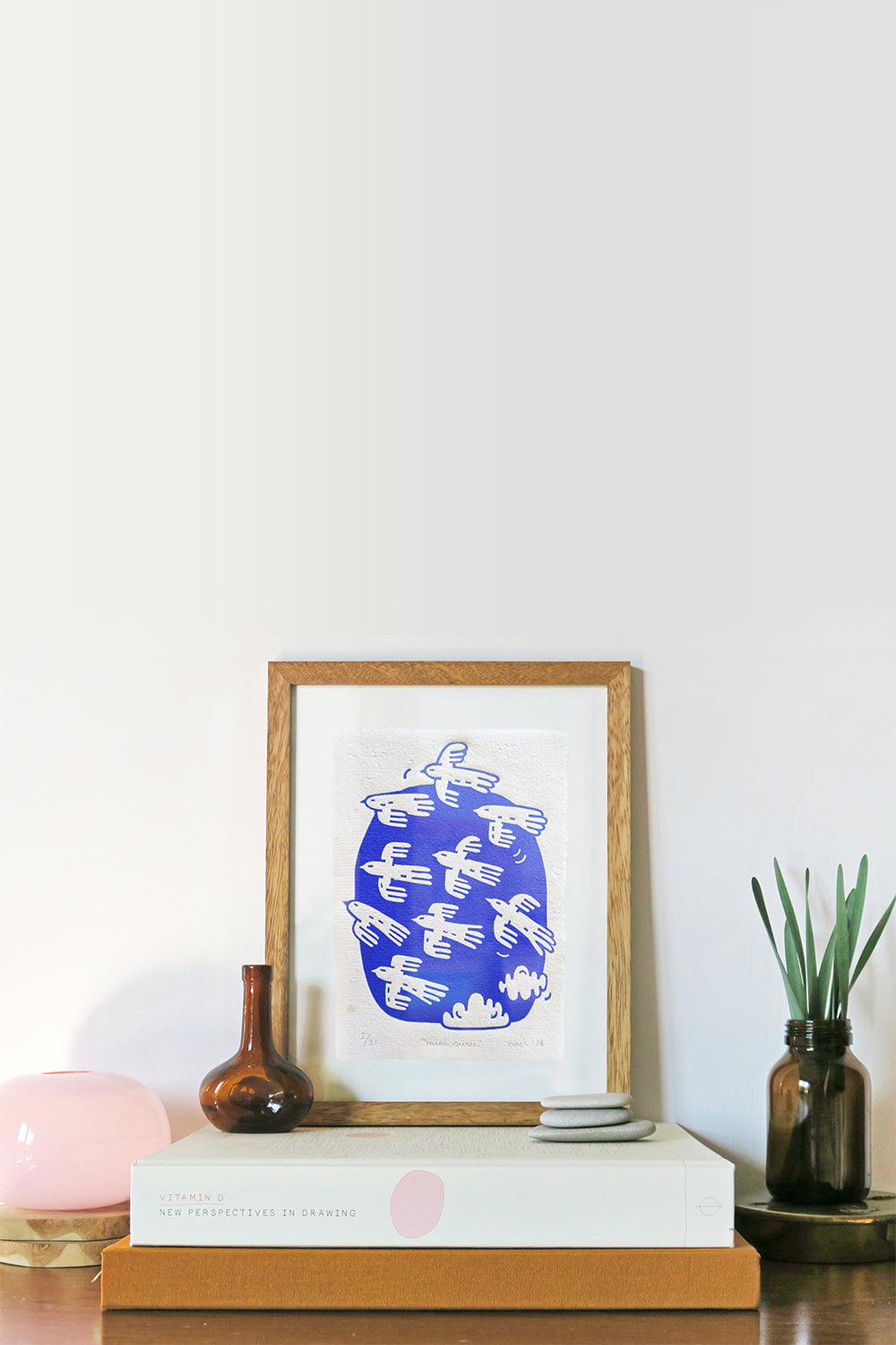 Kuşların zarif dansına duyduğumuz derin hayranlık, bu linol baskıyı yaratmamız için ilham kaynağı oldu. Sakinleştirici mavi tonlarının her odaya huzur katacağını düşünüyoruz. Bu eser, herhangi bir eve sakinlik ve huzur hissi getirecektir.