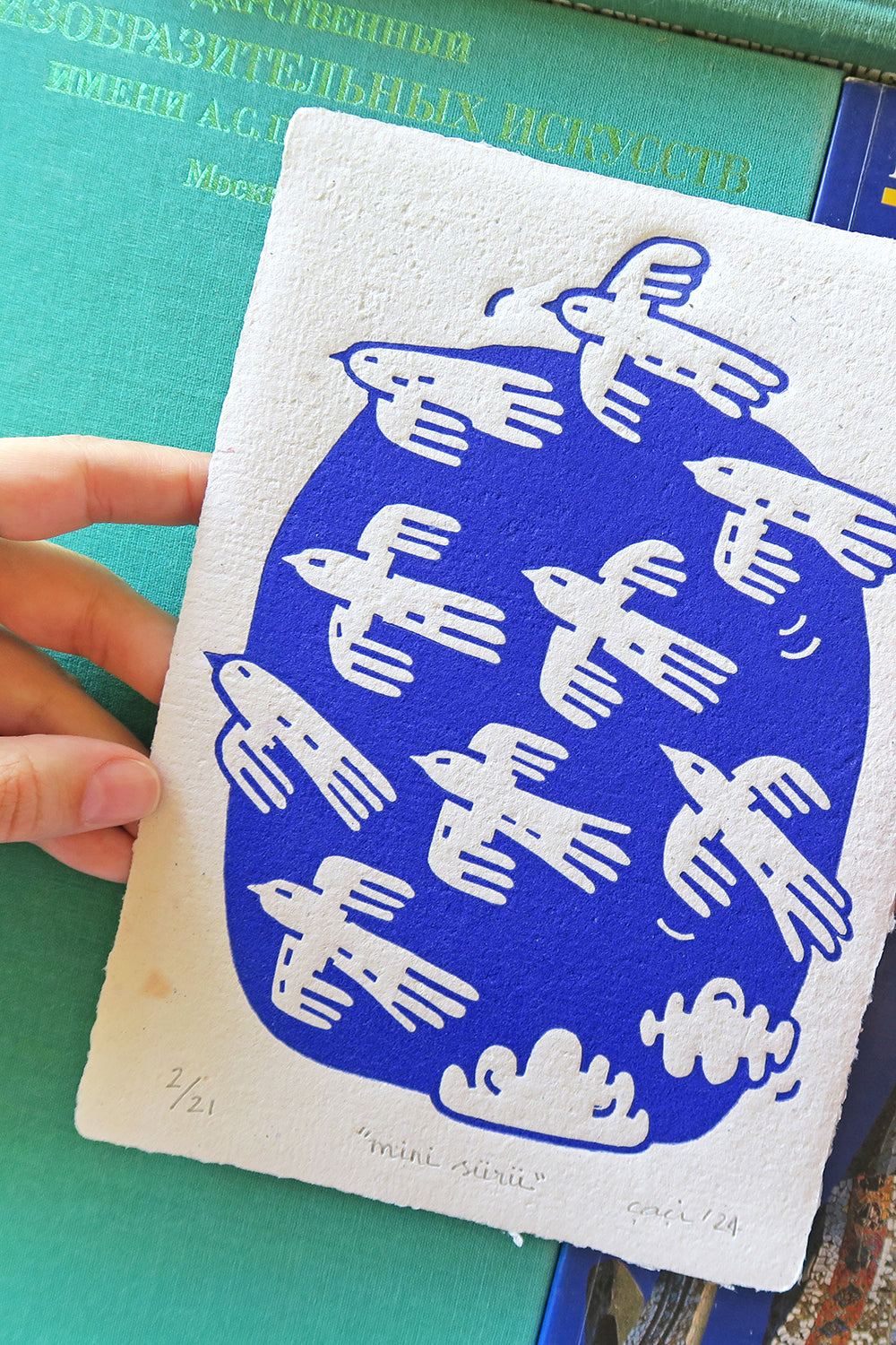 * Geri dönüştürülmüş el yapımı kağıt üzerine linol baskı.* 21 baskıdan oluşan sınırlı bir baskıdır.