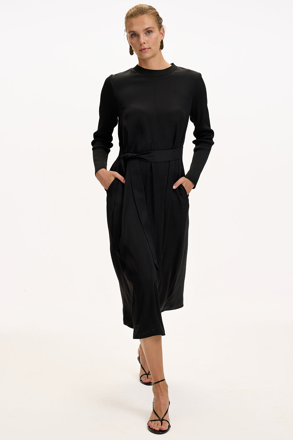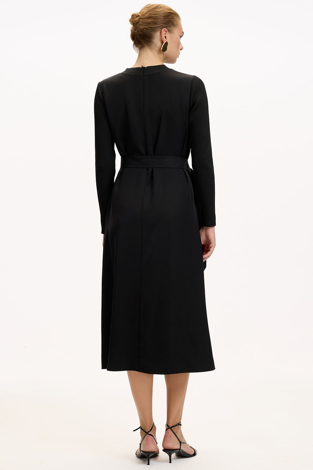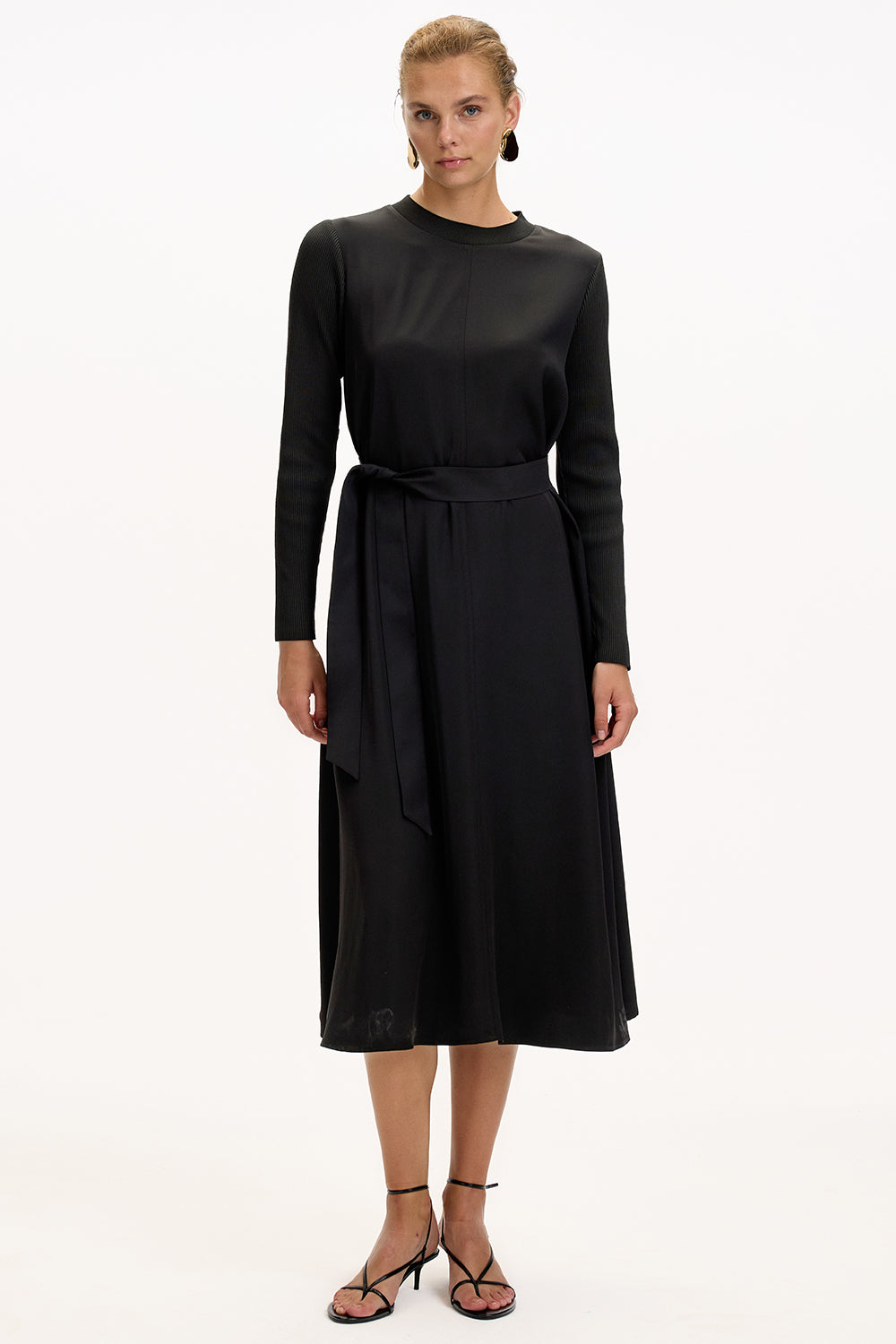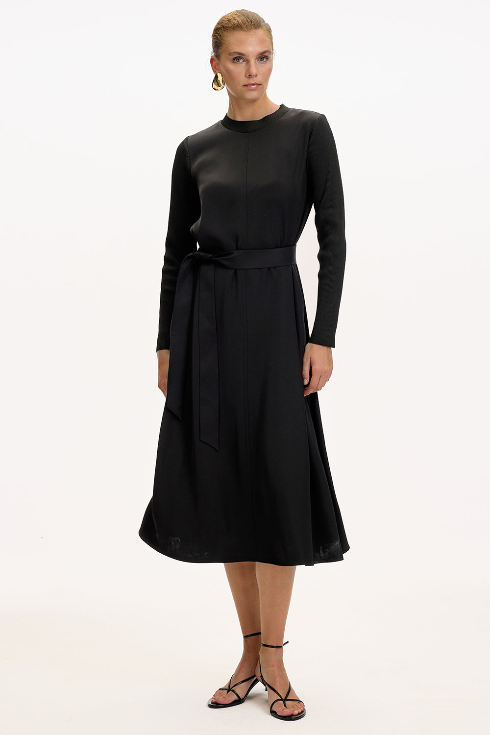 Bisiklet Yaka Uzun Kollu Kuşaklı Regular Siyah Midi Elbise