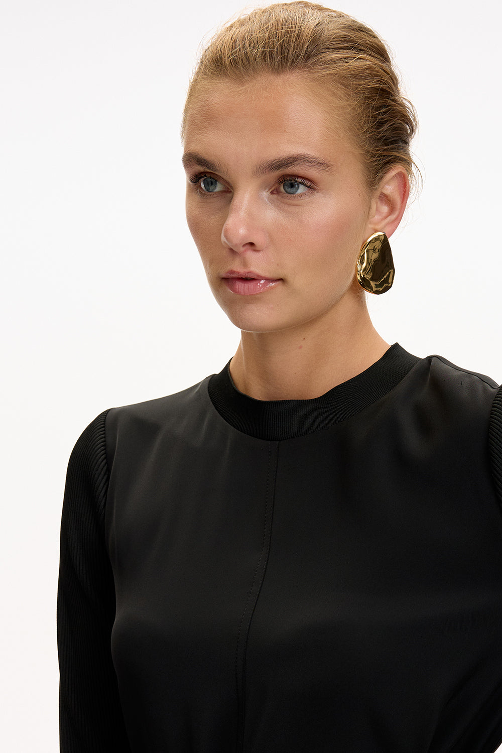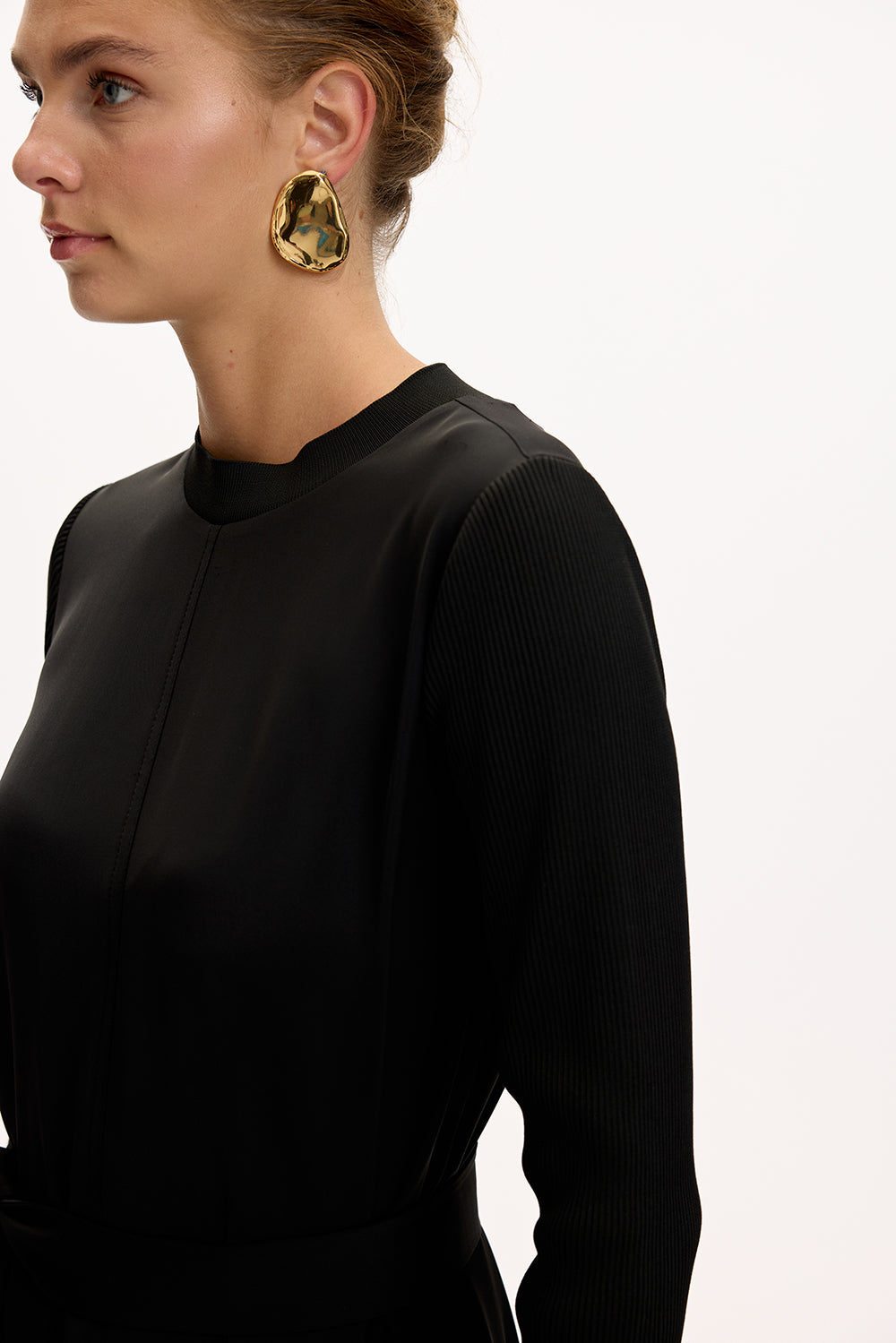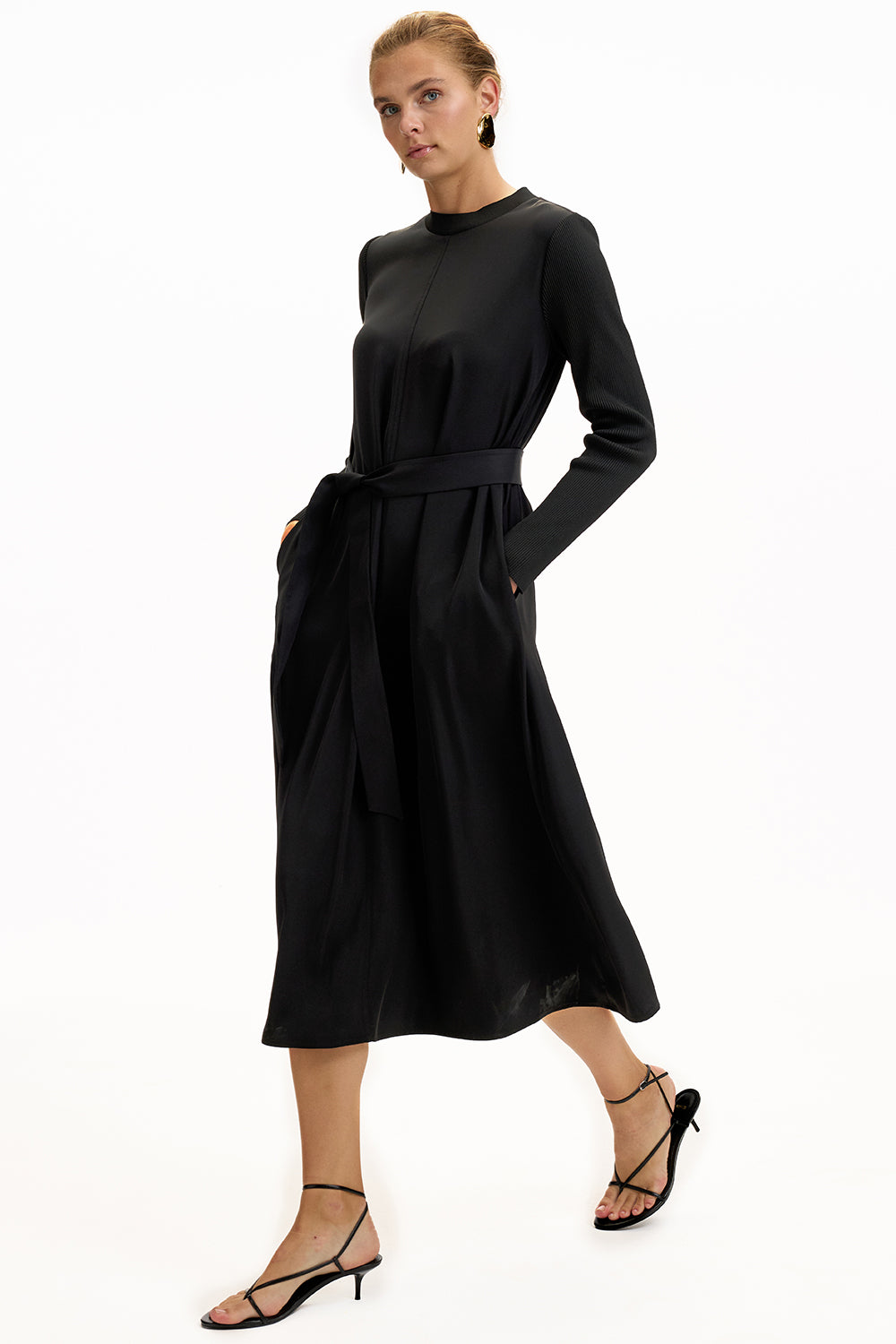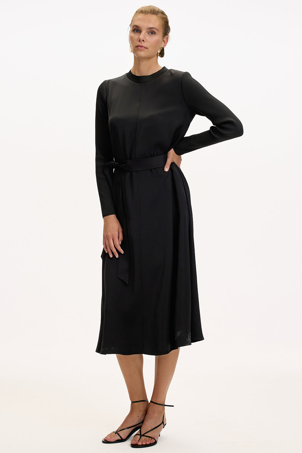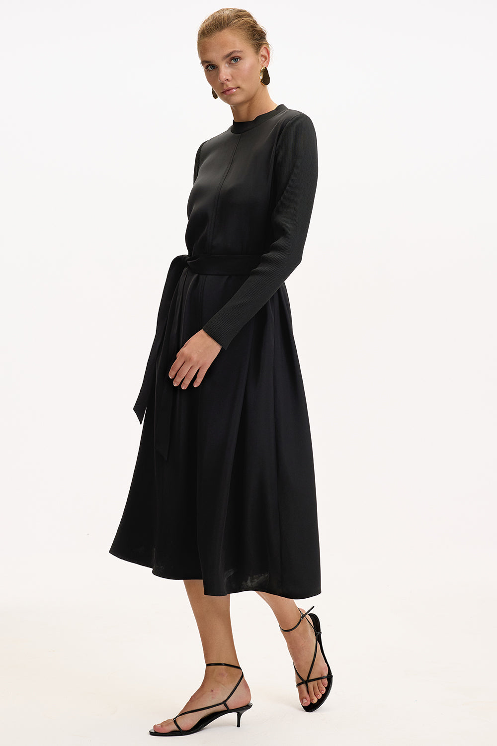 Bisiklet Yaka Uzun Kollu Kuşaklı Regular Siyah Midi Elbise