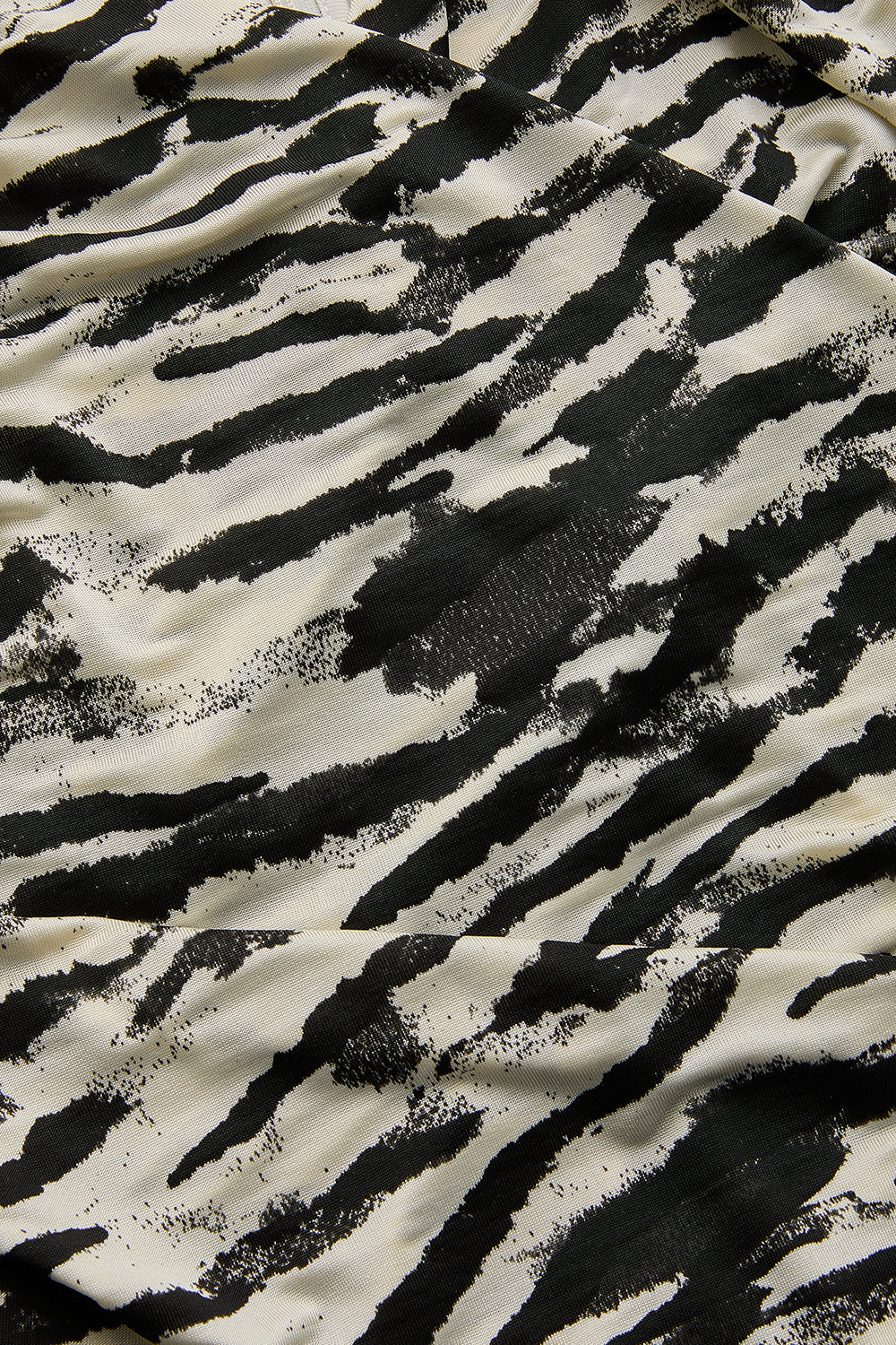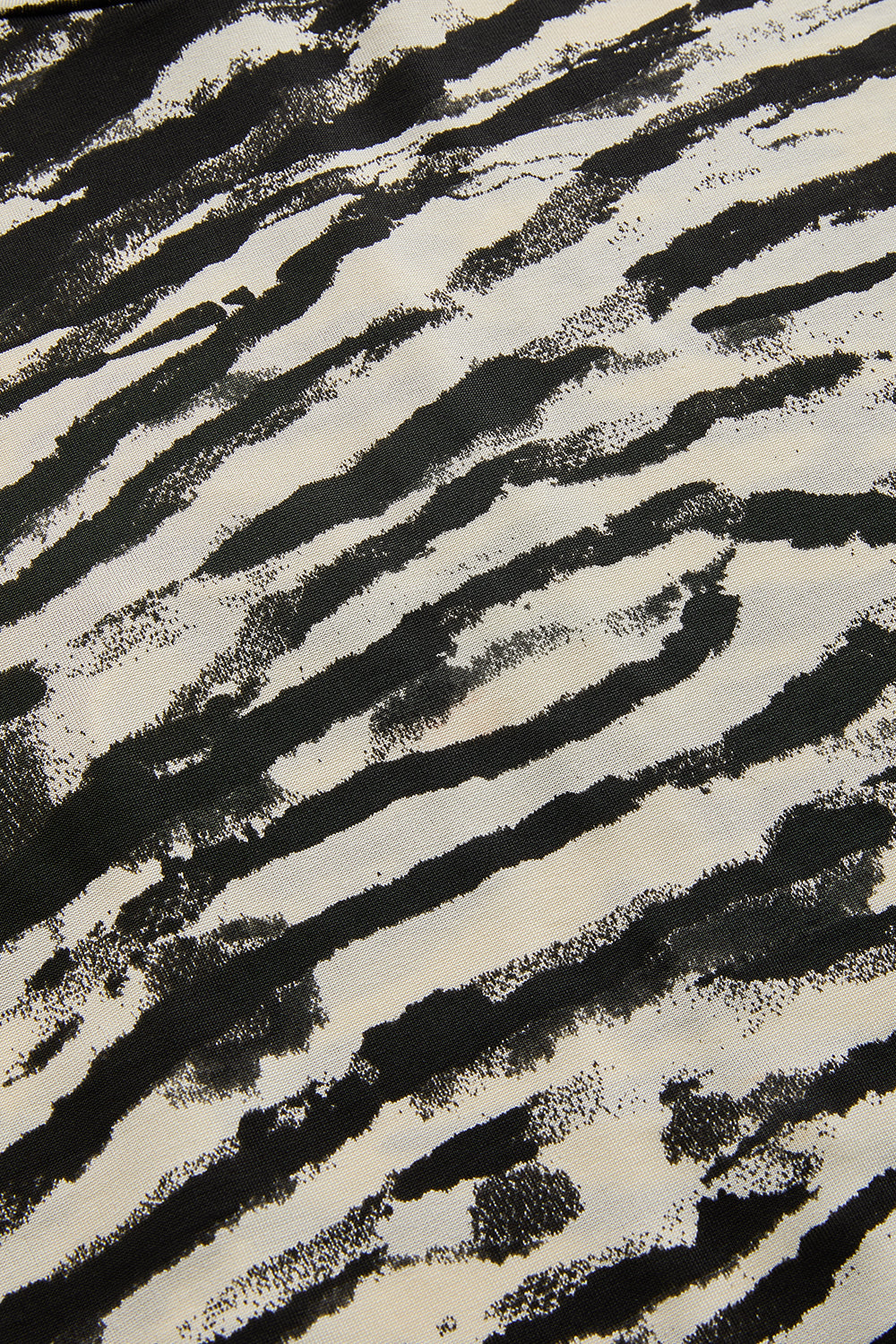 Zebra deseniyle enerjik bir duruş sergileyen bu slim fit örme bluz, boğazlı tasarımı ve esnek yapısıyla hem şık hem de rahat bir kullanım sunar; kontrast tonları sayesinde jean ile gündüz, etek veya ceketle ise akşam stilinize modern bir dinamizm katar.