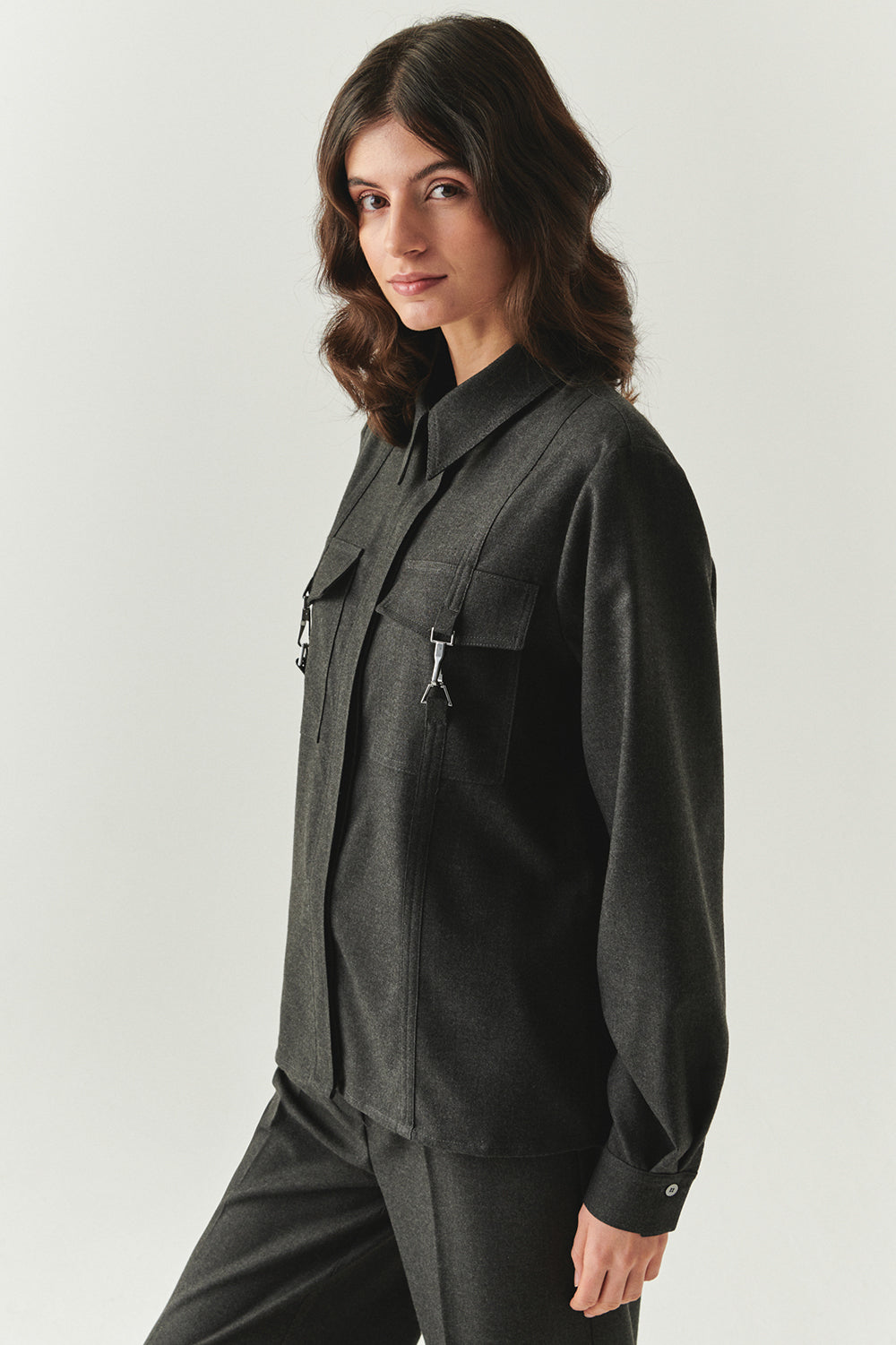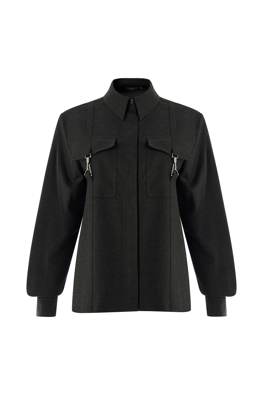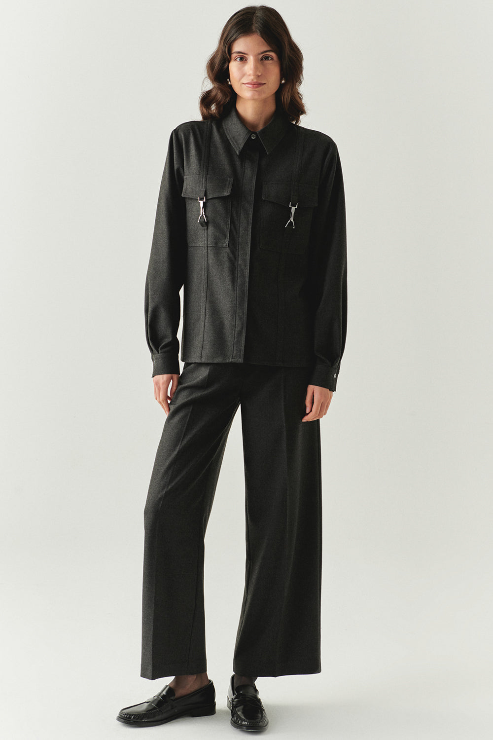 Cepleri Aksesuarlı Uzun Kol Regular Dokuma Gri Gömlek