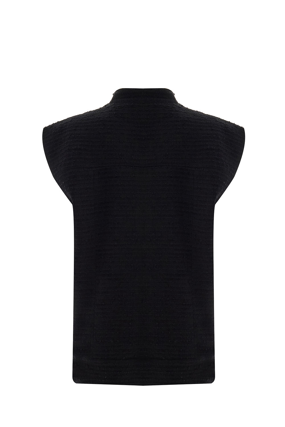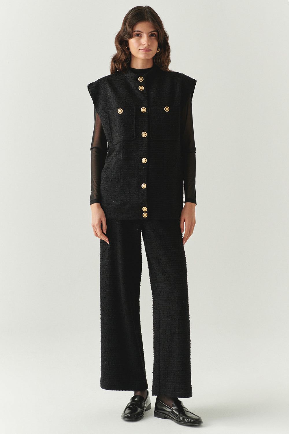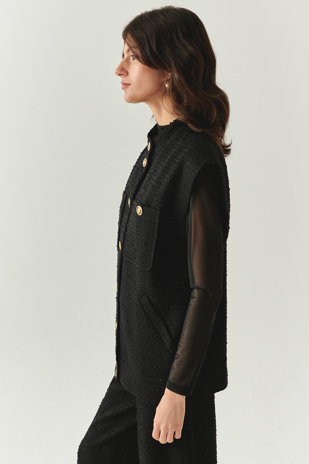 Düğme Detaylı Cepli Regular Dokuma Siyah Yelek