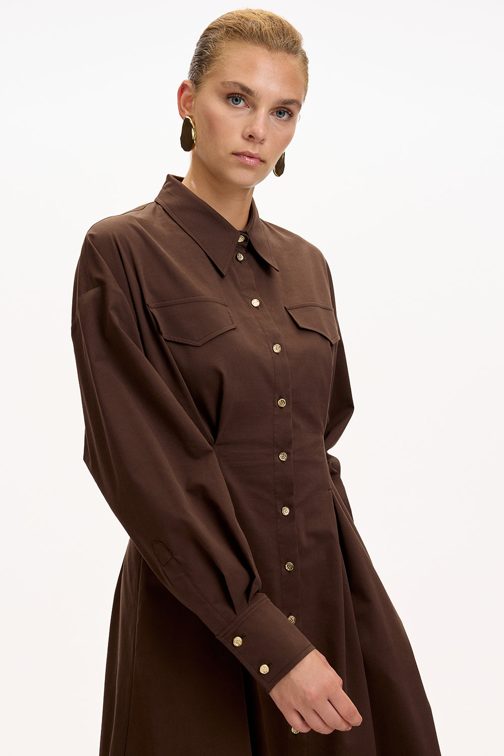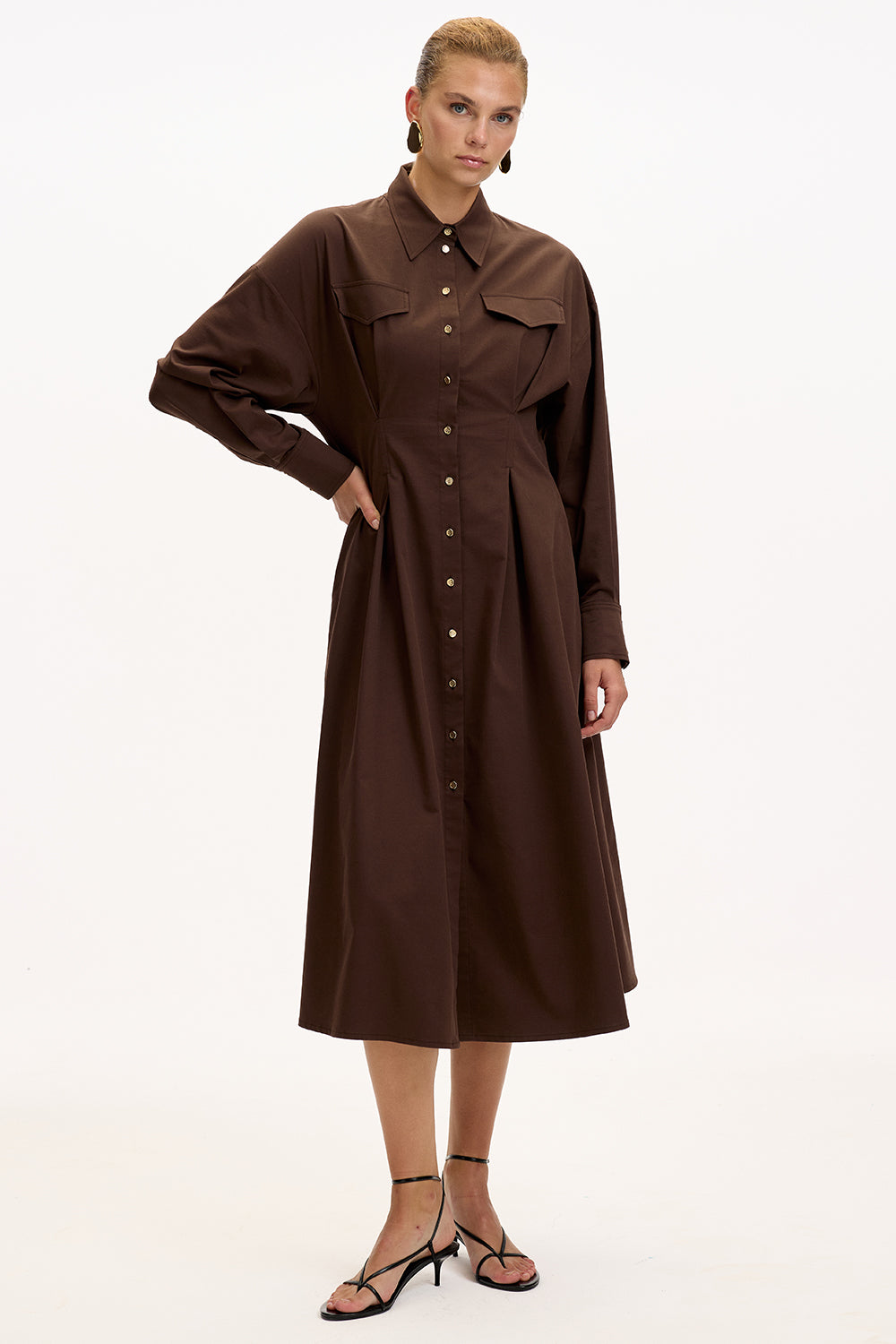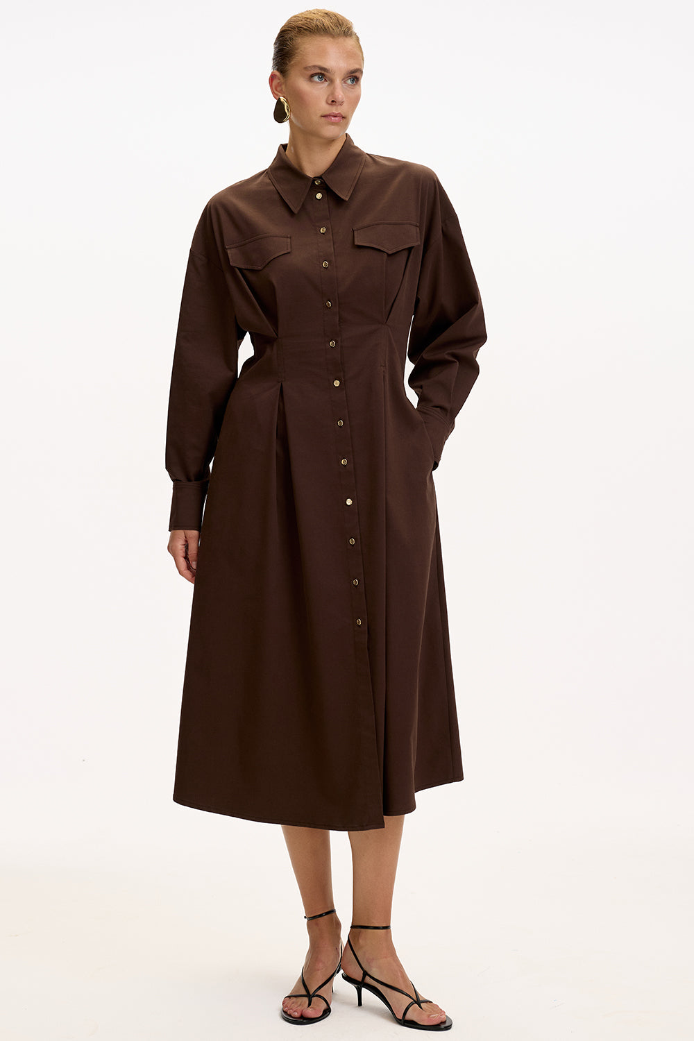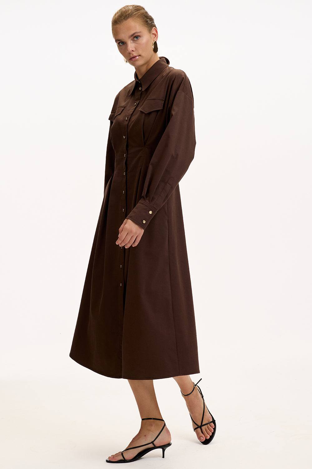 Gömlek Yaka Uzun Kollu Cepli Regular Düğmeli Kahve Midi Elbise