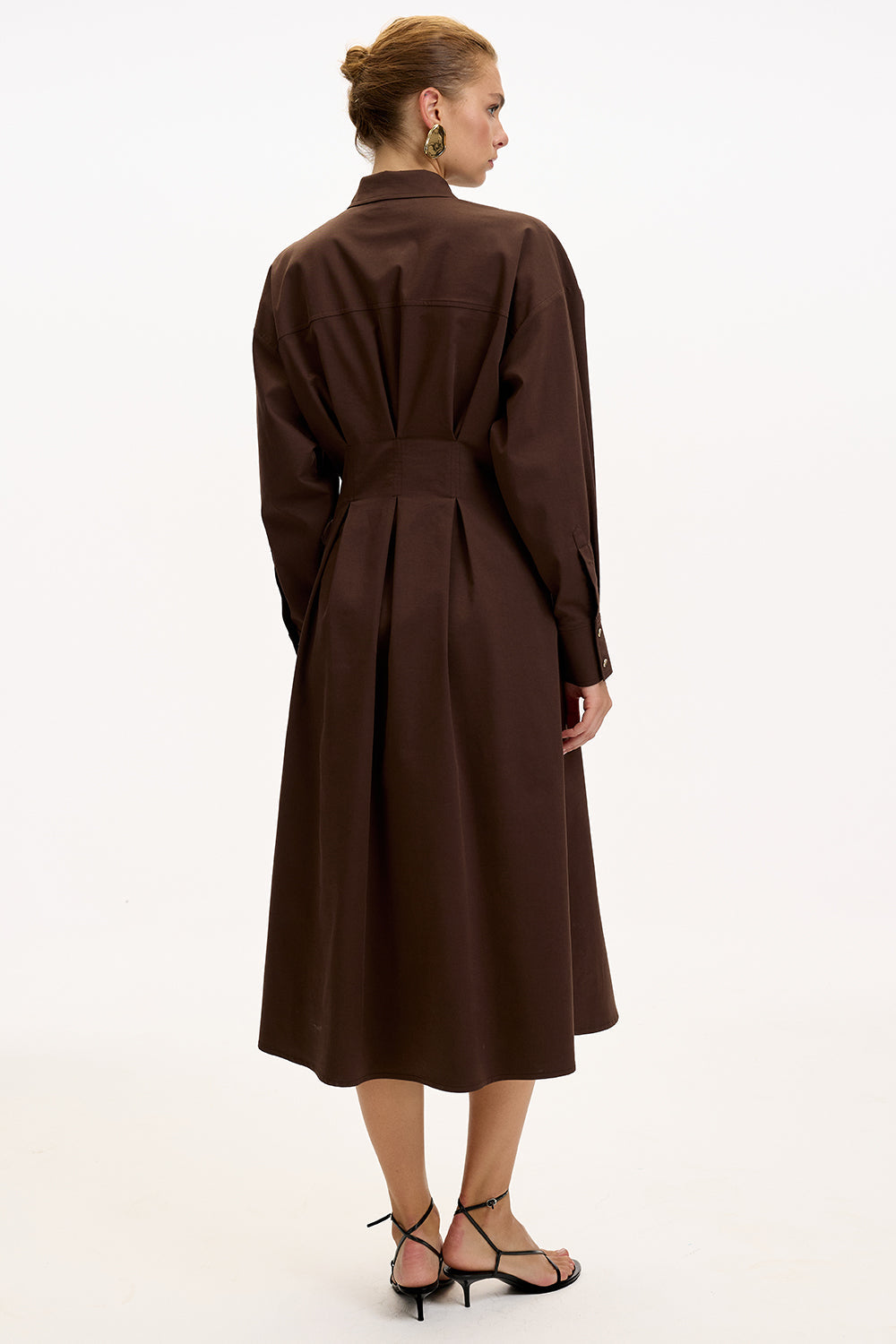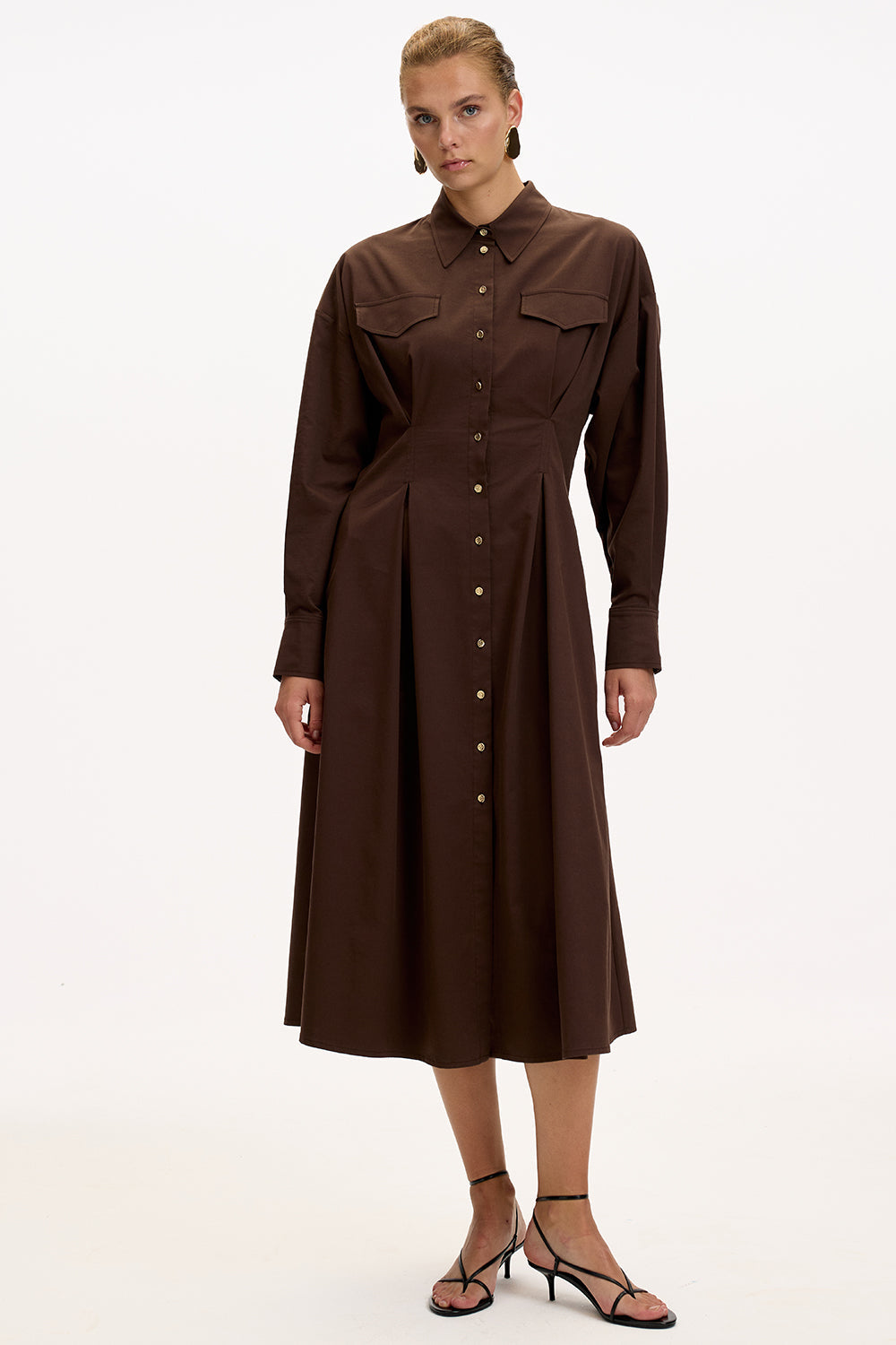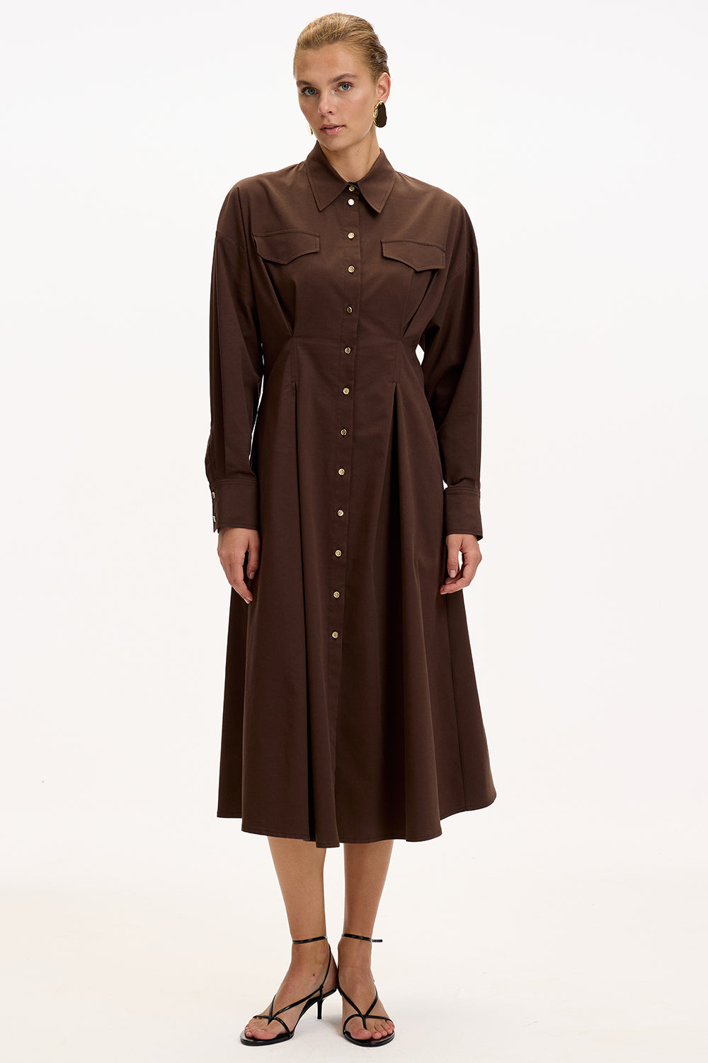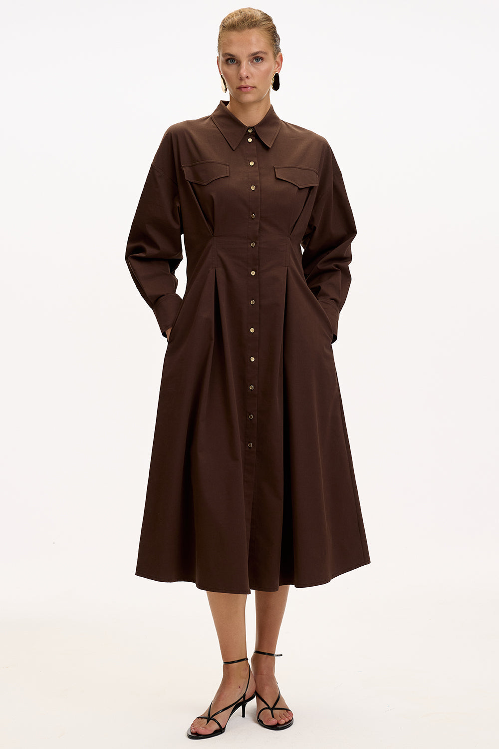 Gömlek Yaka Uzun Kollu Cepli Regular Düğmeli Kahve Midi Elbise
