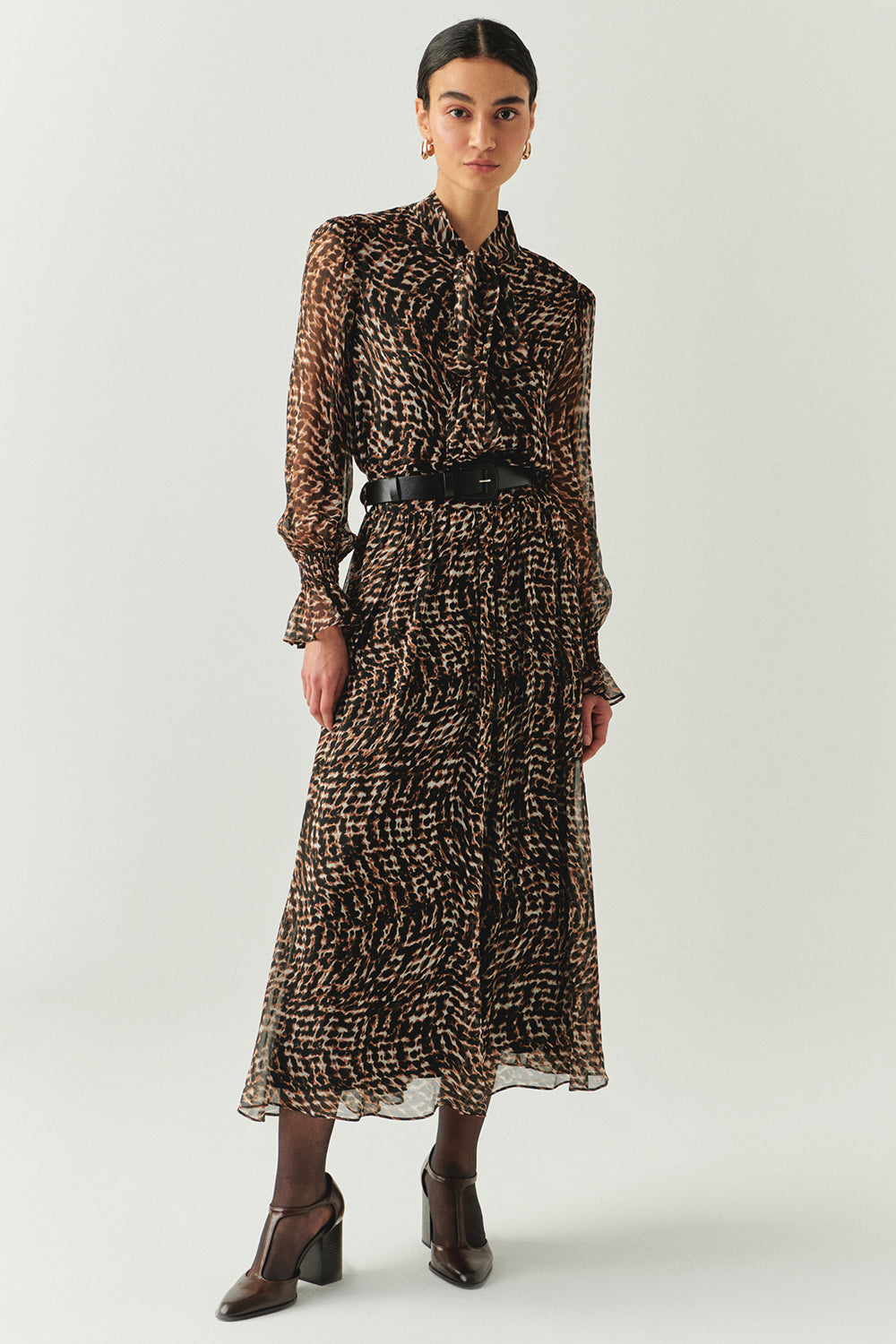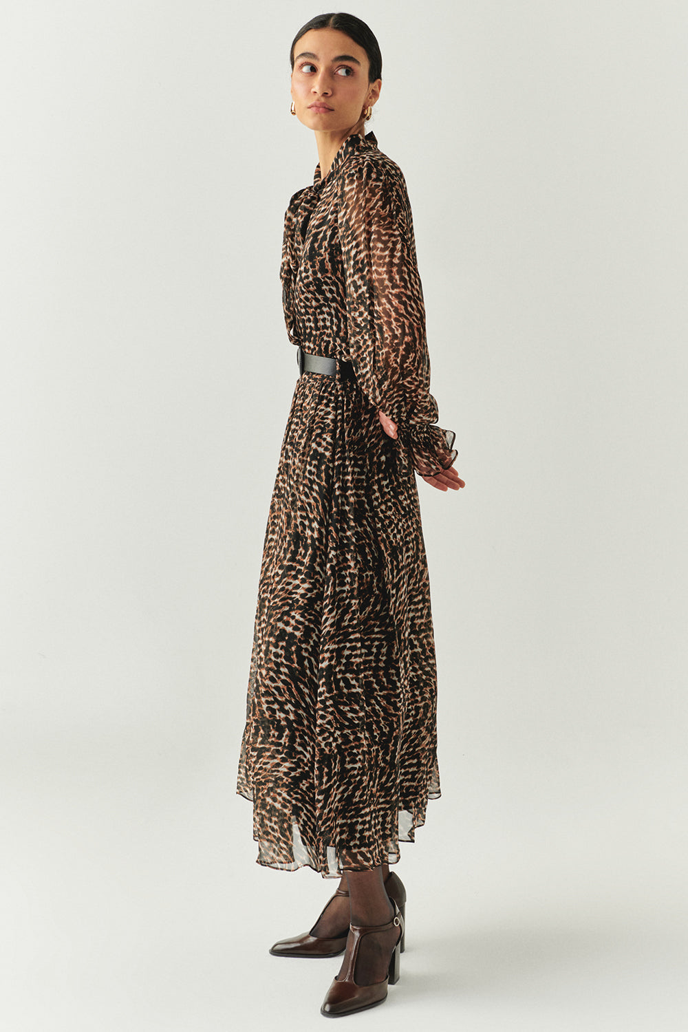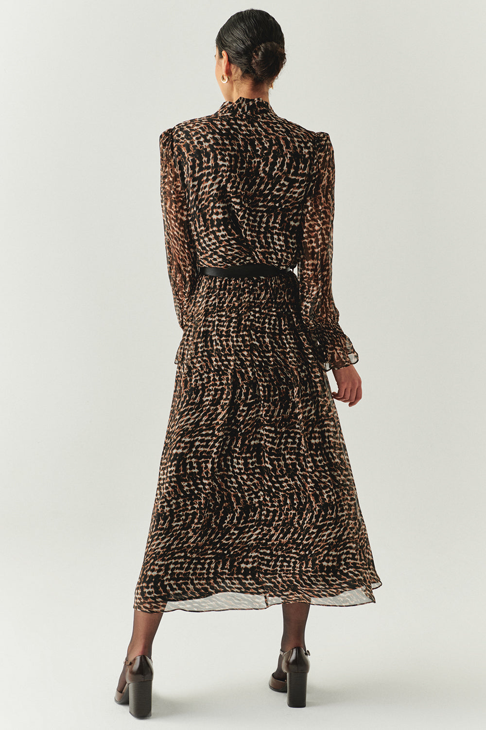 Leopar desenin enerjisini ve dinamizmini yansıtan bu midi elbise, astarlı yapısı ve şık kemer detayıyla modern bir siluet oluşturur. Regular fit kesimi sayesinde konforlu bir kullanım sunarken, uzun kolları ve midi boyu ile mevsim geçişlerinde ideal bir tercihtir. Günlük şehir stilinde topuklu çizmelerle, özel davetlerde ise zarif stiletto ve minimal aksesuarlarla kolayca kombinlenebilir.