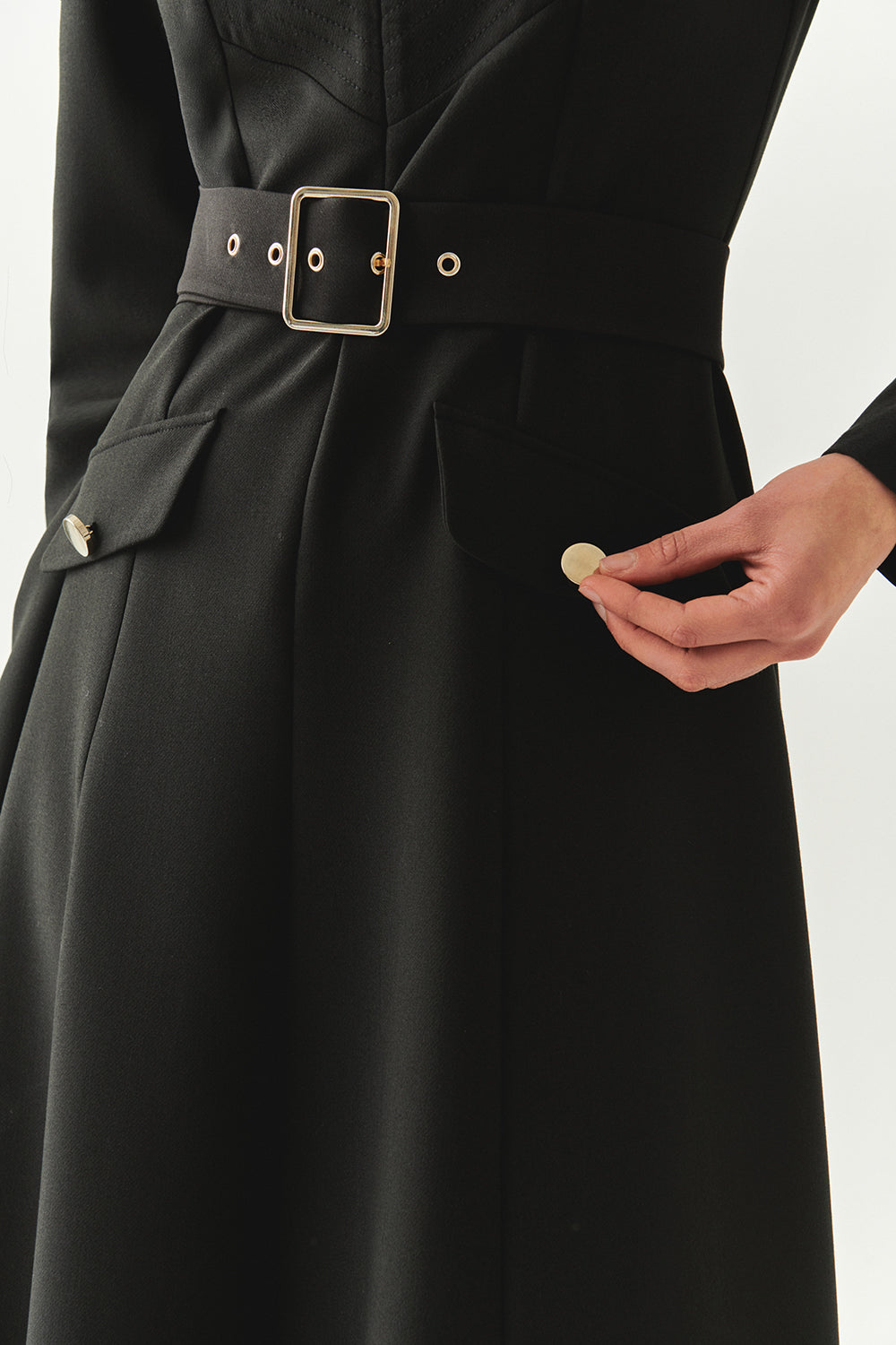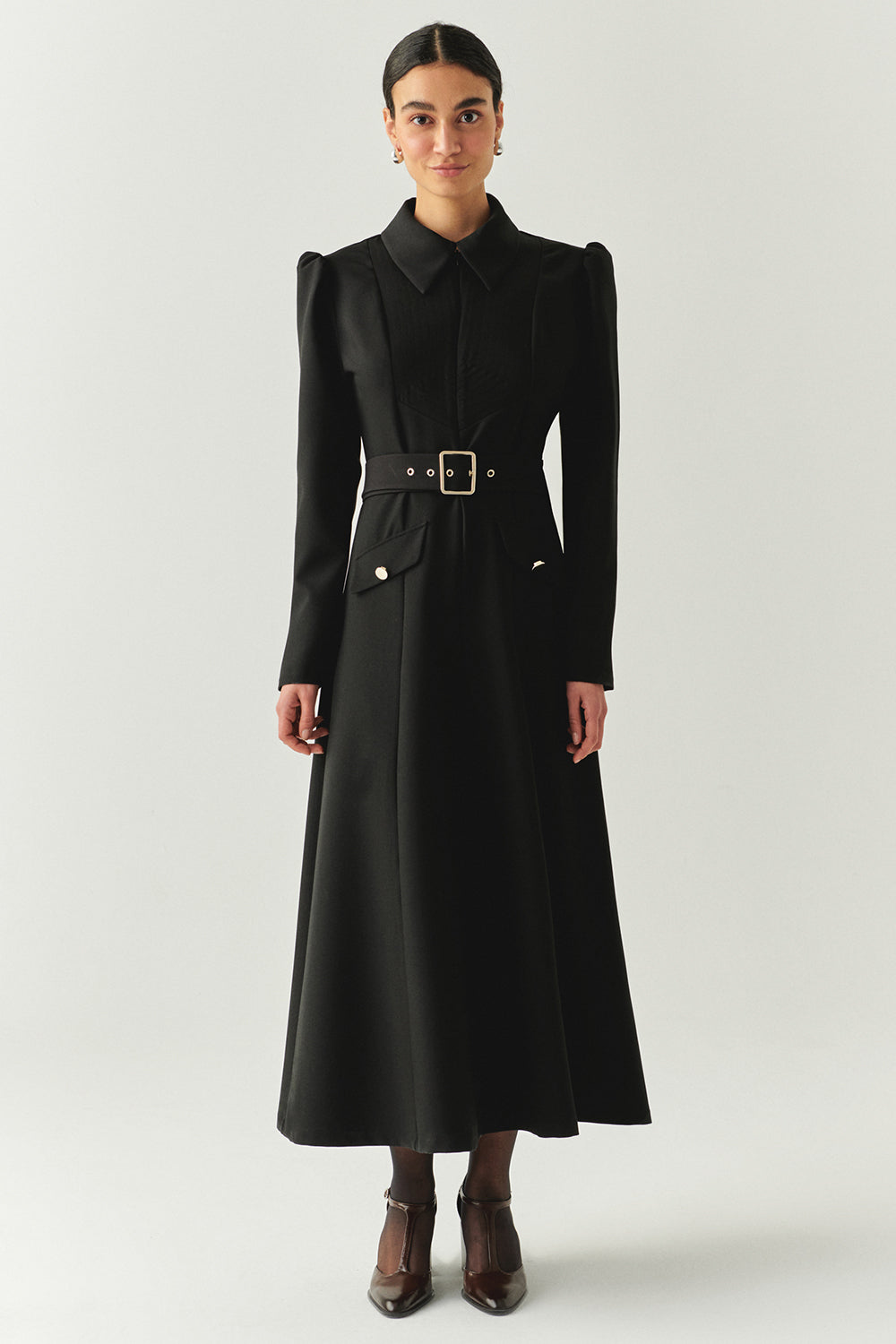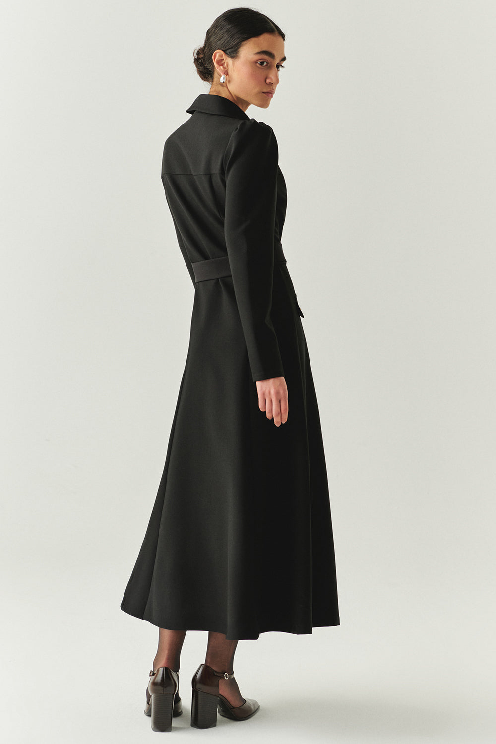 Önden Fermuarlı Kemerli Uzun Kol Slim Fit Siyah Midi Elbise