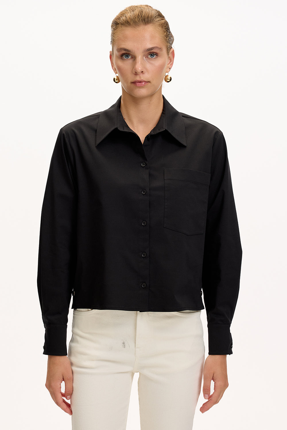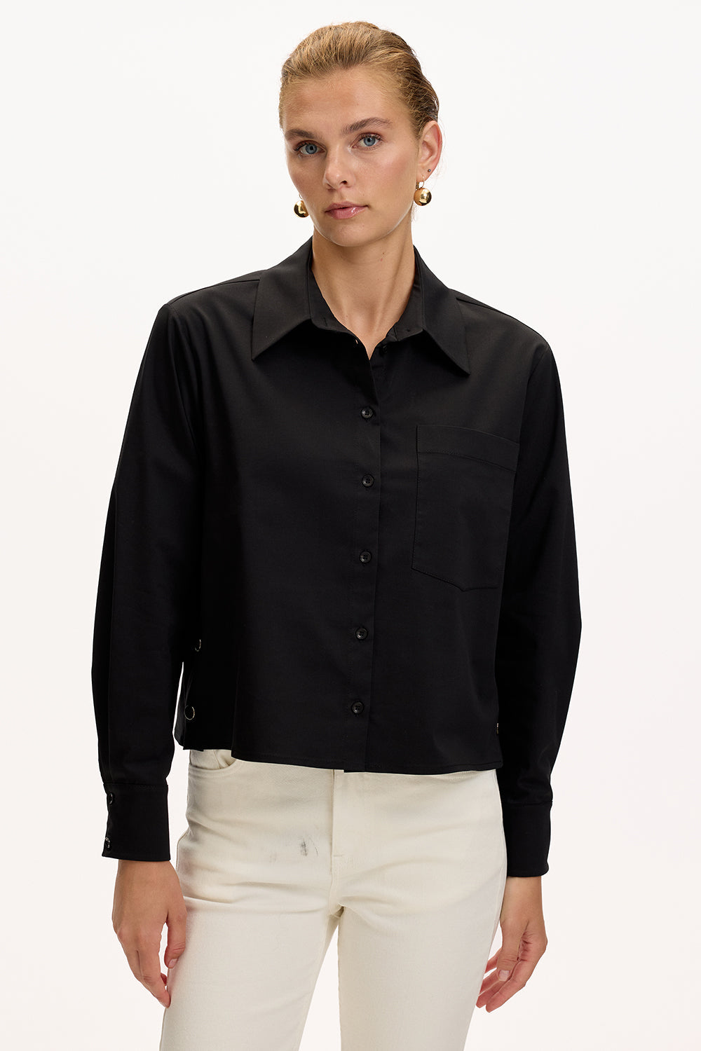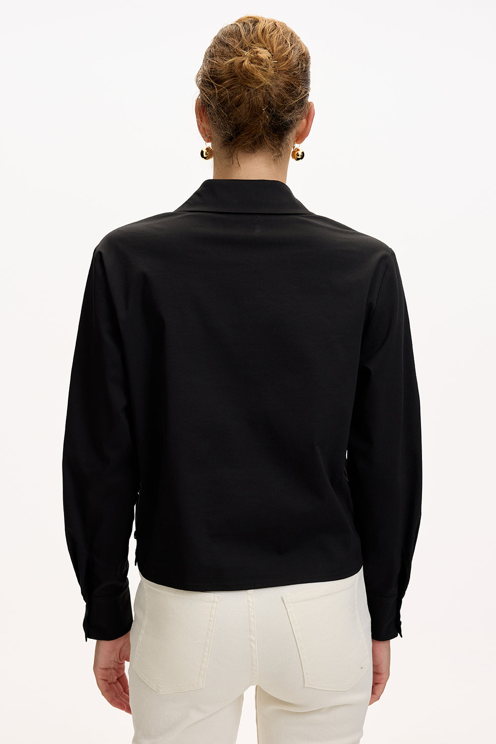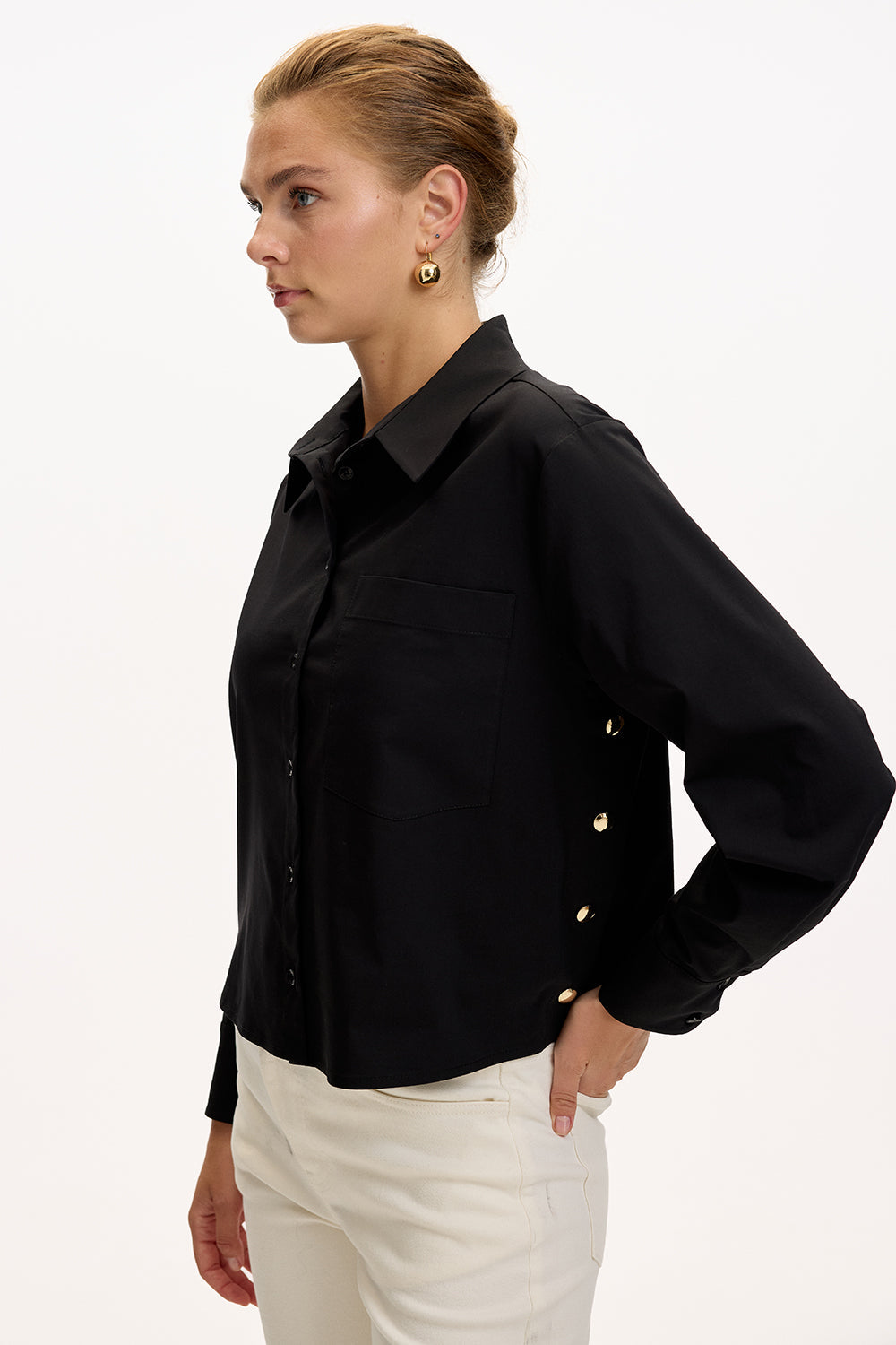 Yumuşacık dokusu ve rahat kesimiyle bu beyaz gömlek, dolabınızın her an kurtarıcı parçası olacak. Yan dikişlerdeki altın çıtçıtlar, sade görünümüne zarif bir ışıltı katıyor. İster desenli bir midi etekle feminen bir hava yaratın, ister kumaş pantolonla ofis şıklığını yakalayın… Soğuk kış günlerinde üzerine oversize bir kazak atarak da kullanabilirsiniz. Her kombinle uyum sağlayan bu parça, gün boyu stilinizi zahmetsizce tamamlayacak.