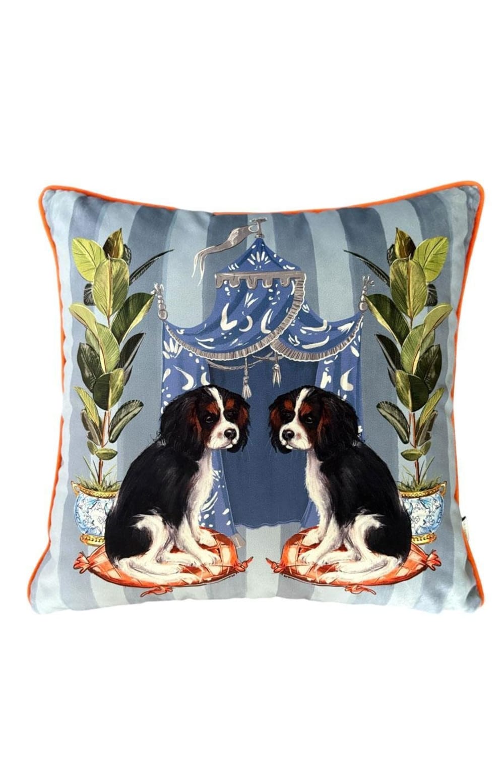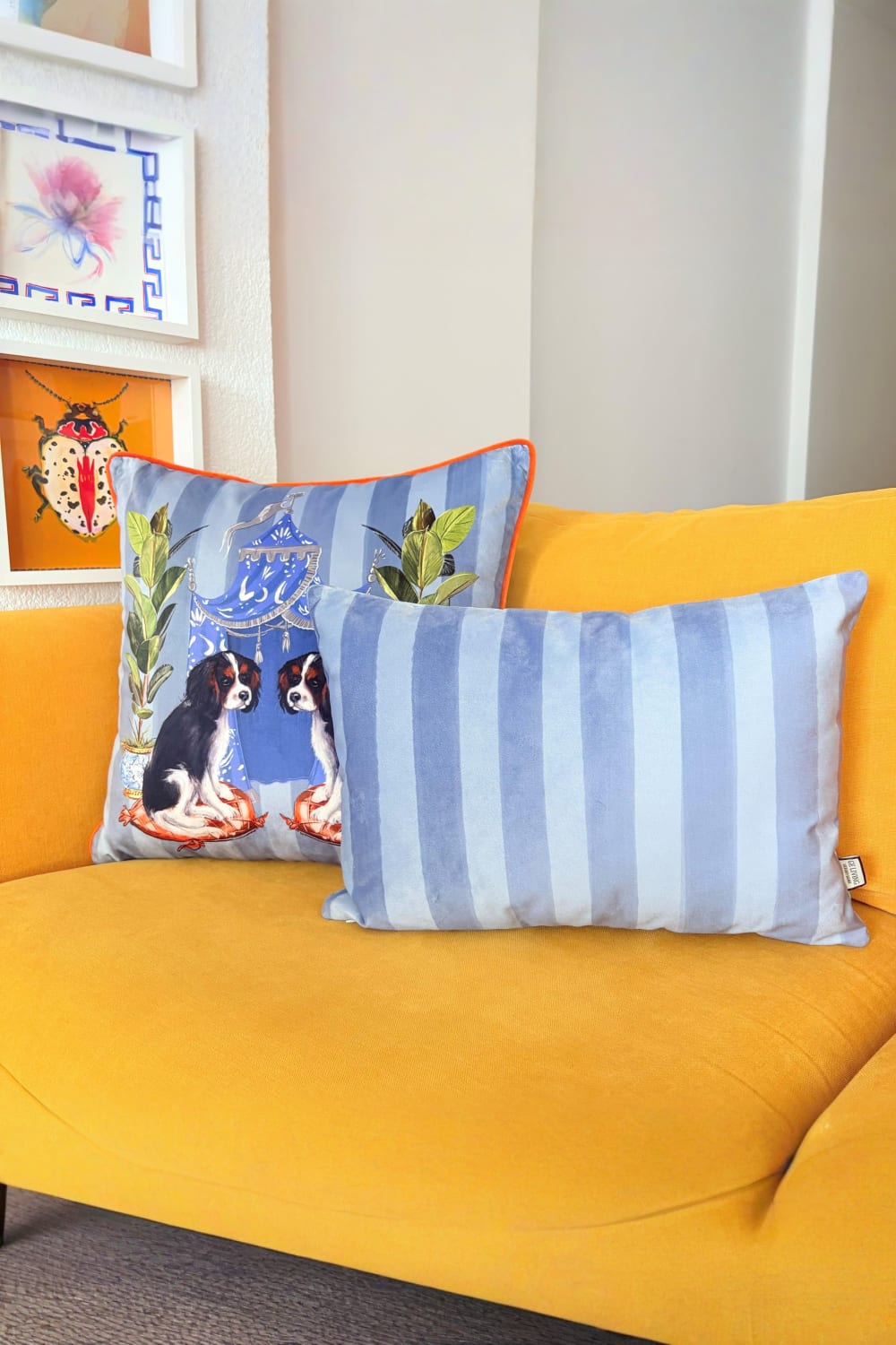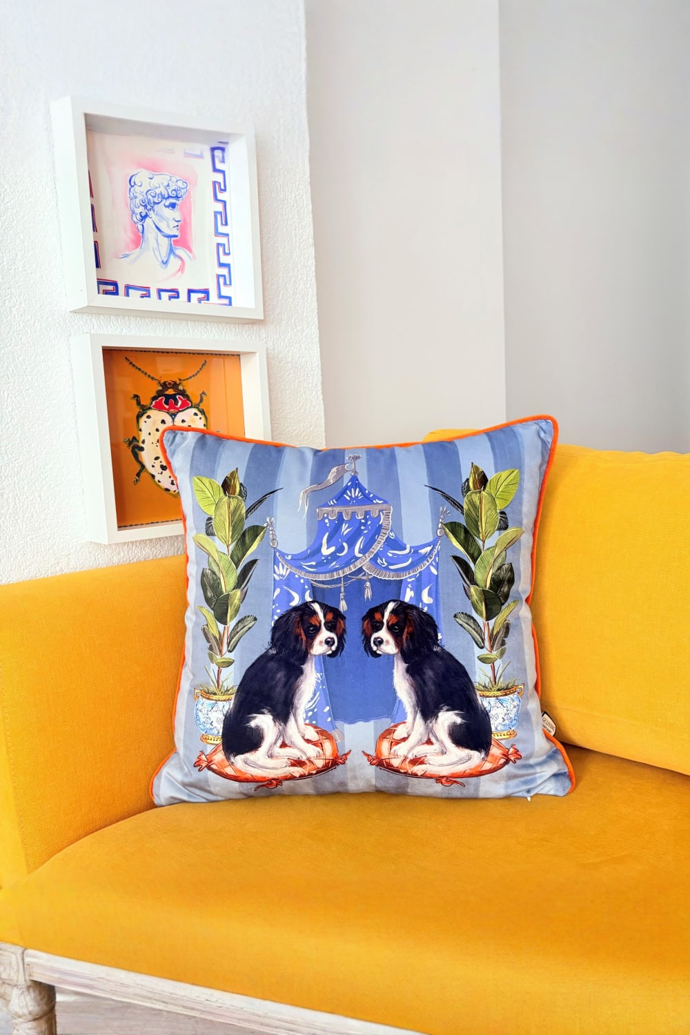 King Charles Köpek Deseli Gri Çizgili Kadife Kırlent Kılıfı - Vaha Serisi
