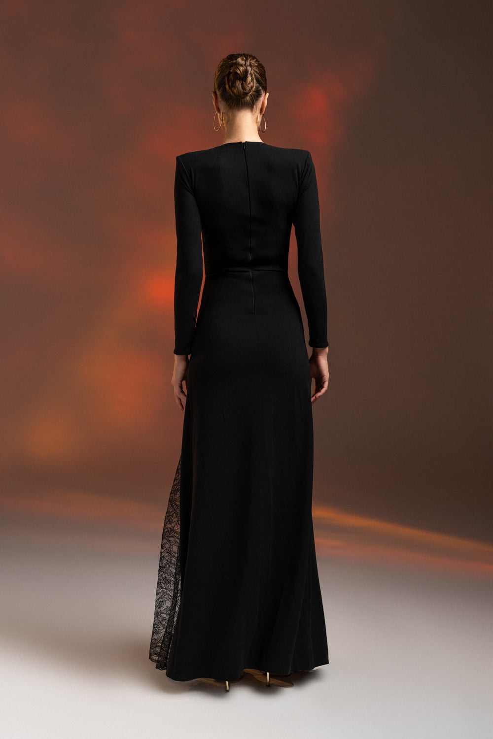 Siyah Dantel Yırtmaç Detaylı Uzun Elbise